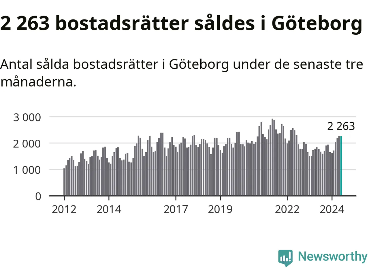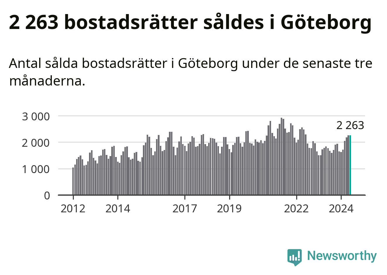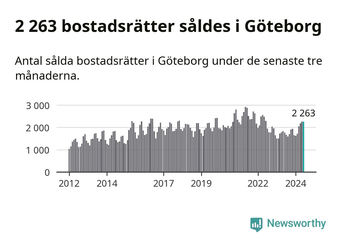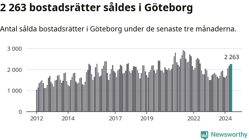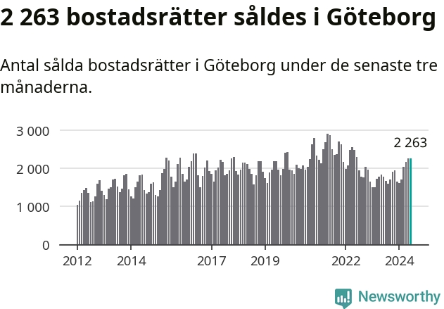 Sammanlagt såldes 2 263 bostadsrätter i Göteborgs kommun mellan april och juni till ett genomsnittligt pris på 3,3 miljoner kronor. I fjol gjordes 1 776 affärer vid den här tiden på året.
