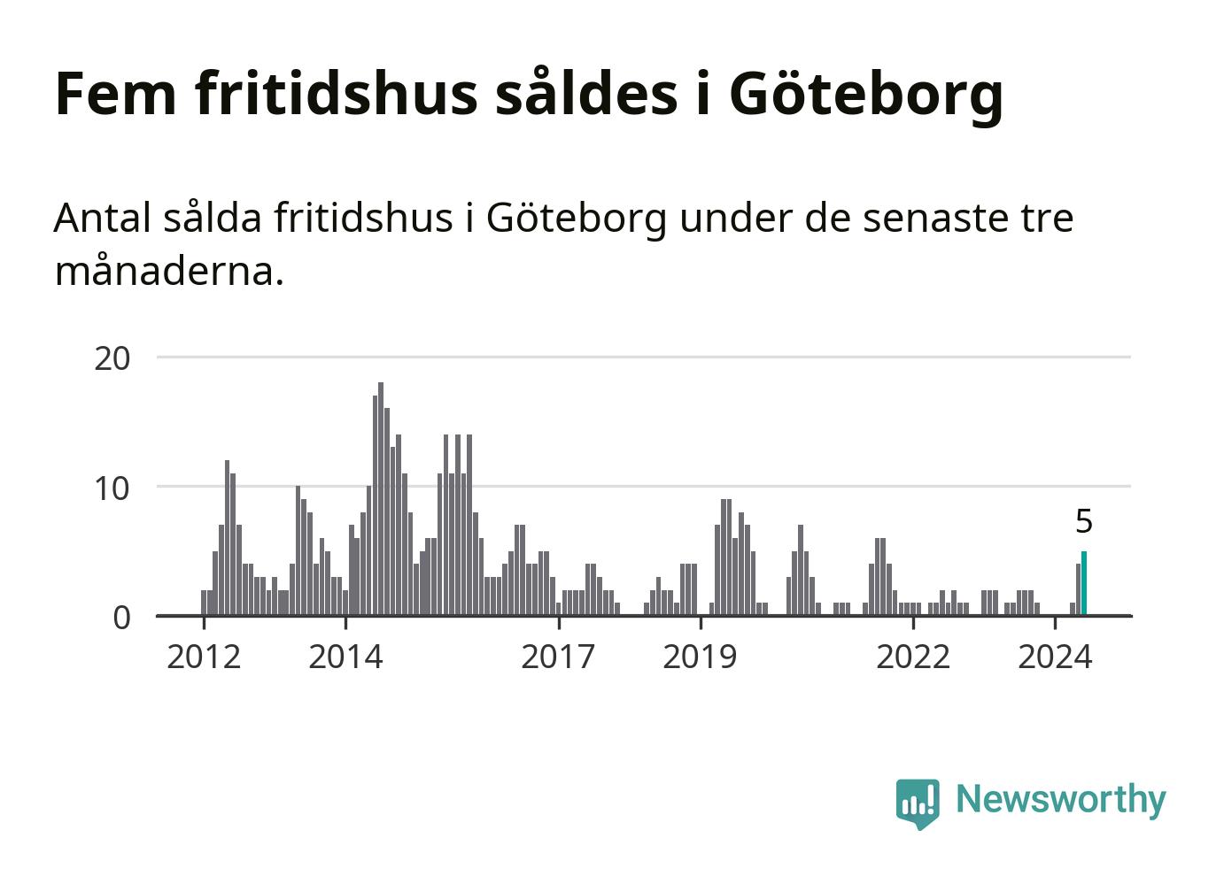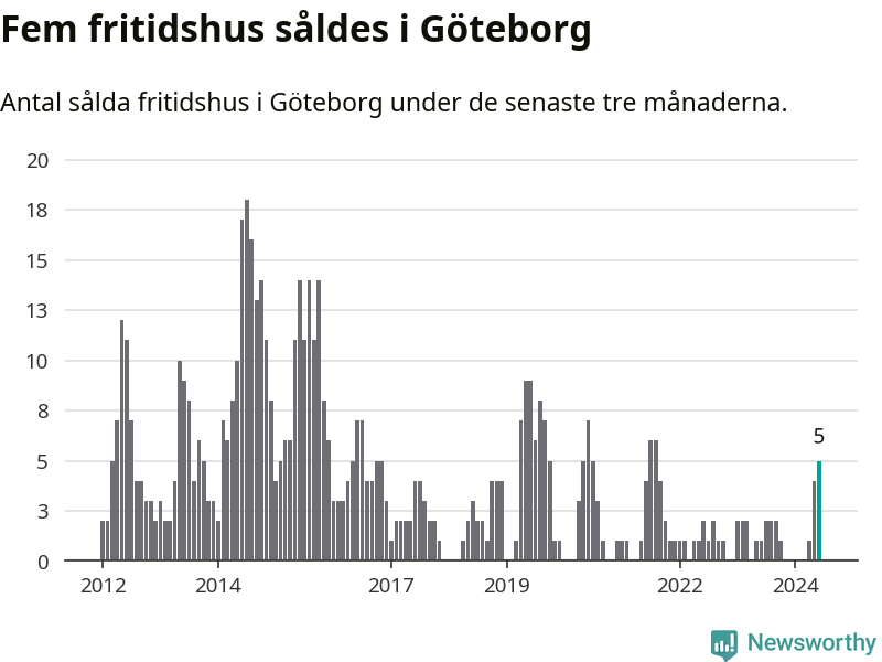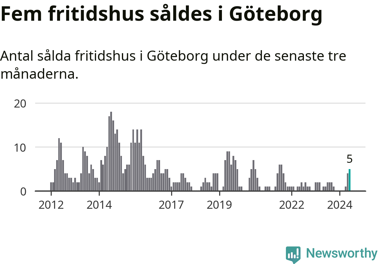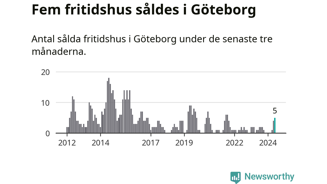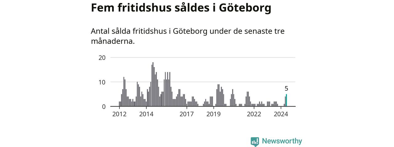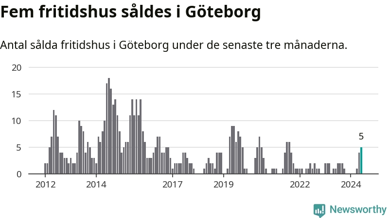 Mellan april och juni gjordes sammanlagt fem affärer med fritidshus i Göteborgs kommun. Det kan jämföras med ett vid motsvarande tid i fjol.
