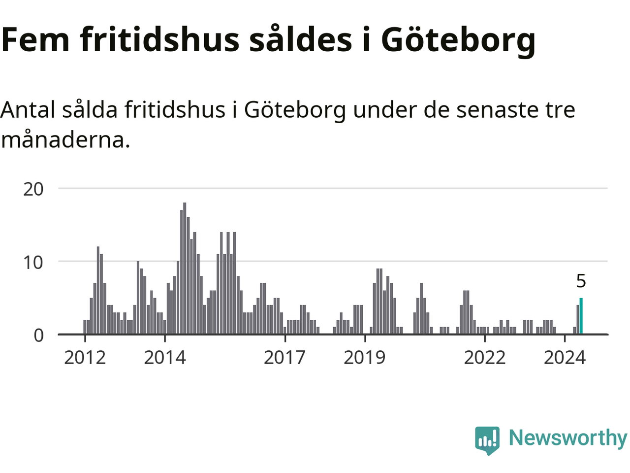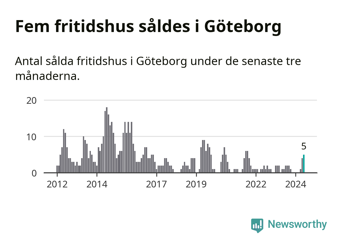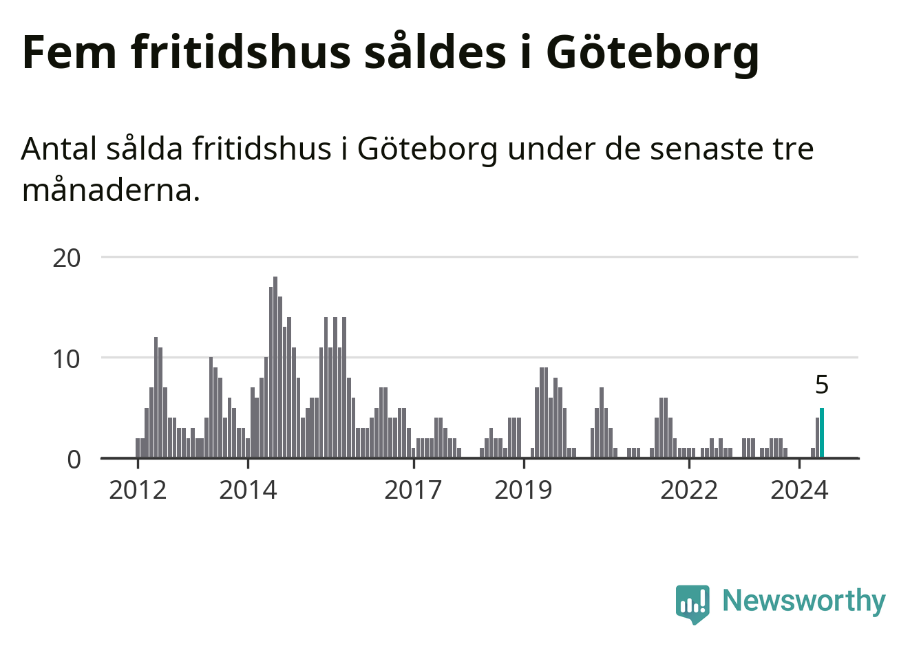 Mellan april och juni gjordes sammanlagt fem affärer med fritidshus i Göteborgs kommun. Det kan jämföras med ett vid motsvarande tid i fjol.