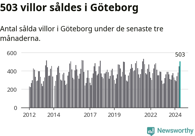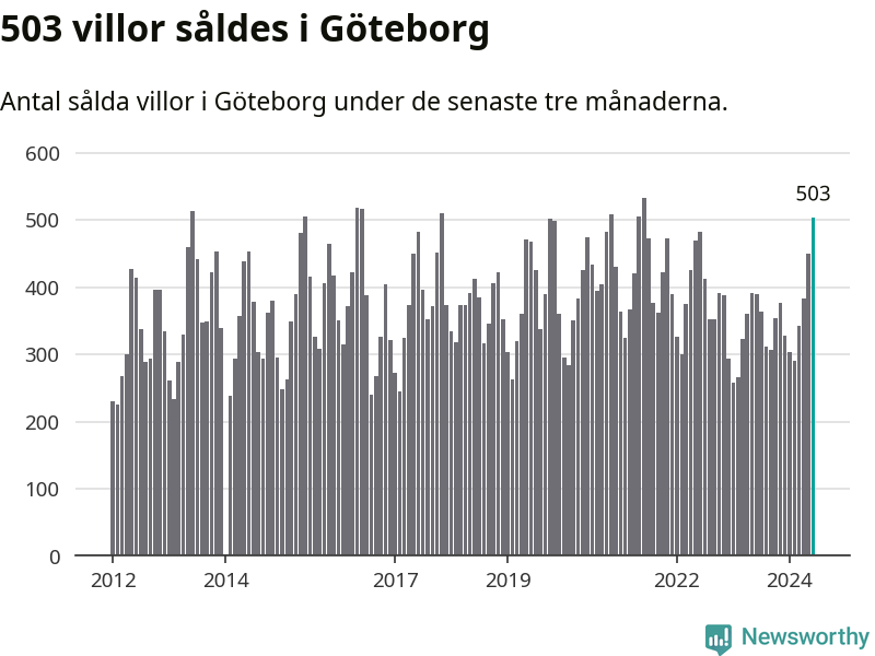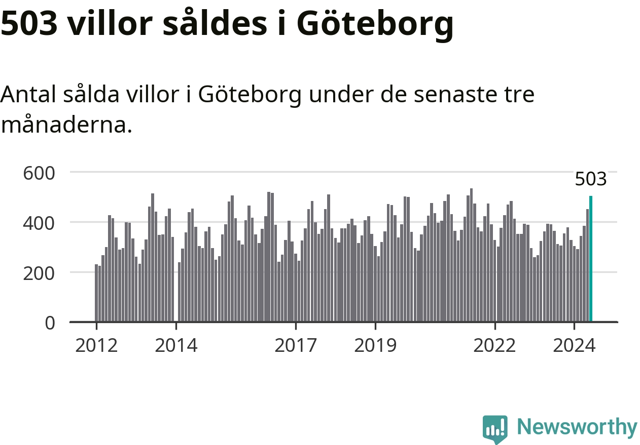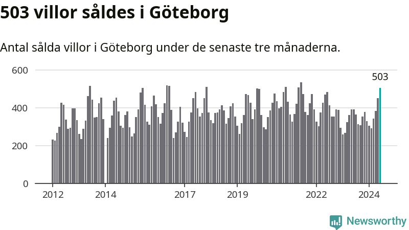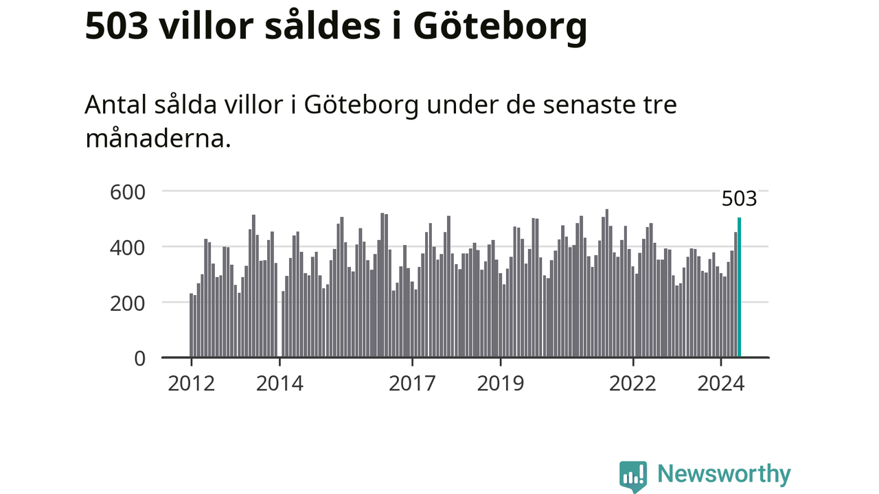 Sammanlagt såldes 503 villor i Göteborgs kommun mellan april och juni till ett genomsnittligt pris på 6,6 miljoner kronor. I fjol gjordes 390 affärer vid den här tiden på året.
