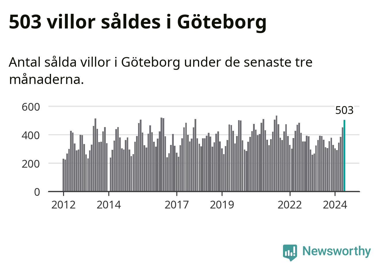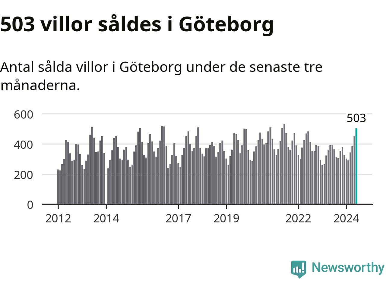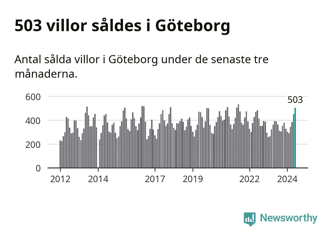 Sammanlagt såldes 503 villor i Göteborgs kommun mellan april och juni till ett genomsnittligt pris på 6,6 miljoner kronor. I fjol gjordes 390 affärer vid den här tiden på året.
