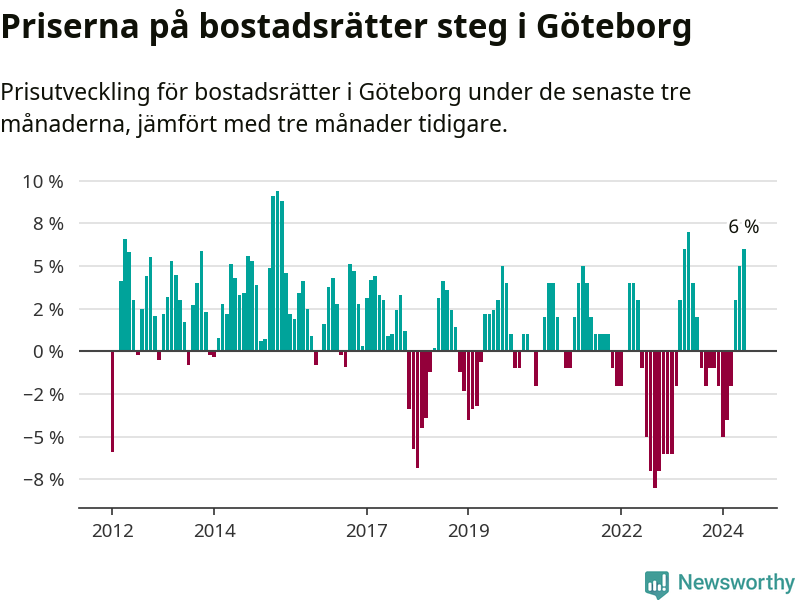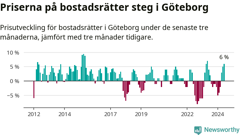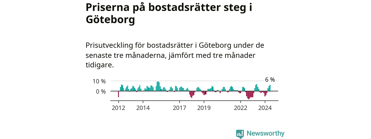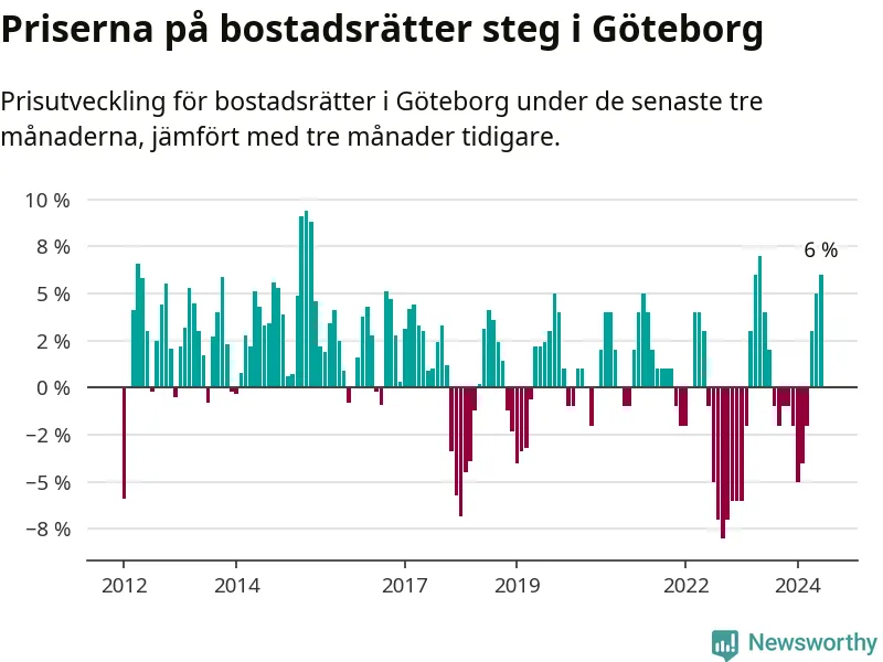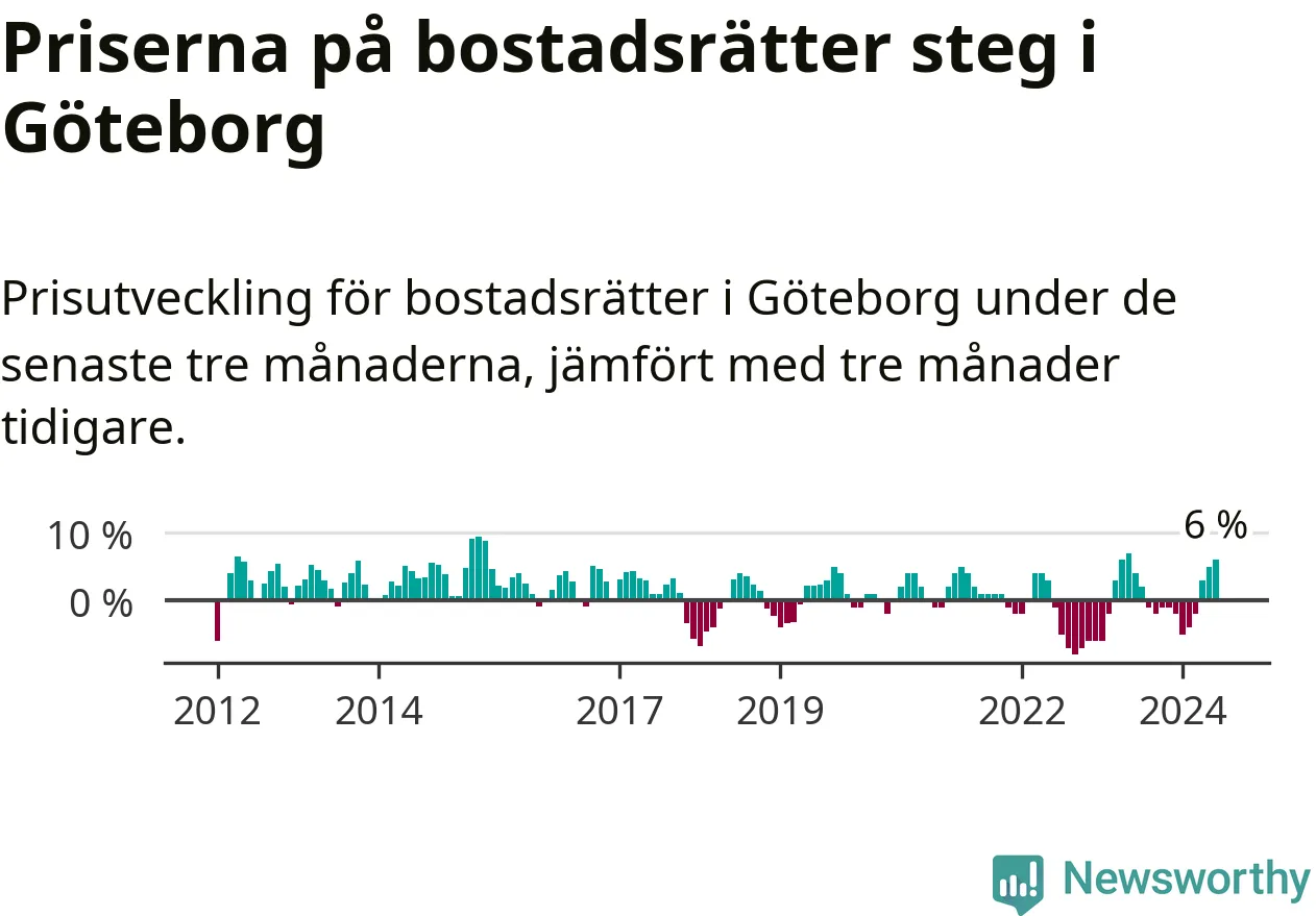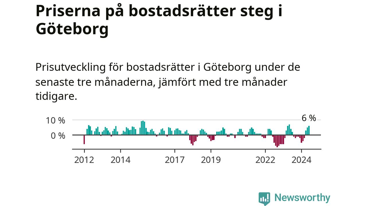 Priserna på bostadsrätter steg mellan april och juni med 6 procent i Göteborgs kommun. Det är en betydande uppgång jämfört med det gångna året då priserna i snitt stått stilla.