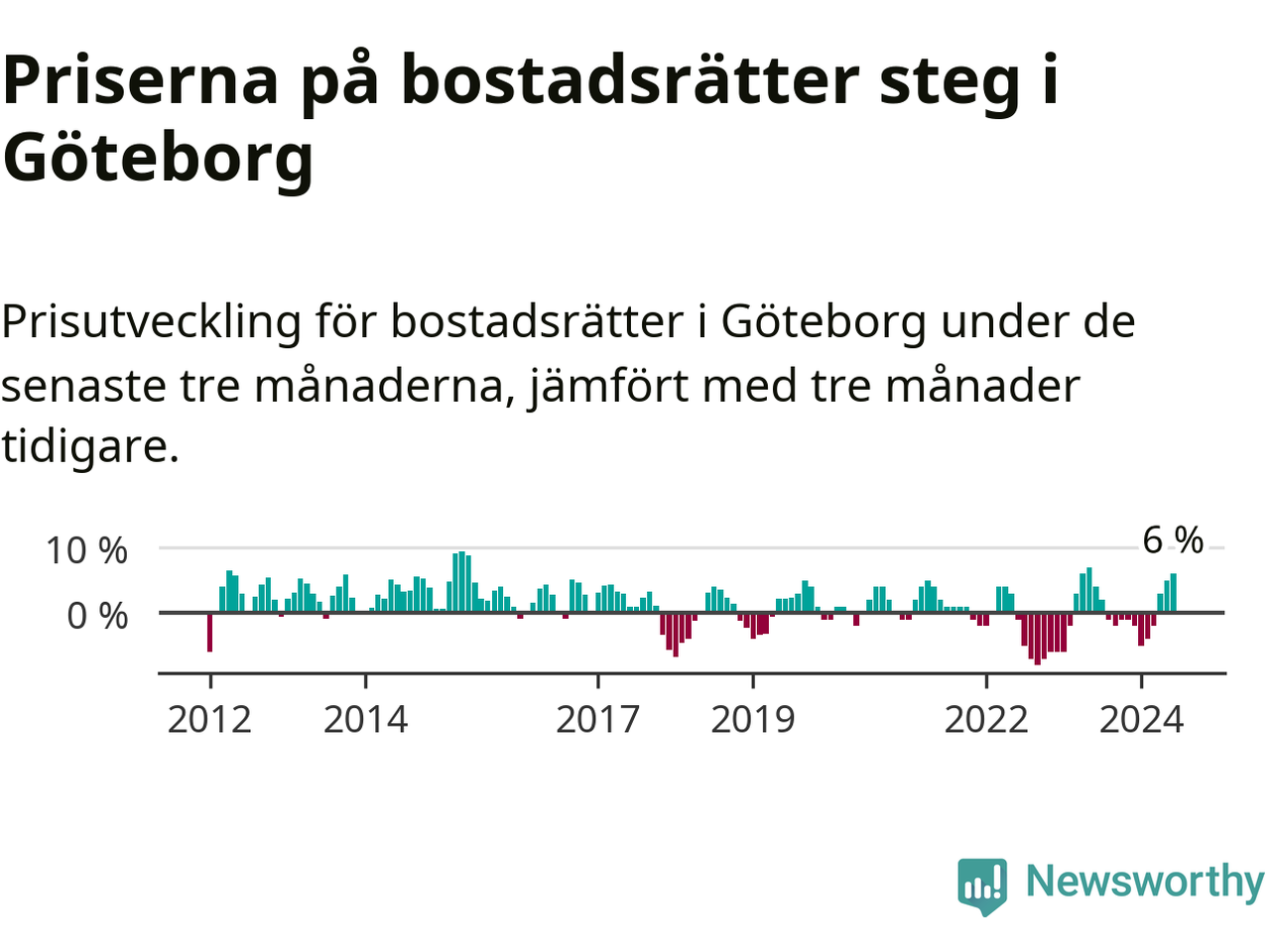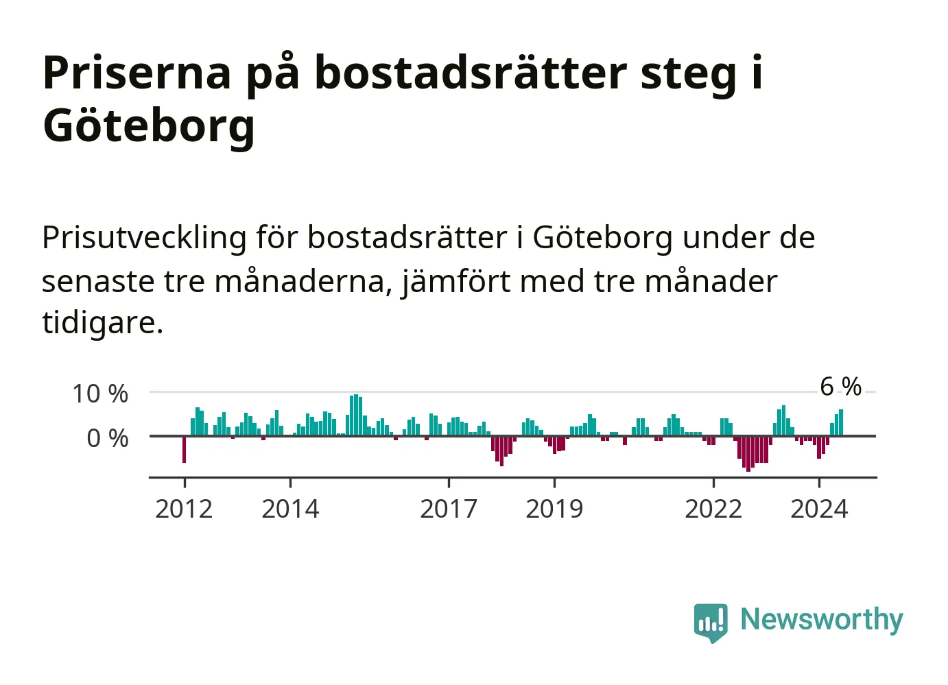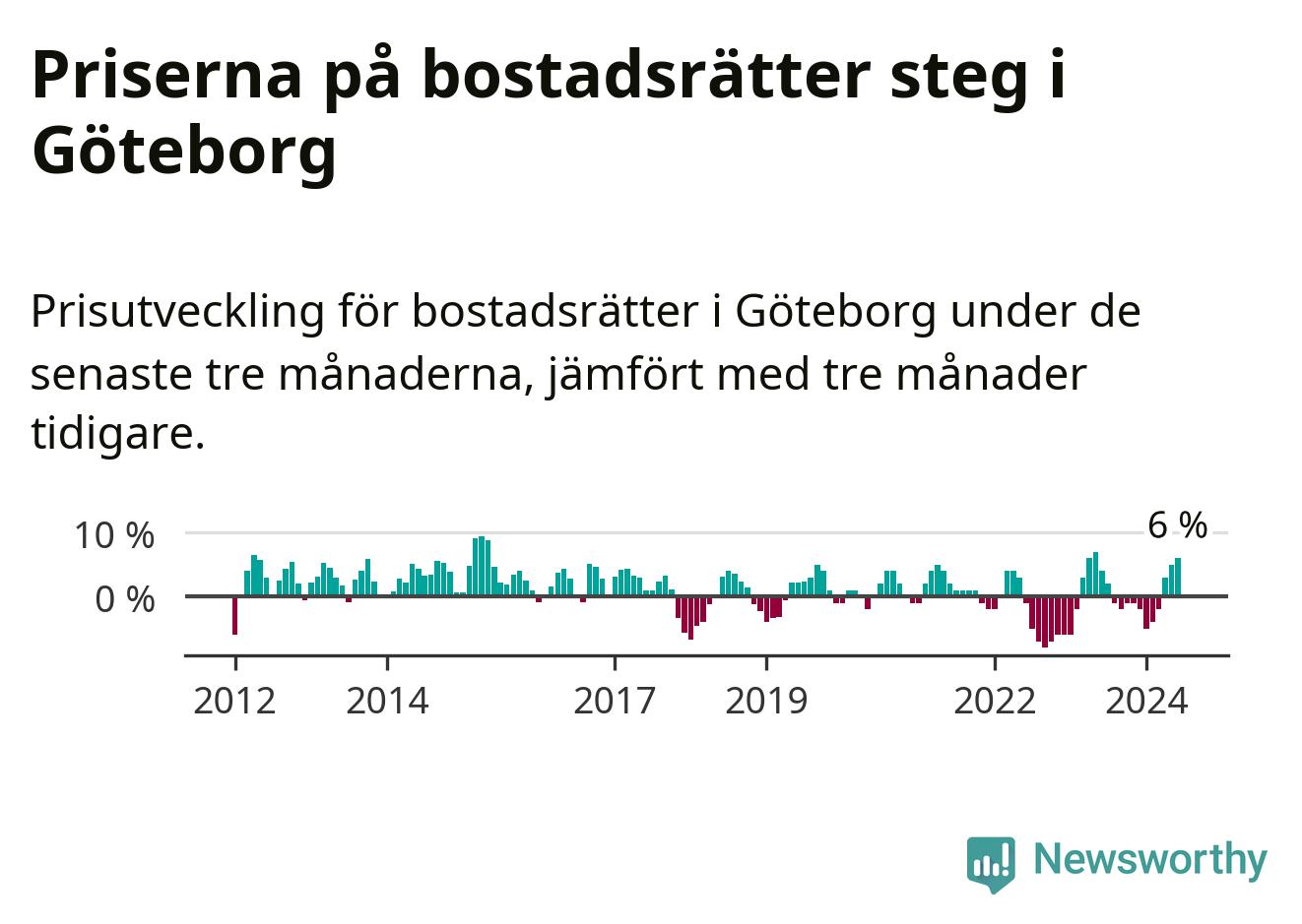 Priserna på bostadsrätter steg mellan april och juni med 6 procent i Göteborgs kommun. Det är en betydande uppgång jämfört med det gångna året då priserna i snitt stått stilla.