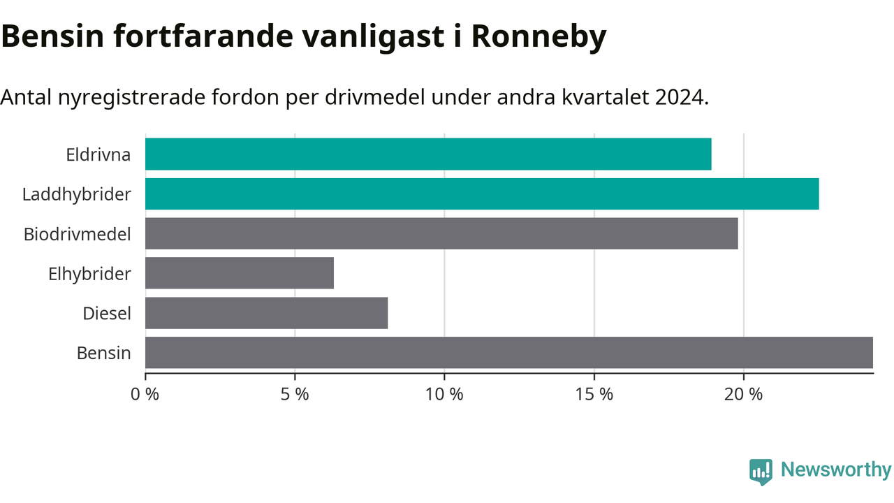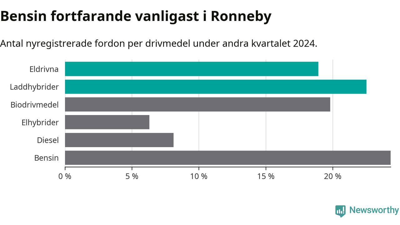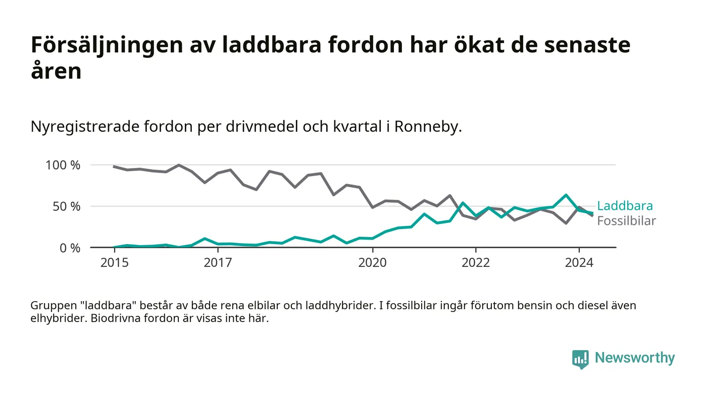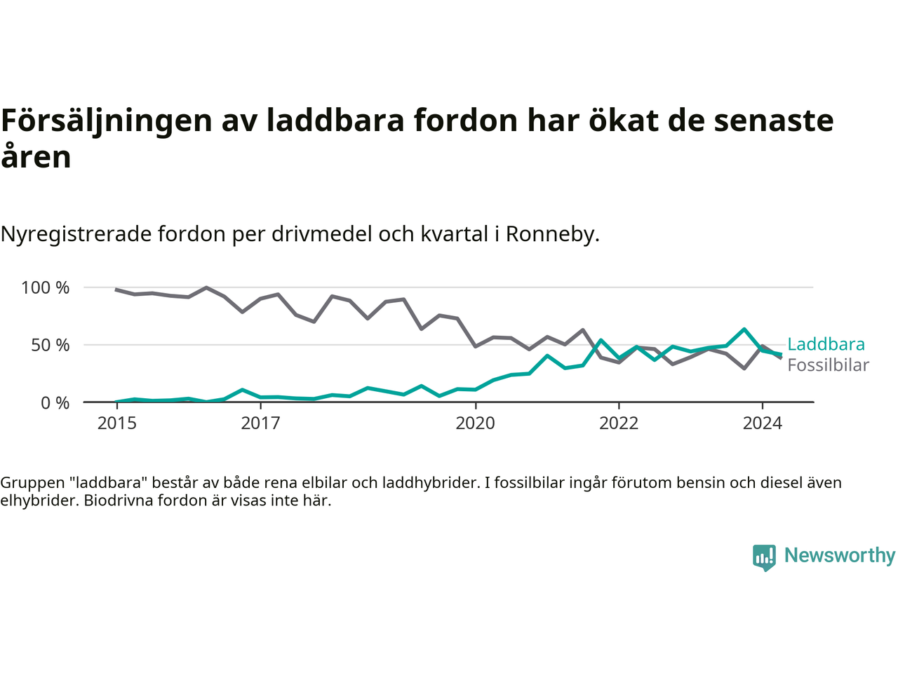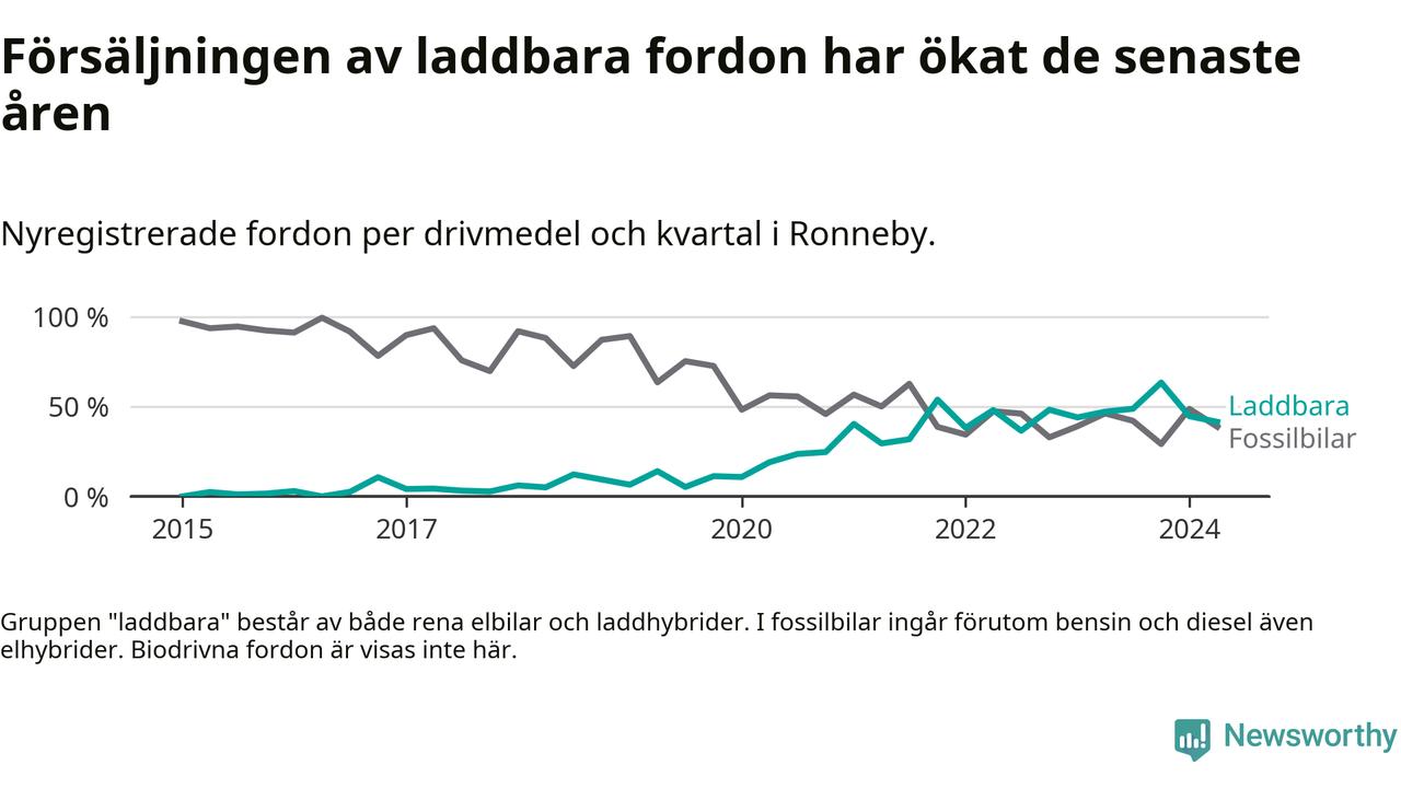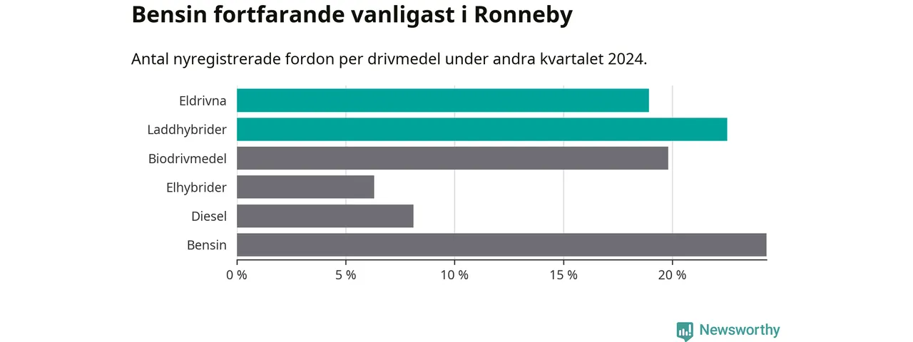 Under andra kvartalet 2024 var 41 procent av alla nyregistrerade personbilar i Ronneby laddbara (sammanlagt registrerades 111 nya bilar). Merparten av de laddbara bilarna var så kallade laddhybrider, det vill säga fordon som går att ladda och köra på el, men som även har en förbränningsmotor. 19 procent av alla nya bilar var rena elbilar.