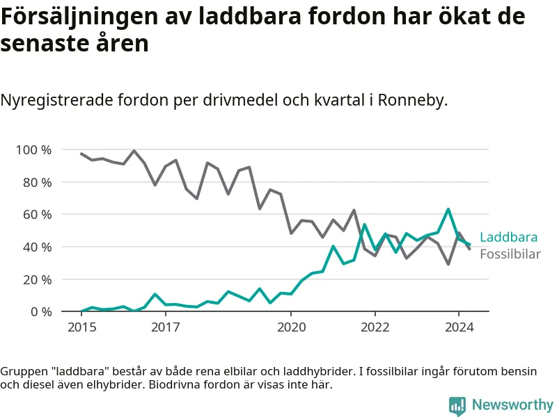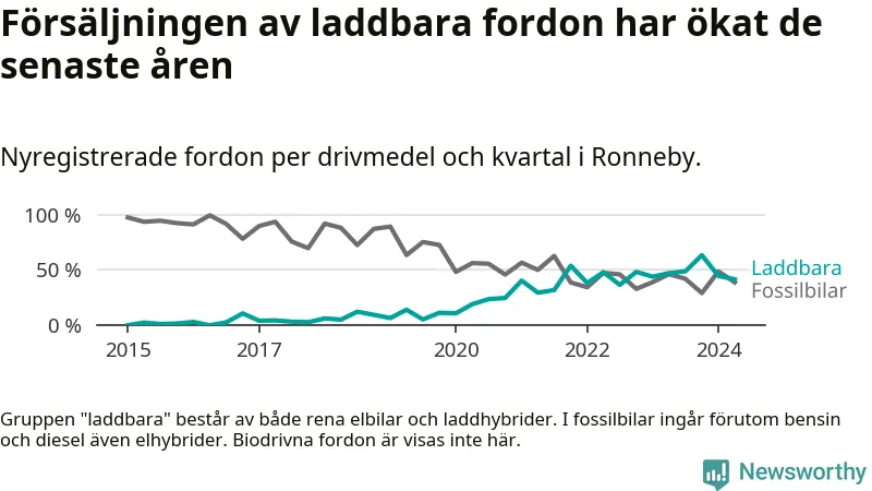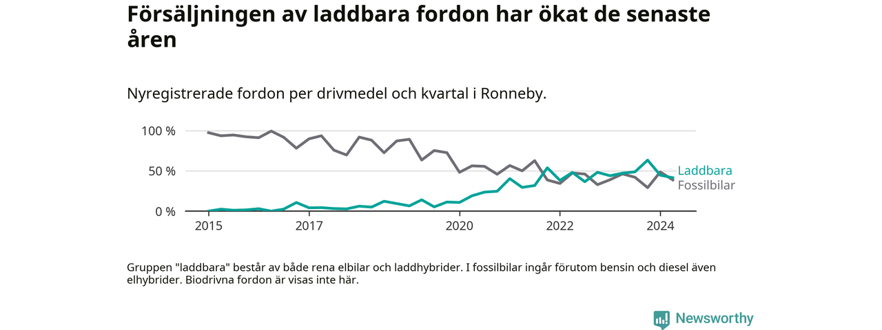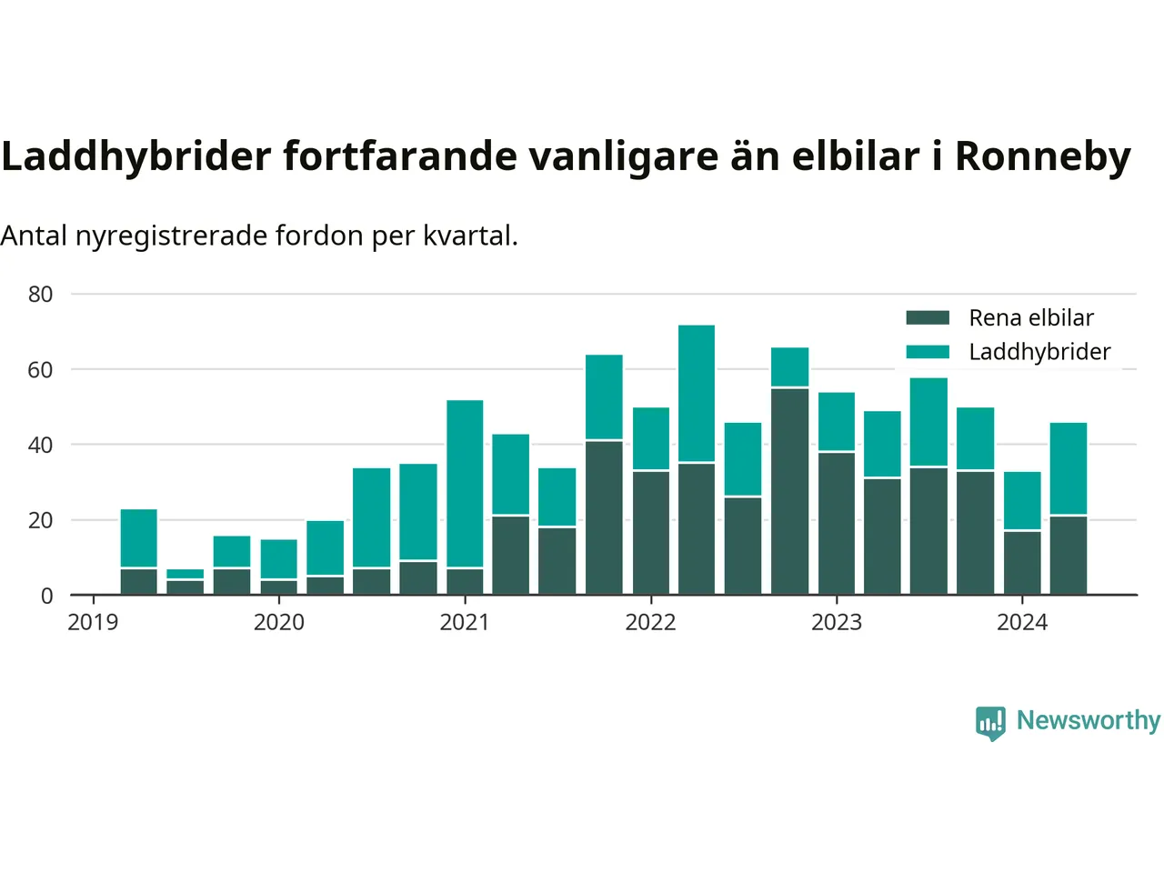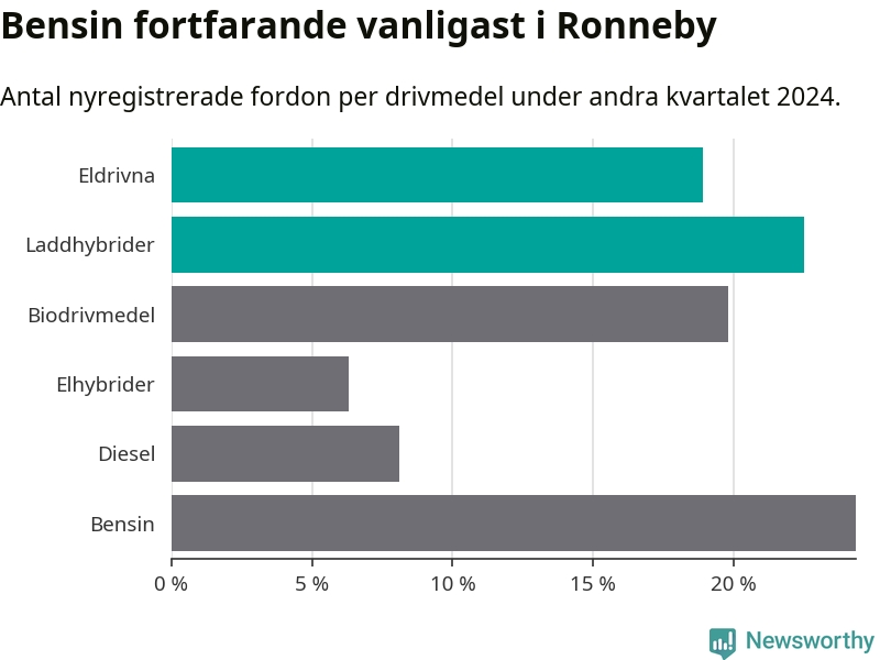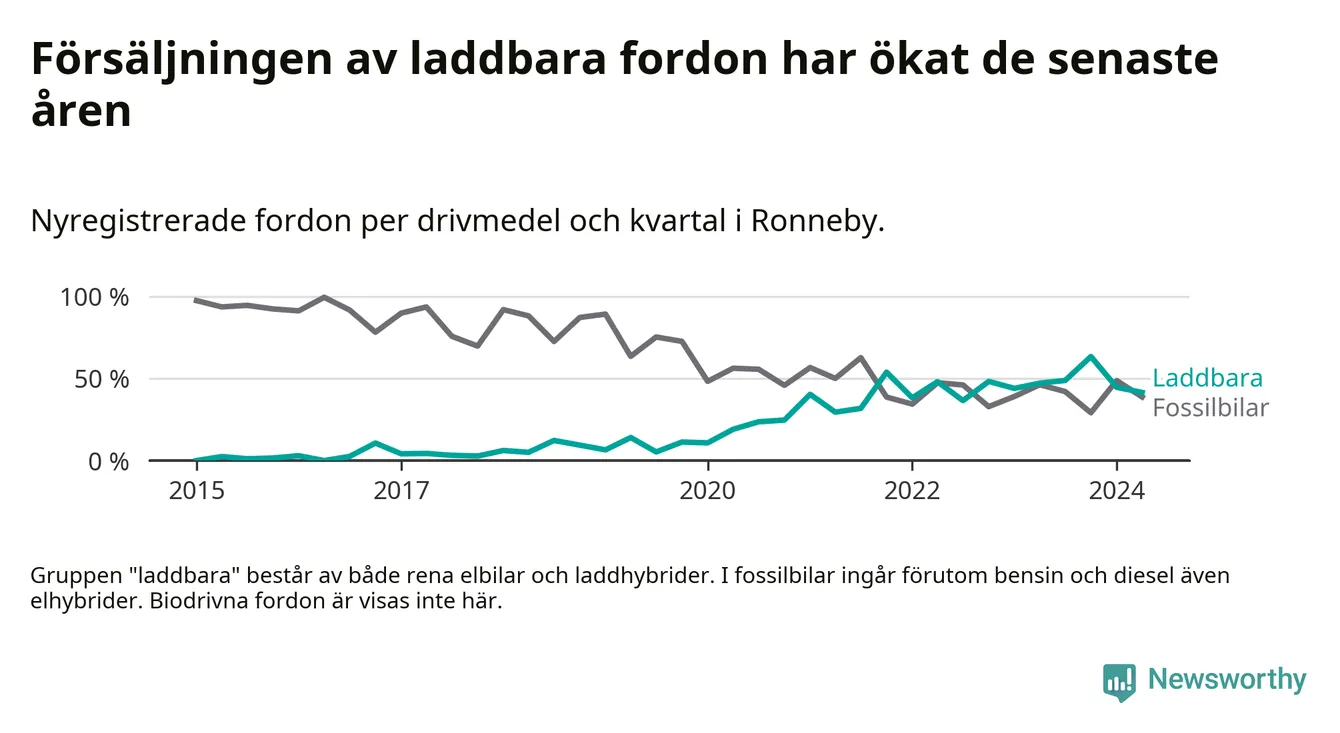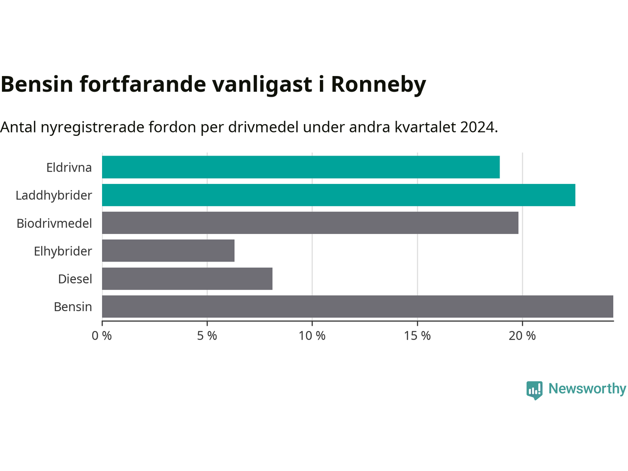 Under andra kvartalet 2024 var 41 procent av alla nyregistrerade personbilar i Ronneby laddbara (sammanlagt registrerades 111 nya bilar). Merparten av de laddbara bilarna var så kallade laddhybrider, det vill säga fordon som går att ladda och köra på el, men som även har en förbränningsmotor. 19 procent av alla nya bilar var rena elbilar.