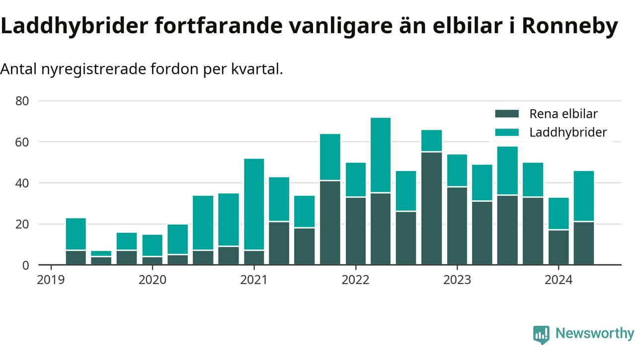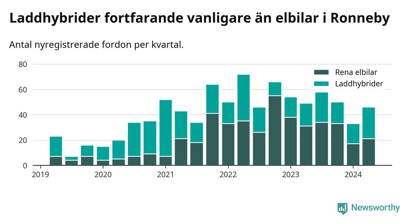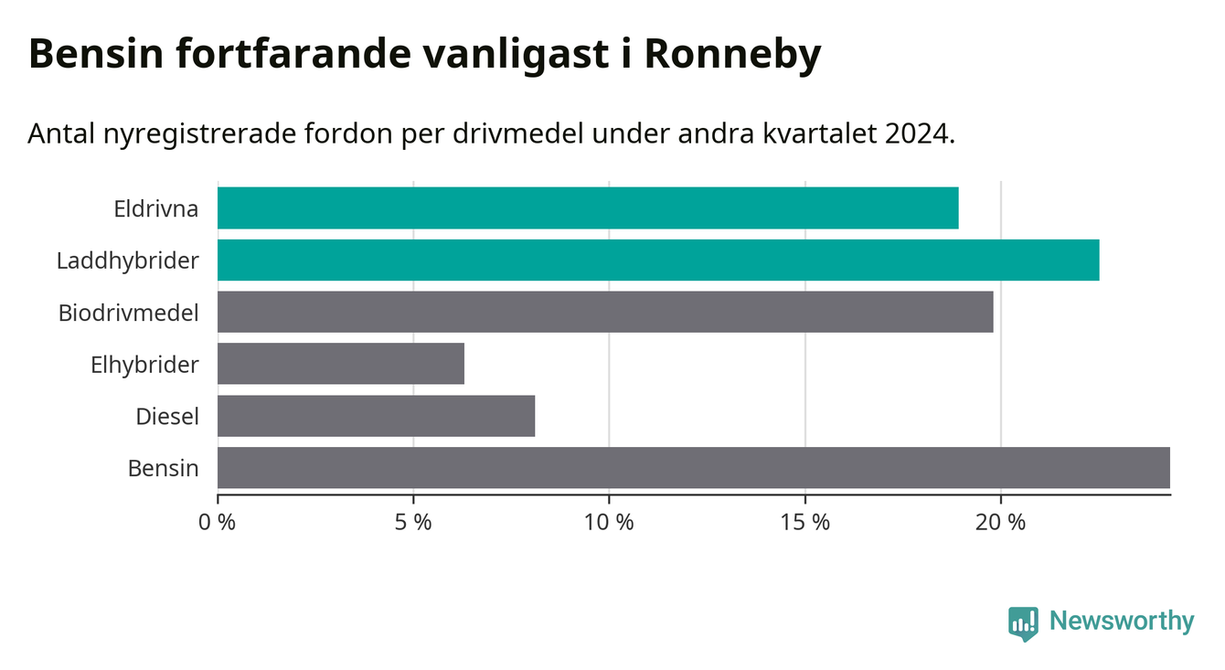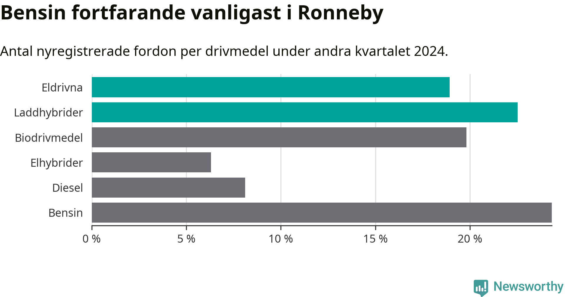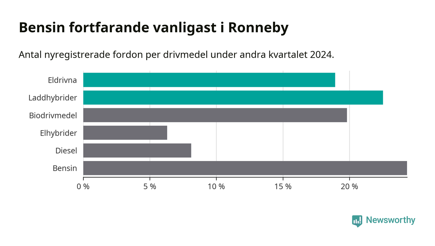 Under andra kvartalet 2024 var 41 procent av alla nyregistrerade personbilar i Ronneby laddbara (sammanlagt registrerades 111 nya bilar). Merparten av de laddbara bilarna var så kallade laddhybrider, det vill säga fordon som går att ladda och köra på el, men som även har en förbränningsmotor. 19 procent av alla nya bilar var rena elbilar.