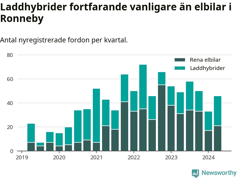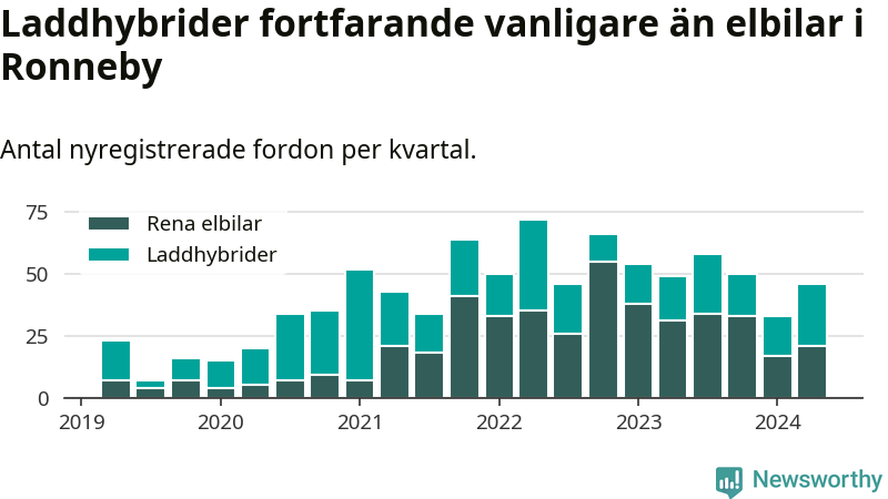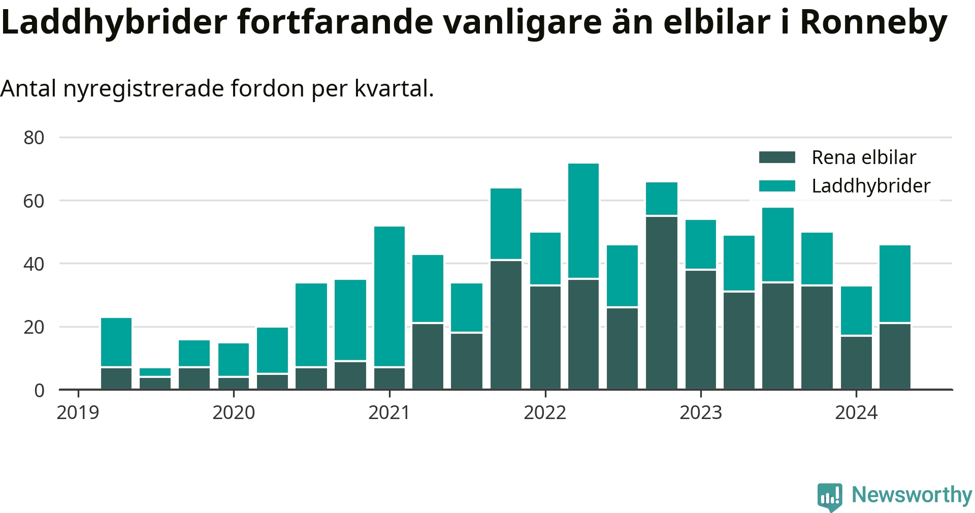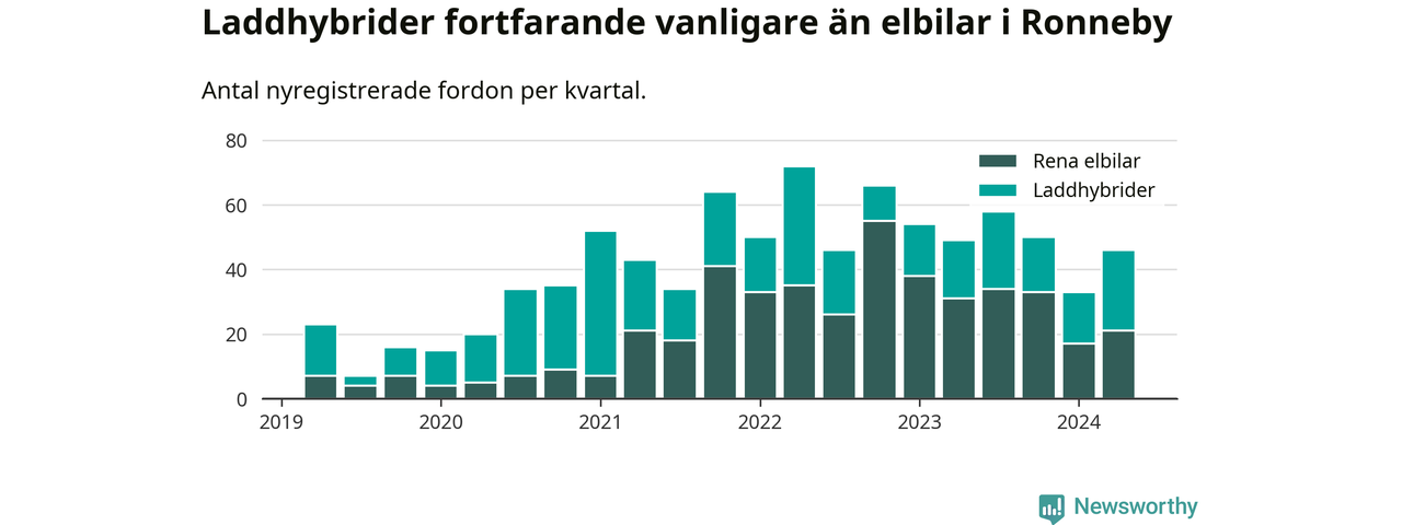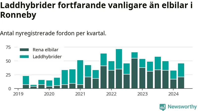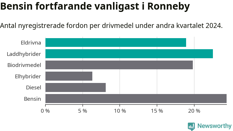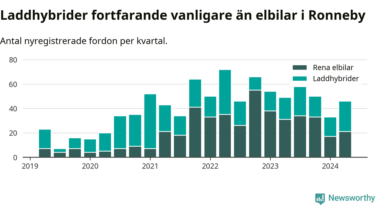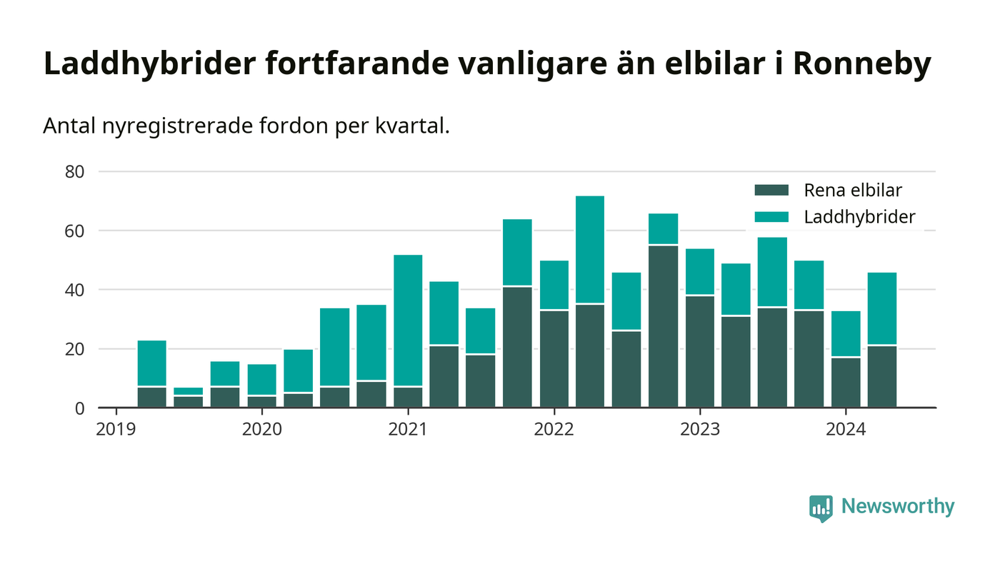 Under andra kvartalet 2024 var 41 procent av alla nyregistrerade personbilar i Ronneby laddbara (sammanlagt registrerades 111 nya bilar). Merparten av de laddbara bilarna var så kallade laddhybrider, det vill säga fordon som går att ladda och köra på el, men som även har en förbränningsmotor. 19 procent av alla nya bilar var rena elbilar.