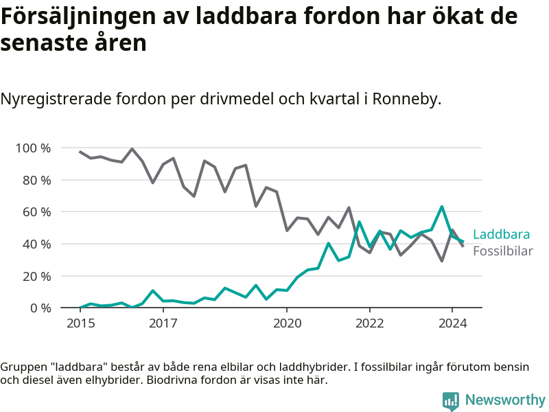 De senaste åren har vi sett en kraftig ökning i försäljning av laddbilar i Sverige. Under slutet av 2023 och början av 2024 har utvecklingen stannat av. I Ronneby peakade andelen laddbara under fjärde kvartalet 2023 (63 procent).