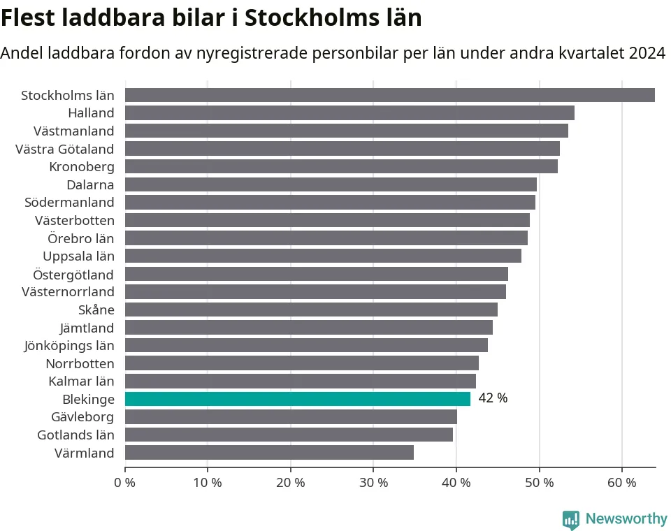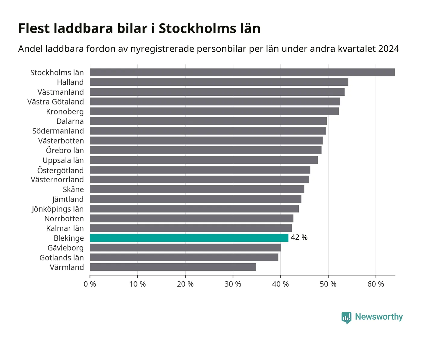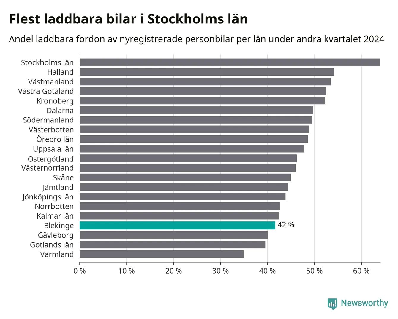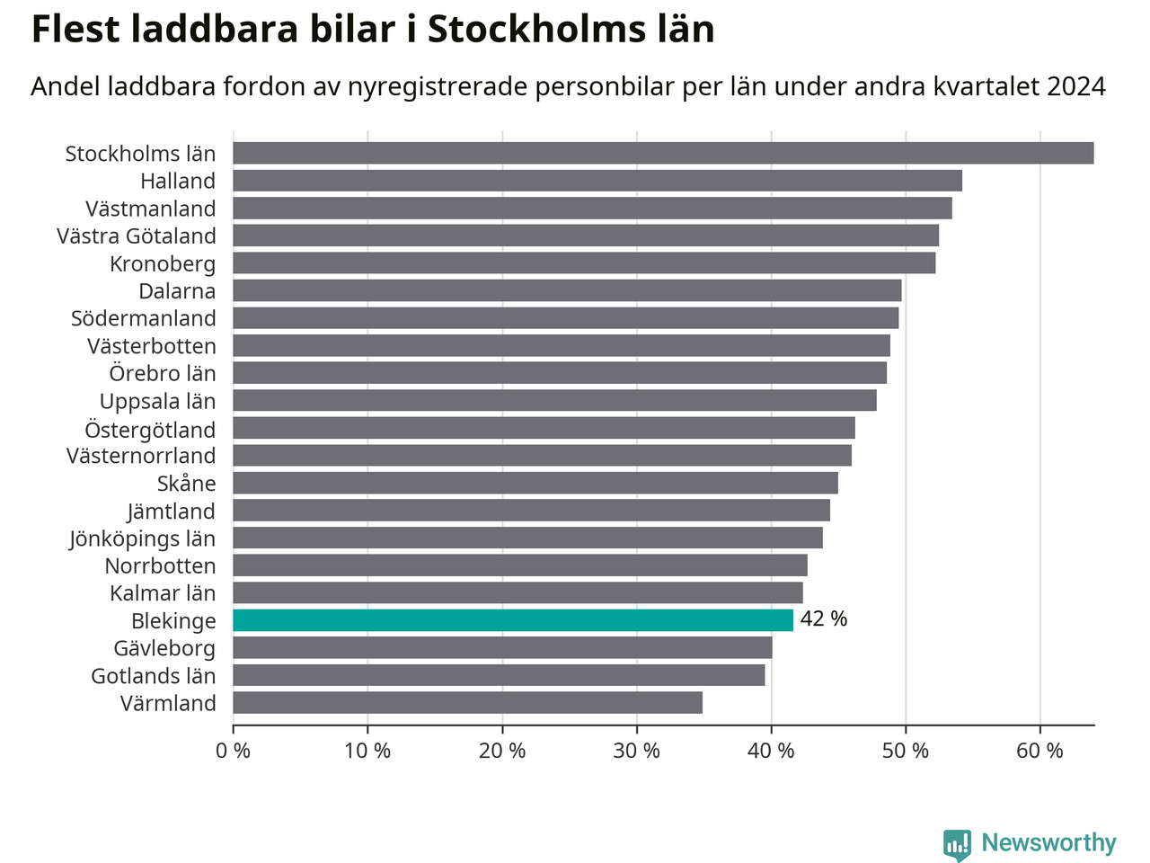 I hela landet var 54 procent av alla nya bilar laddbara under andra kvartalet. Det är framför allt Stockholms län som drar upp snittet, vilket till stor del förklaras av att många leasingföretag har sitt säte i länet. I Blekinge län var 42 procent av nyregistrerade bilar laddbara.