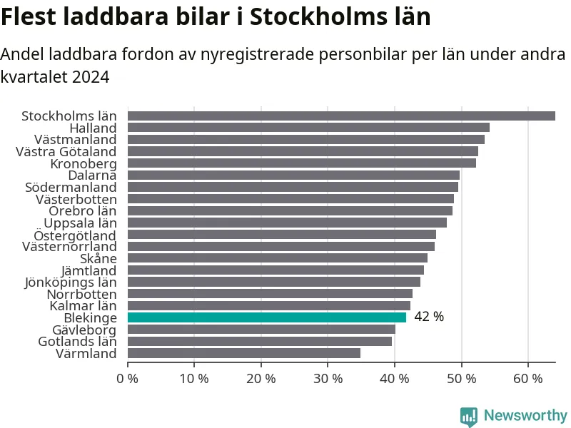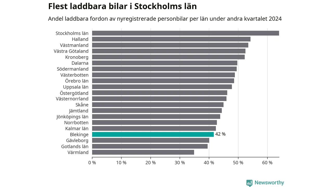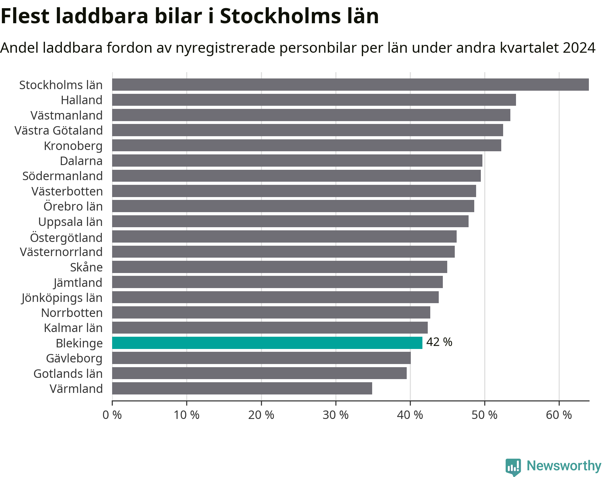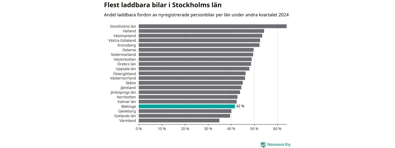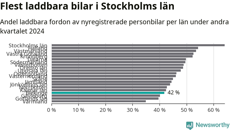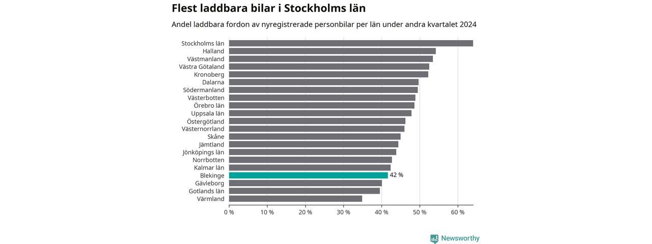 I hela landet var 54 procent av alla nya bilar laddbara under andra kvartalet. Det är framför allt Stockholms län som drar upp snittet, vilket till stor del förklaras av att många leasingföretag har sitt säte i länet. I Blekinge län var 42 procent av nyregistrerade bilar laddbara.