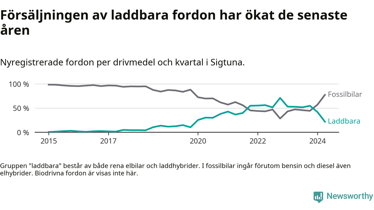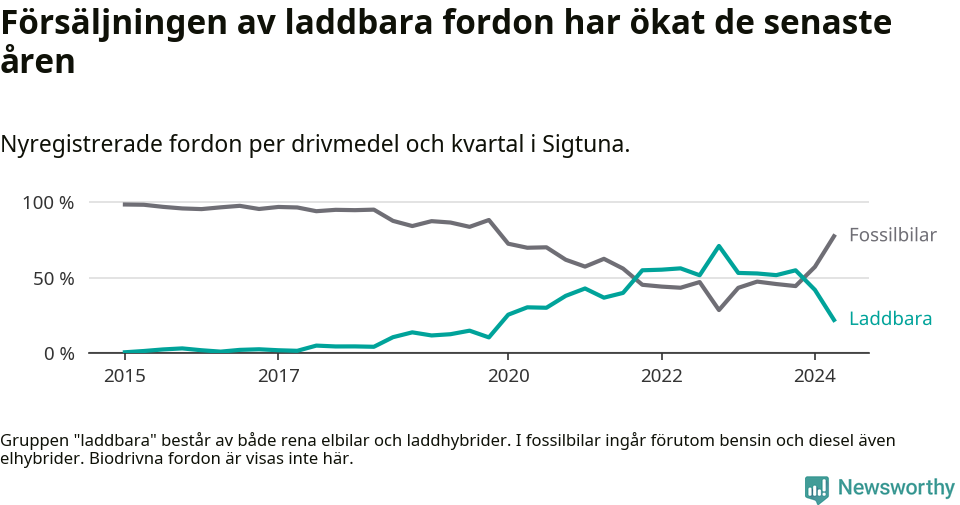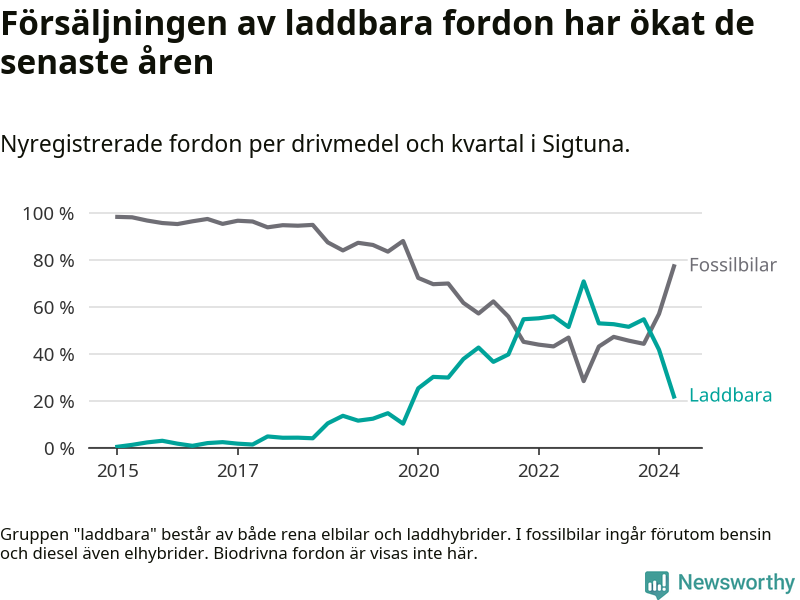 De senaste åren har vi sett en kraftig ökning i försäljning av laddbilar i Sverige. Under slutet av 2023 och början av 2024 har utvecklingen stannat av. I Sigtuna peakade andelen laddbara under fjärde kvartalet 2022 (71 procent).
