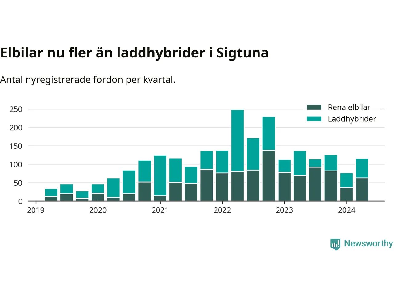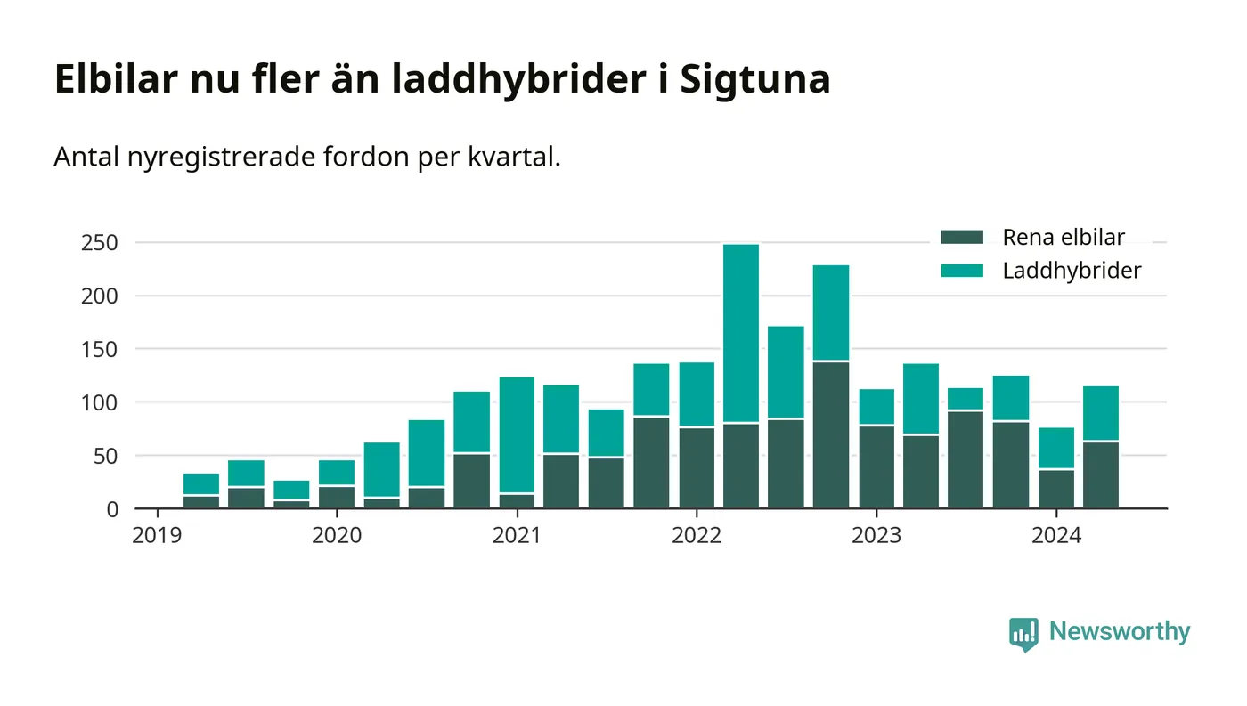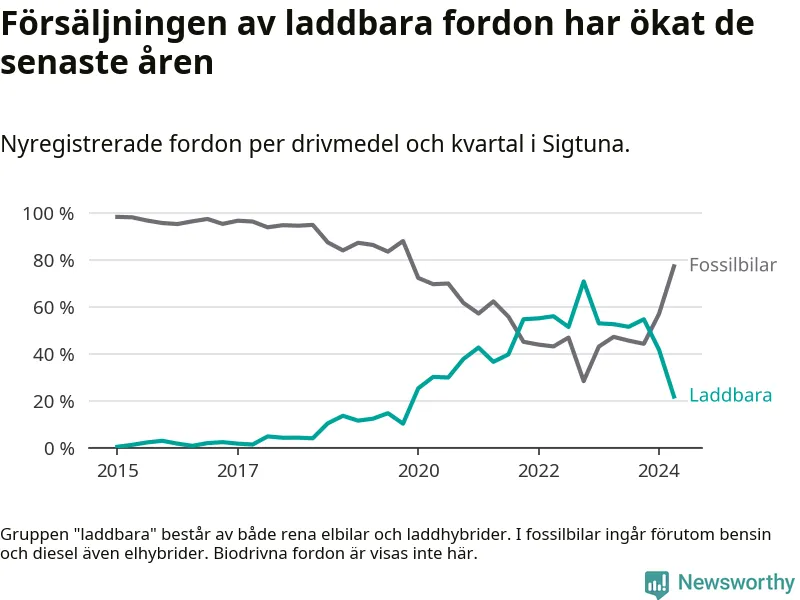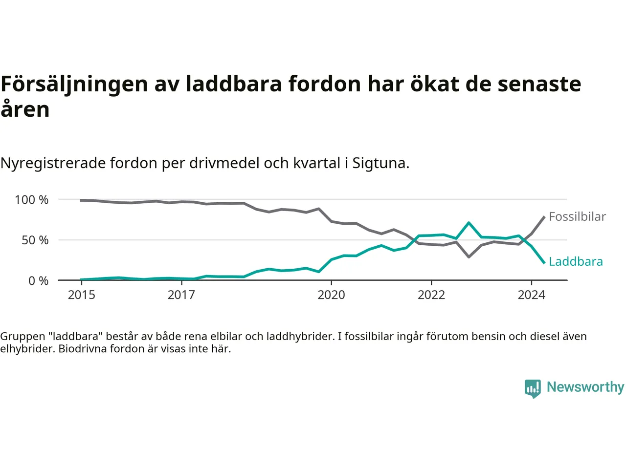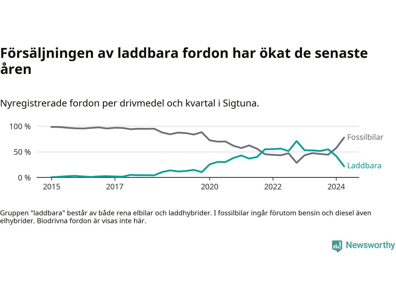 Under andra kvartalet 2024 var 22 procent av alla nyregistrerade personbilar i Sigtuna laddbara (sammanlagt registrerades 529 nya bilar). Merparten av de laddbara bilarna var rena elbilar (12 procent av alla).