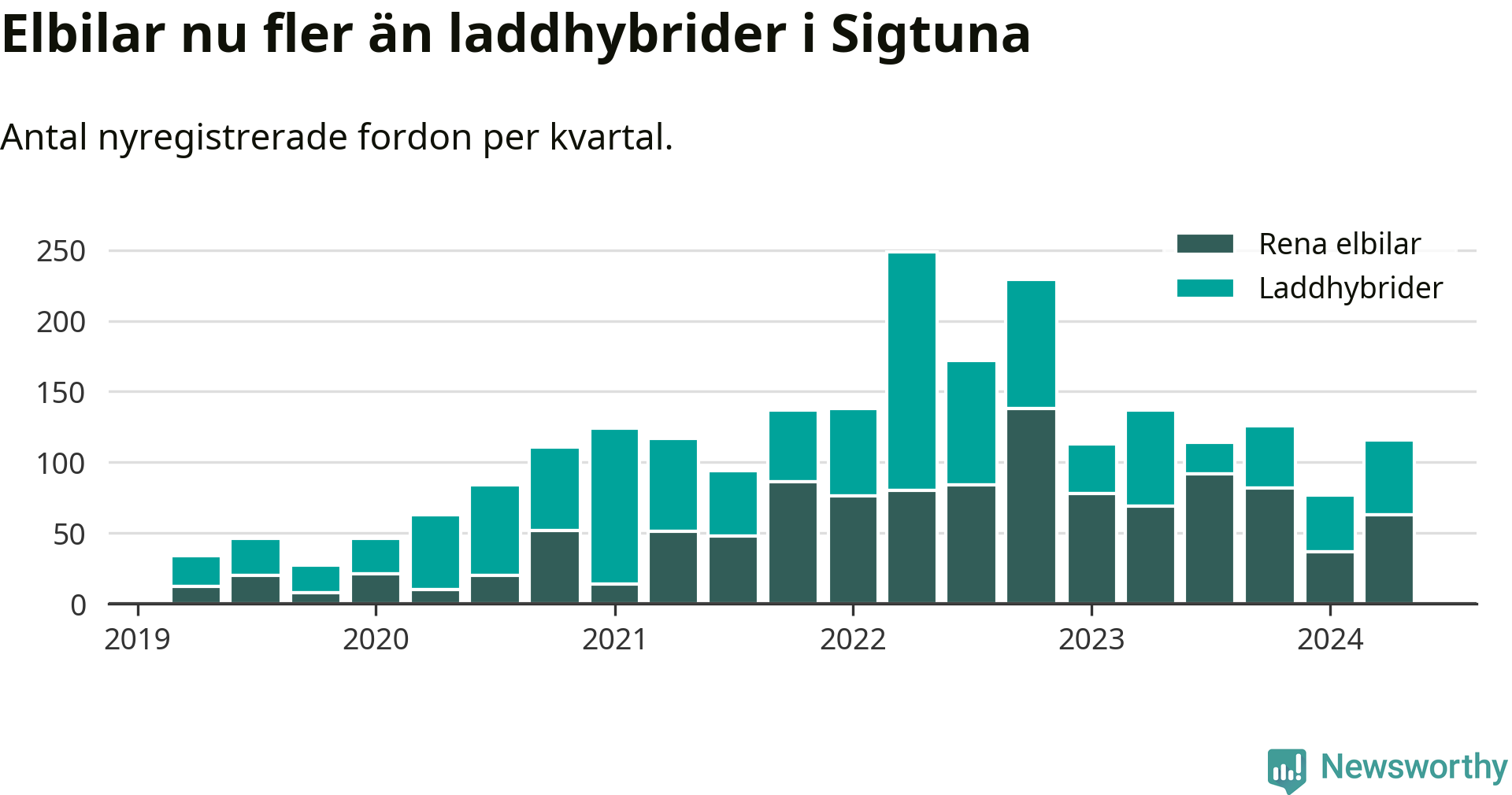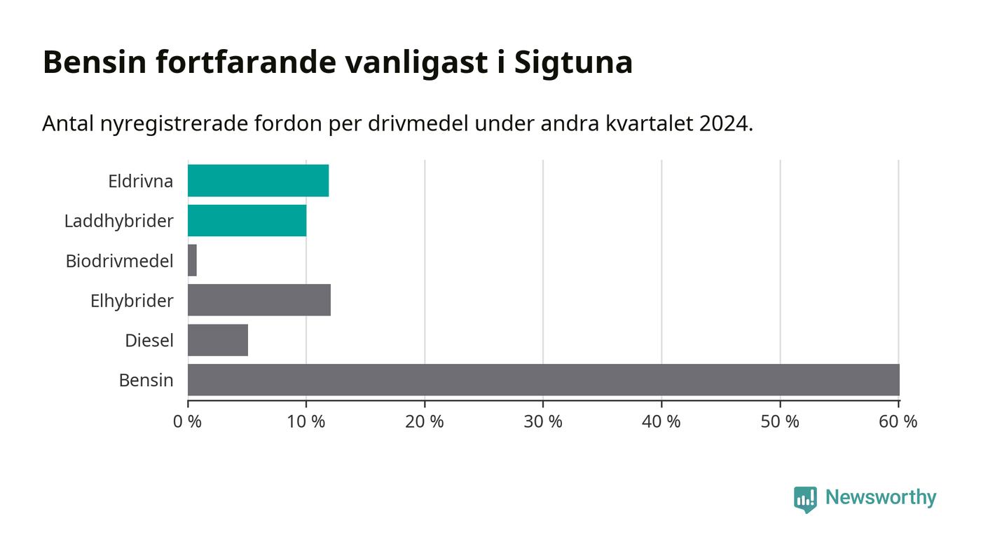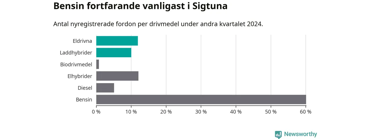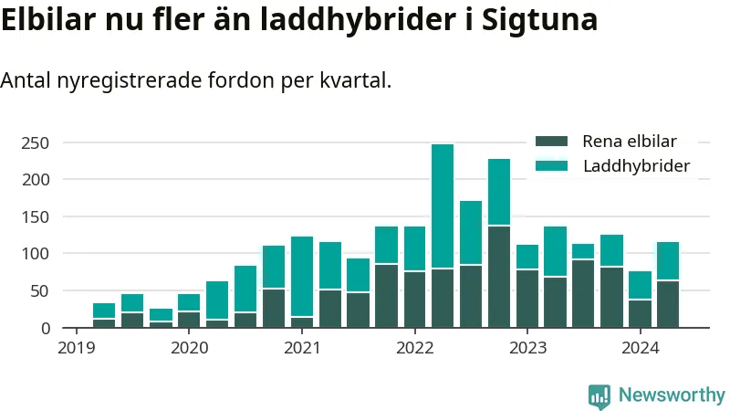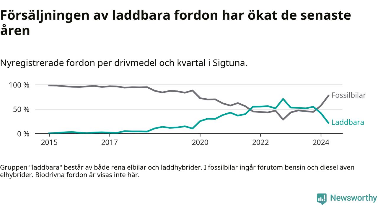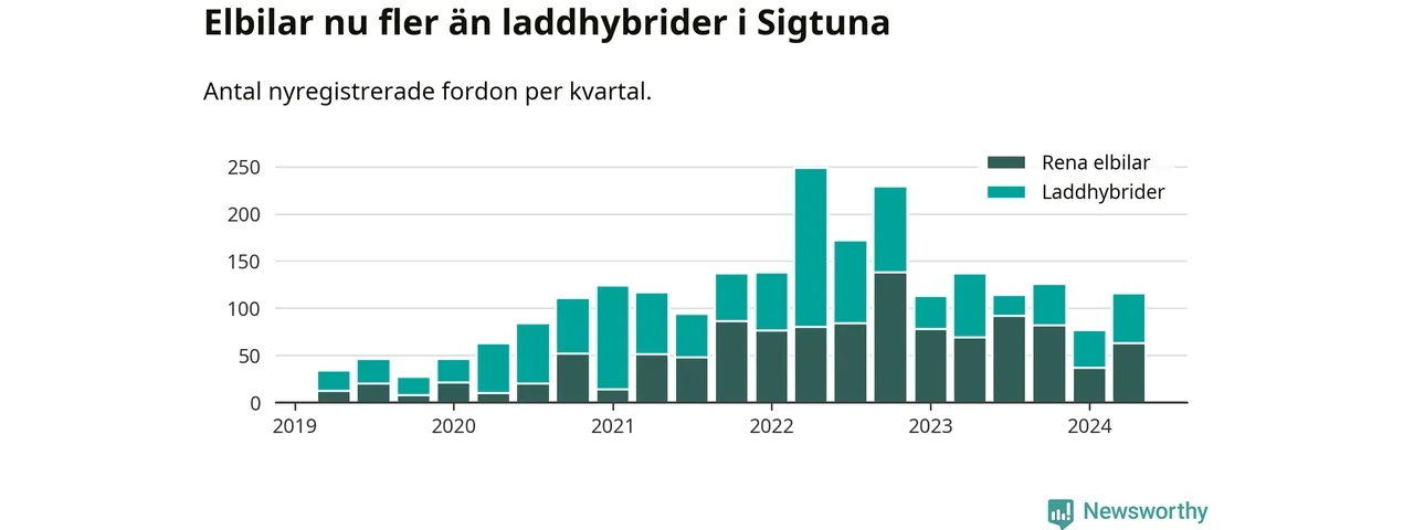 Under andra kvartalet 2024 var 22 procent av alla nyregistrerade personbilar i Sigtuna laddbara (sammanlagt registrerades 529 nya bilar). Merparten av de laddbara bilarna var rena elbilar (12 procent av alla).