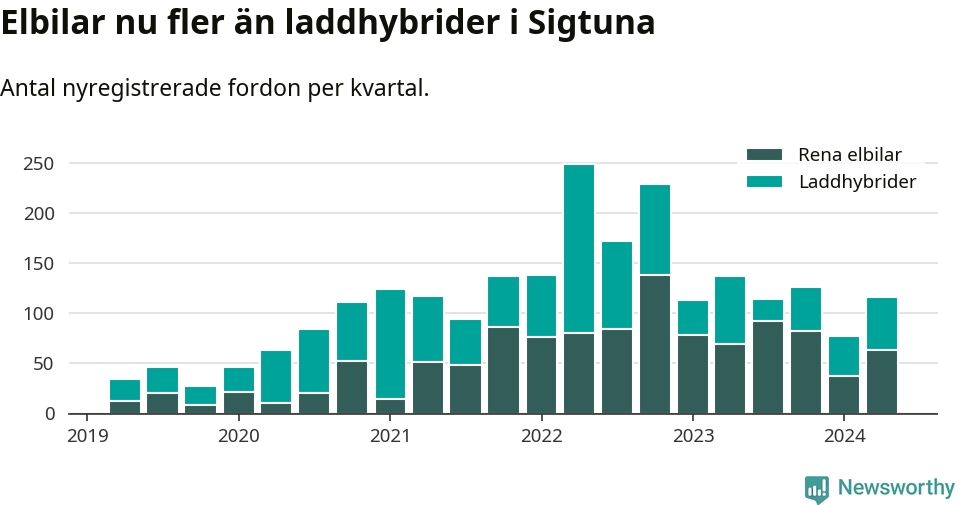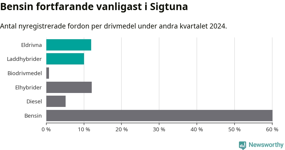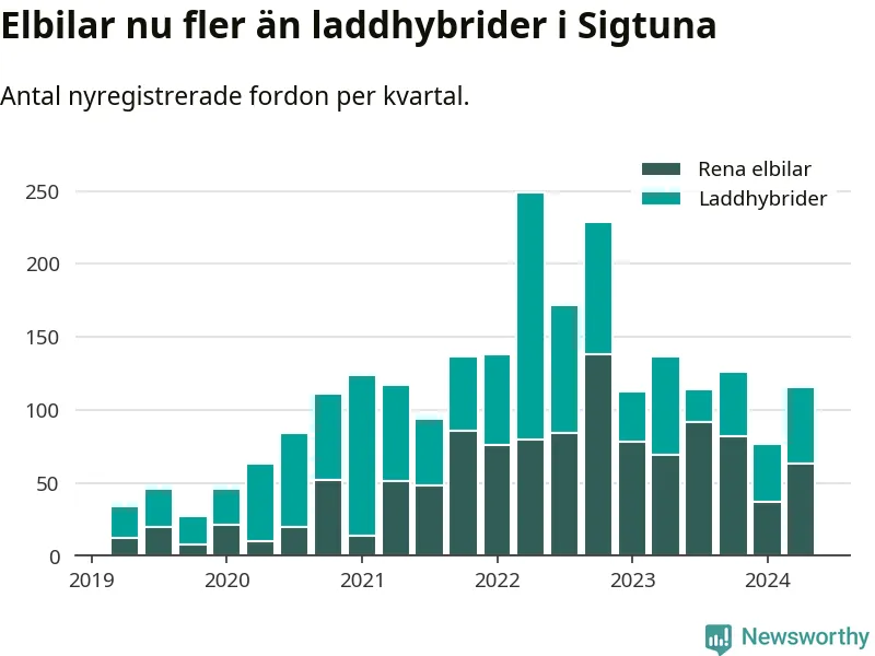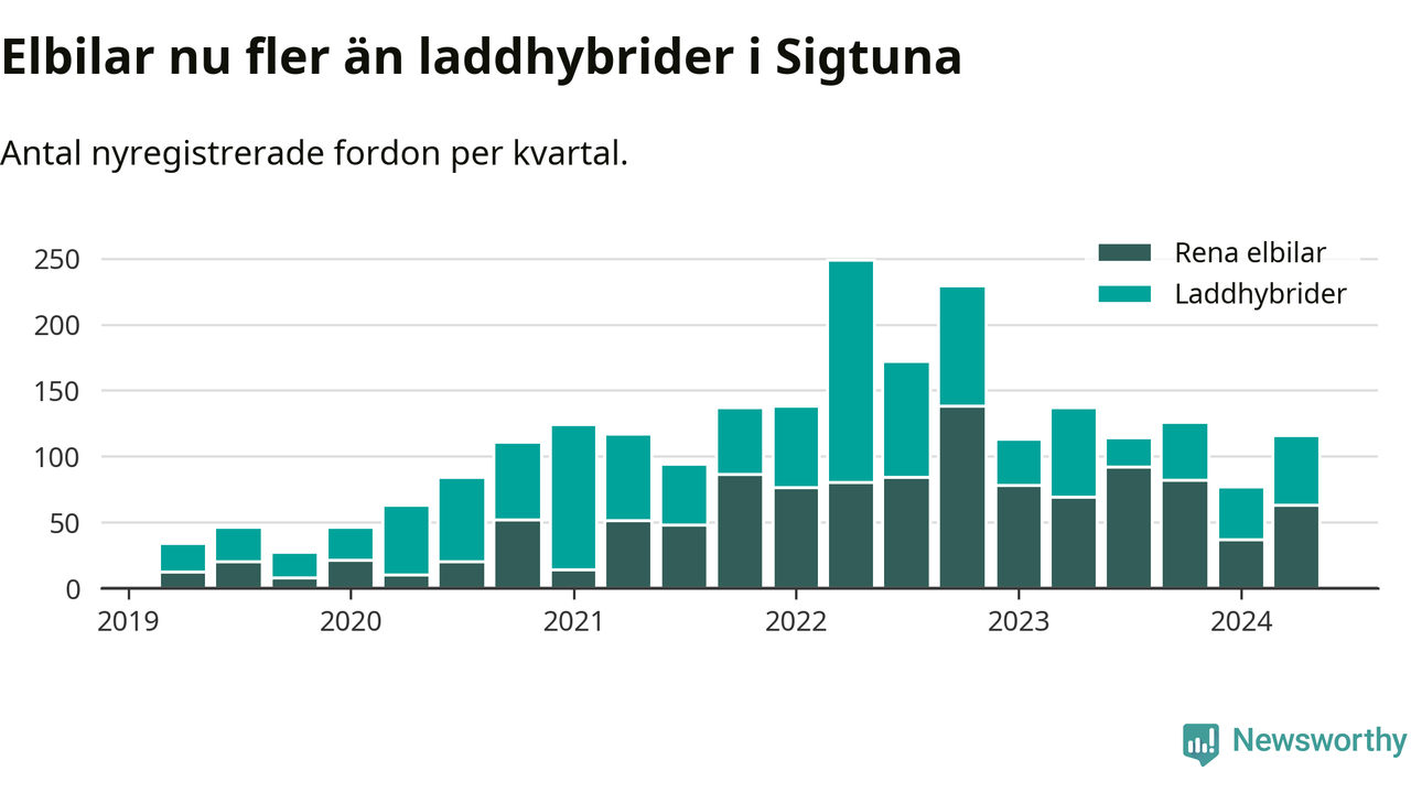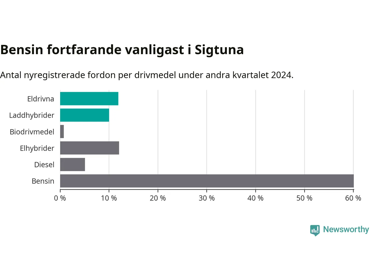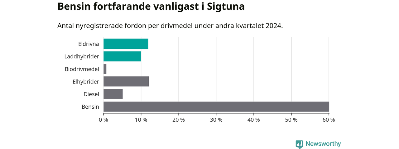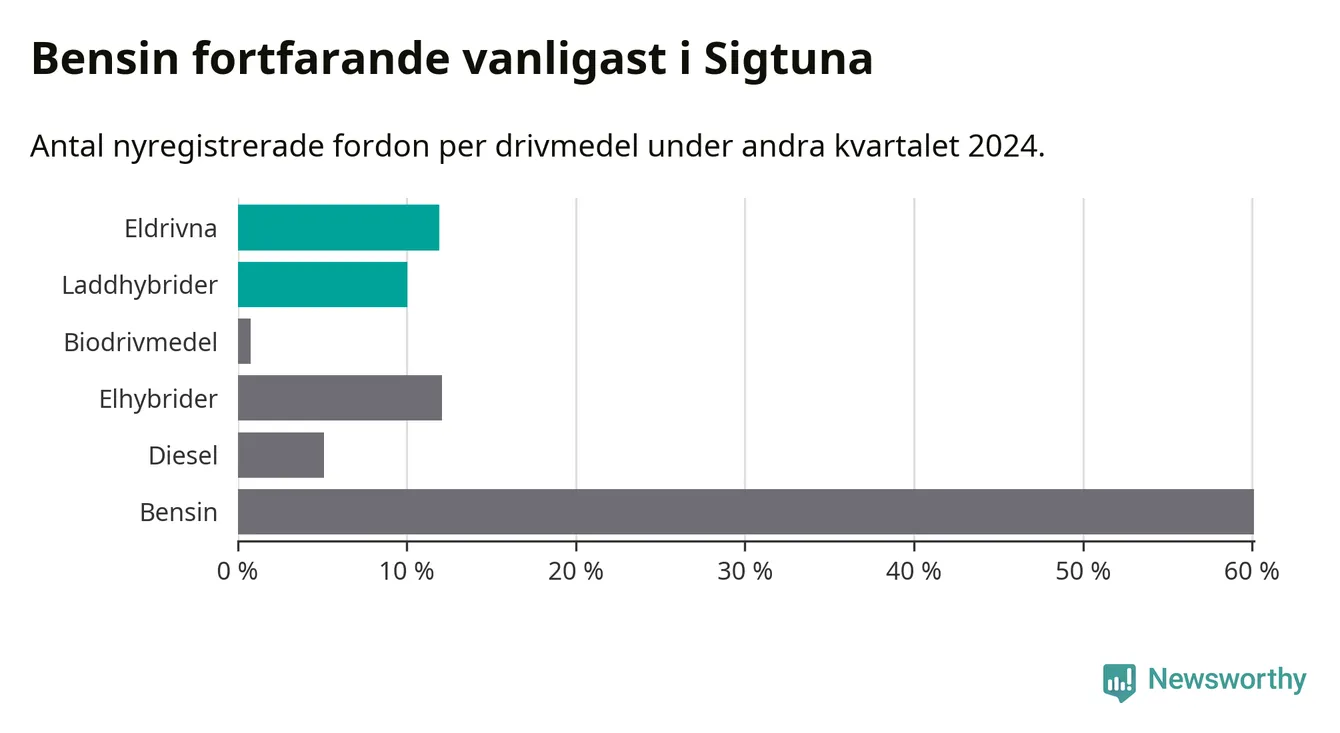 Under andra kvartalet 2024 var 22 procent av alla nyregistrerade personbilar i Sigtuna laddbara (sammanlagt registrerades 529 nya bilar). Merparten av de laddbara bilarna var rena elbilar (12 procent av alla).