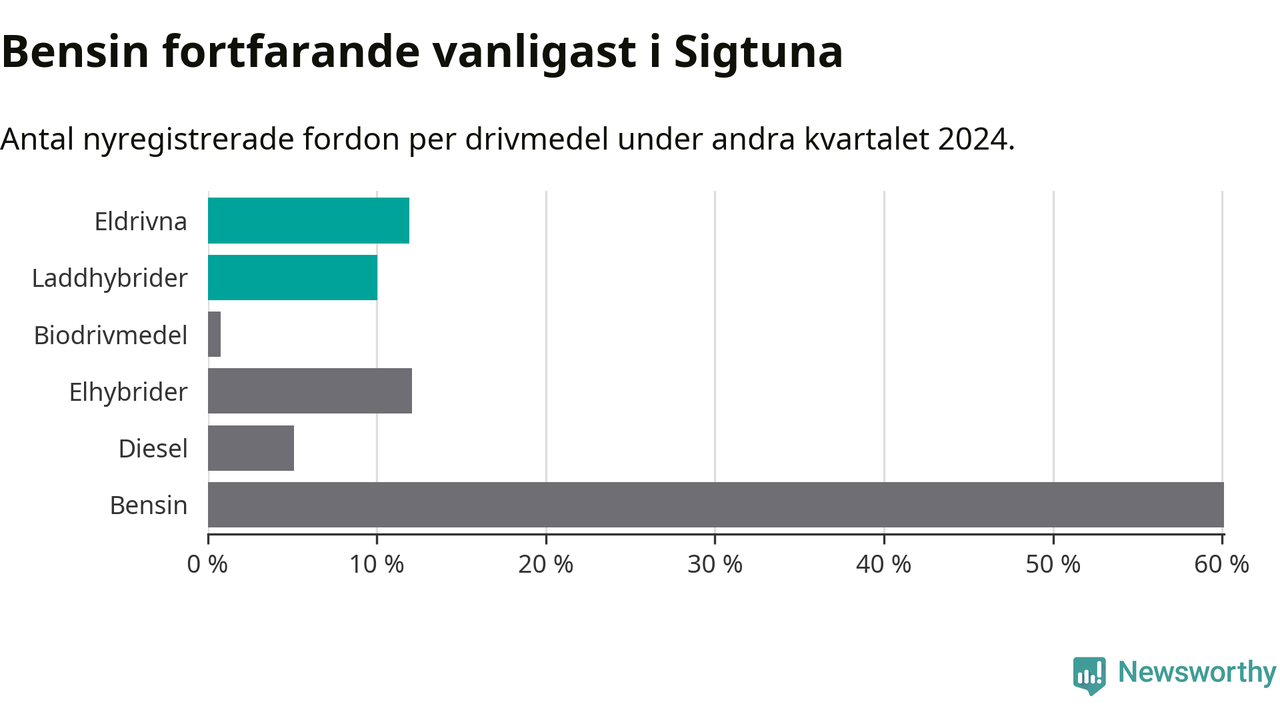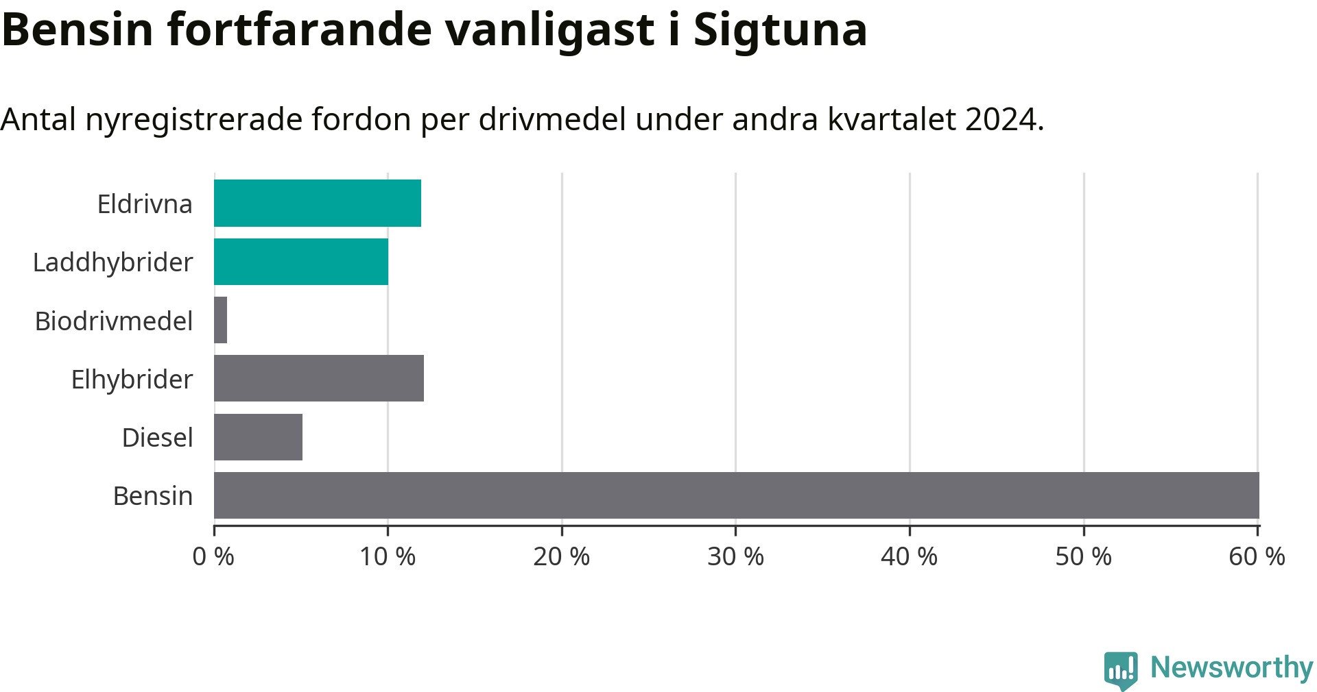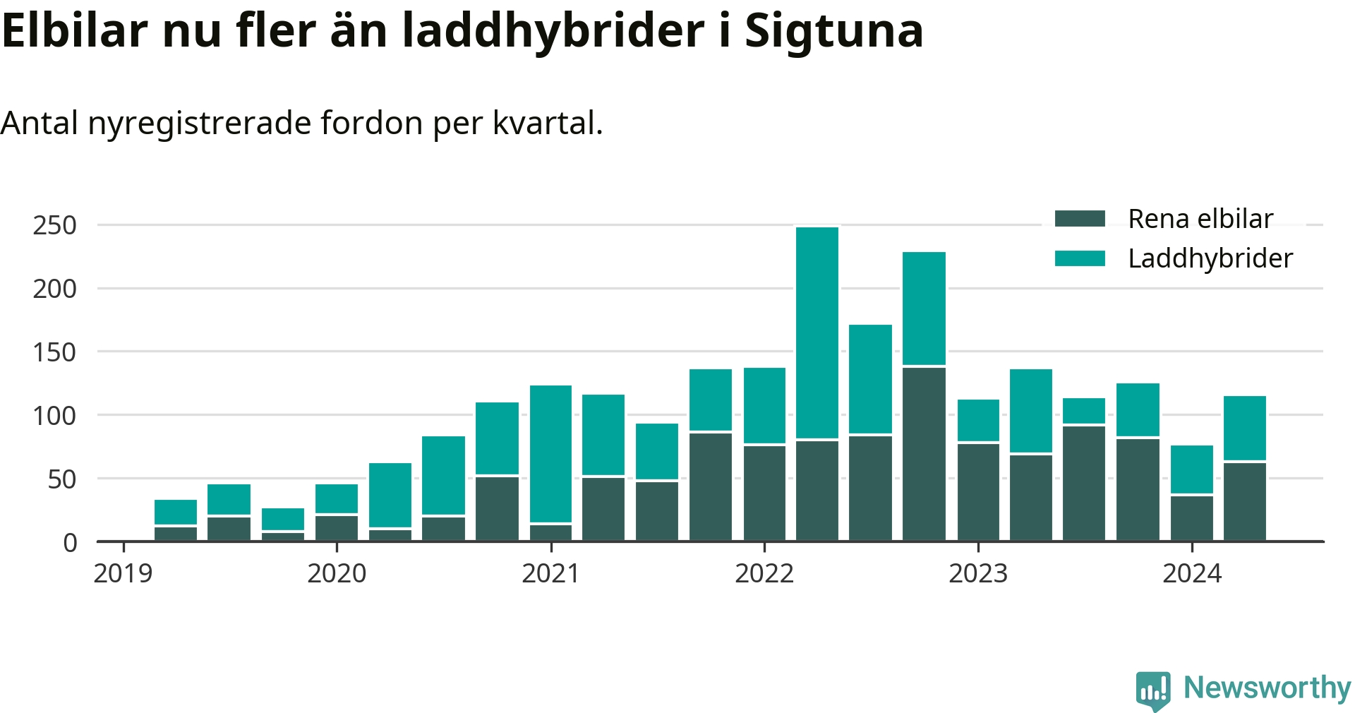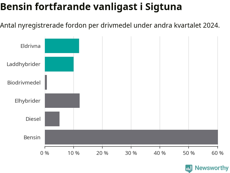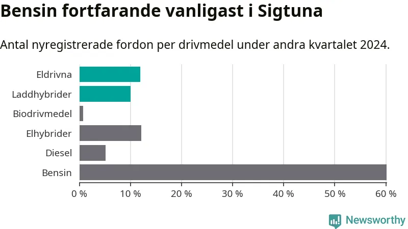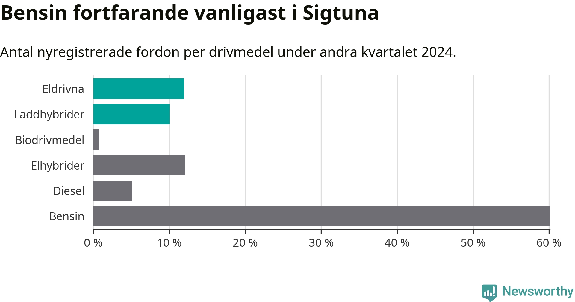 Under andra kvartalet 2024 var 22 procent av alla nyregistrerade personbilar i Sigtuna laddbara (sammanlagt registrerades 529 nya bilar). Merparten av de laddbara bilarna var rena elbilar (12 procent av alla).