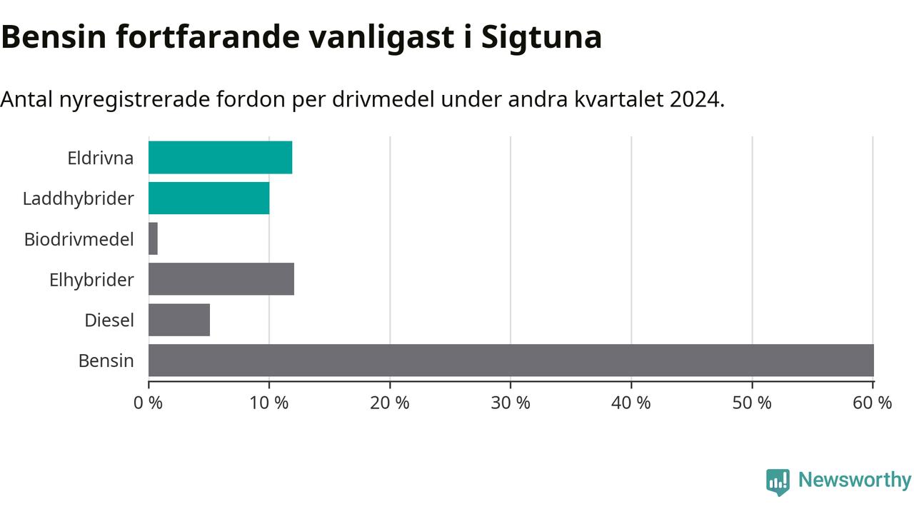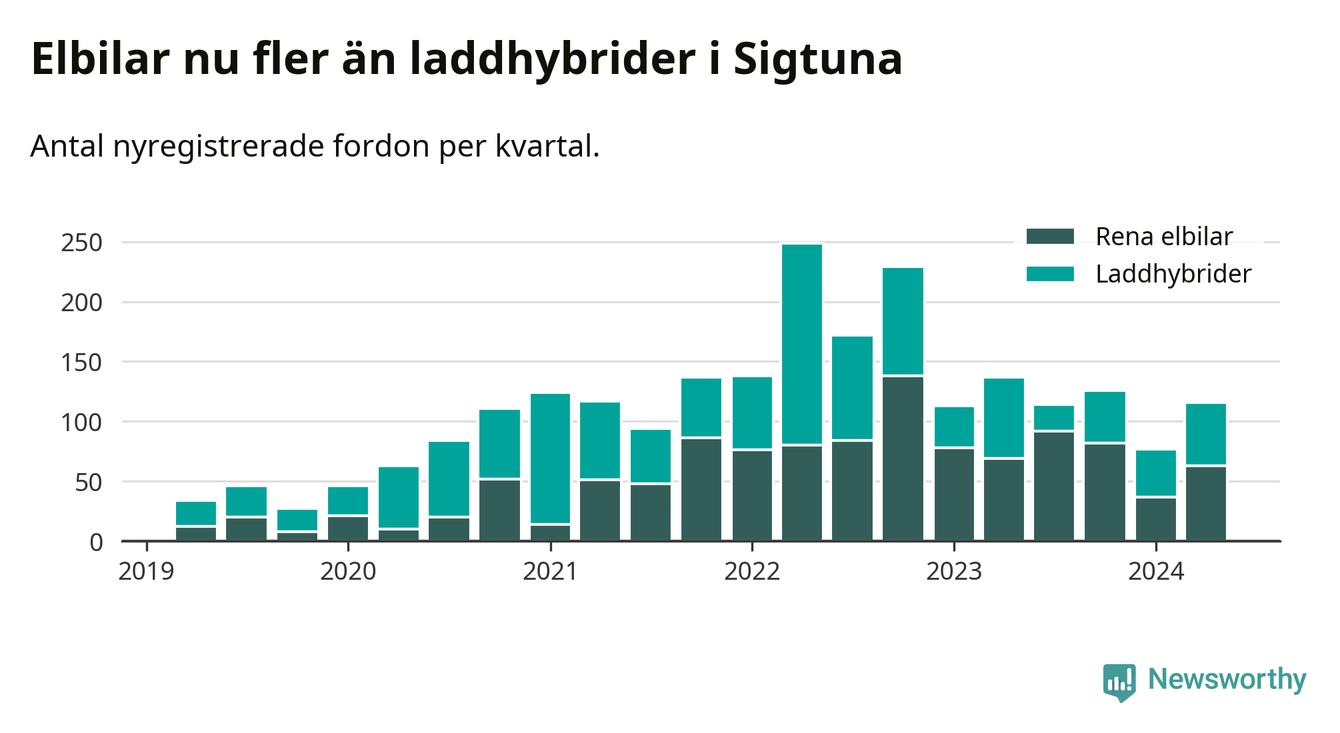 Jämfört med andra kommuner säljs det förhållandevis få elbilar och laddhybrider i Sigtuna. Under andra kvartalet var nyregistreringen 17:e lägst i hela landet (bland 290 kommuner).