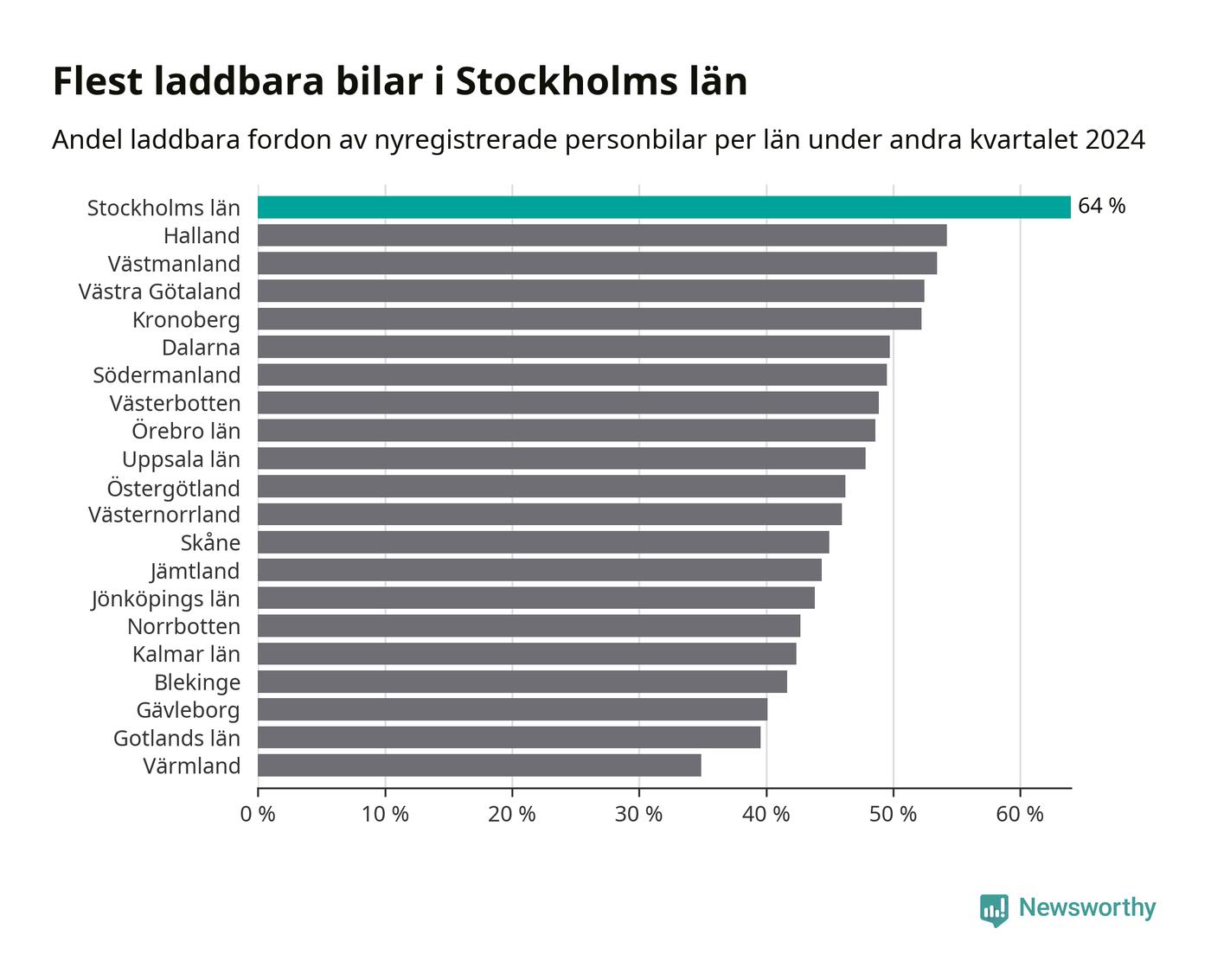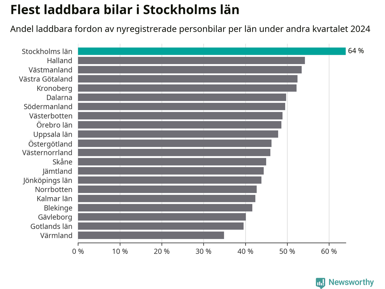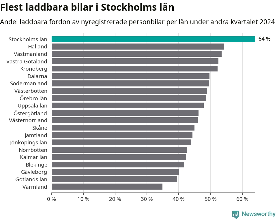 I hela landet var 54 procent av alla nya bilar laddbara under andra kvartalet. Det är framför allt Stockholms län som drar upp snittet, vilket till stor del förklaras av att många leasingföretag har sitt säte i länet. I Stockholms län var 64 procent av nyregistrerade bilar laddbara.