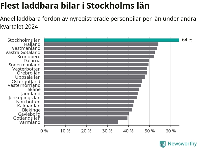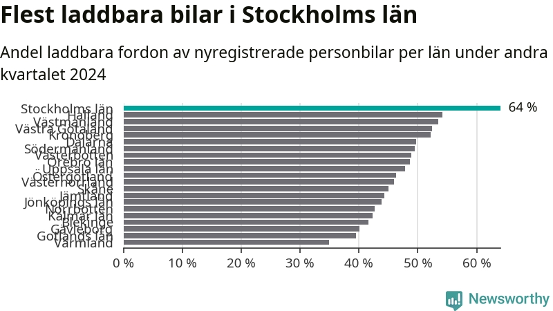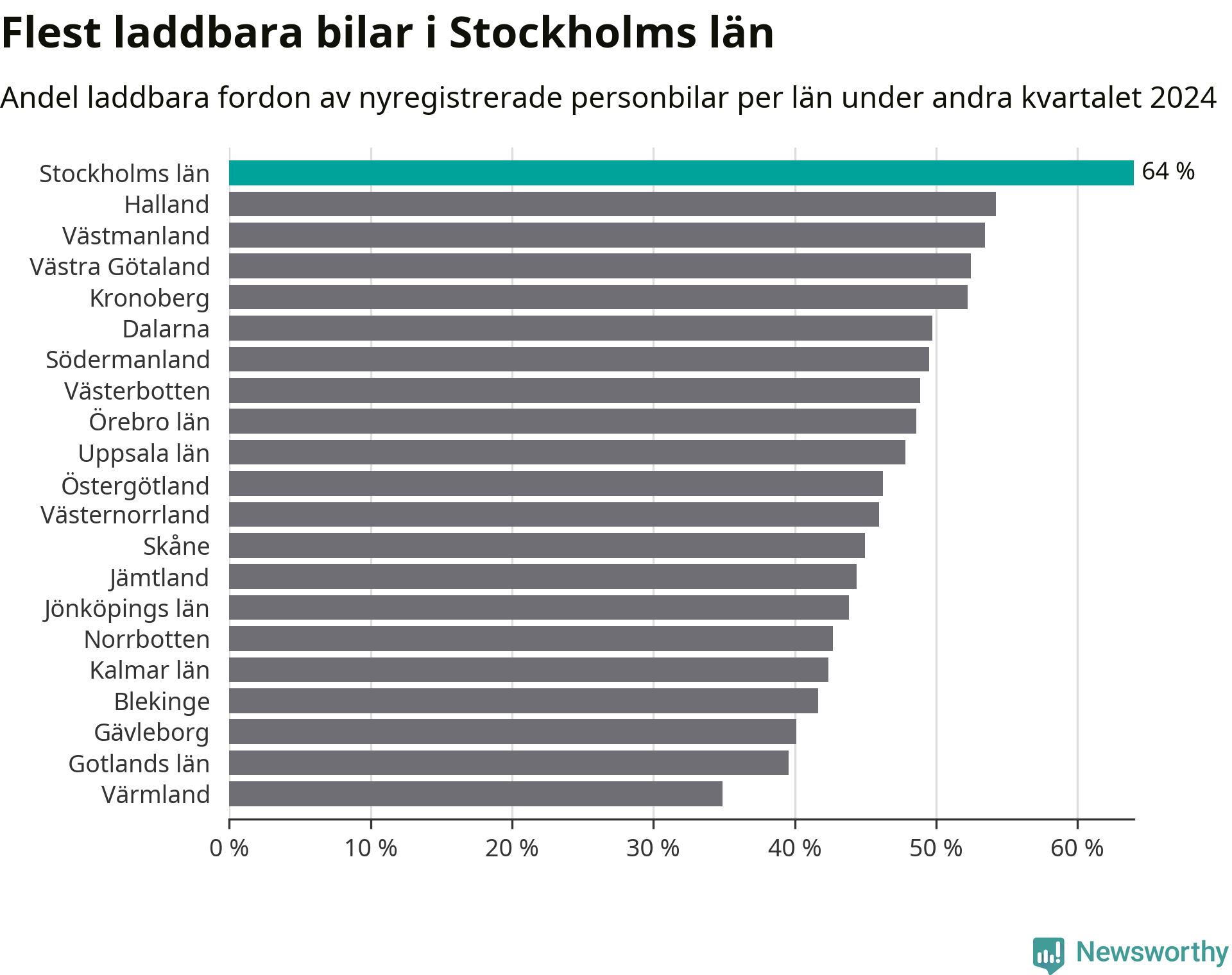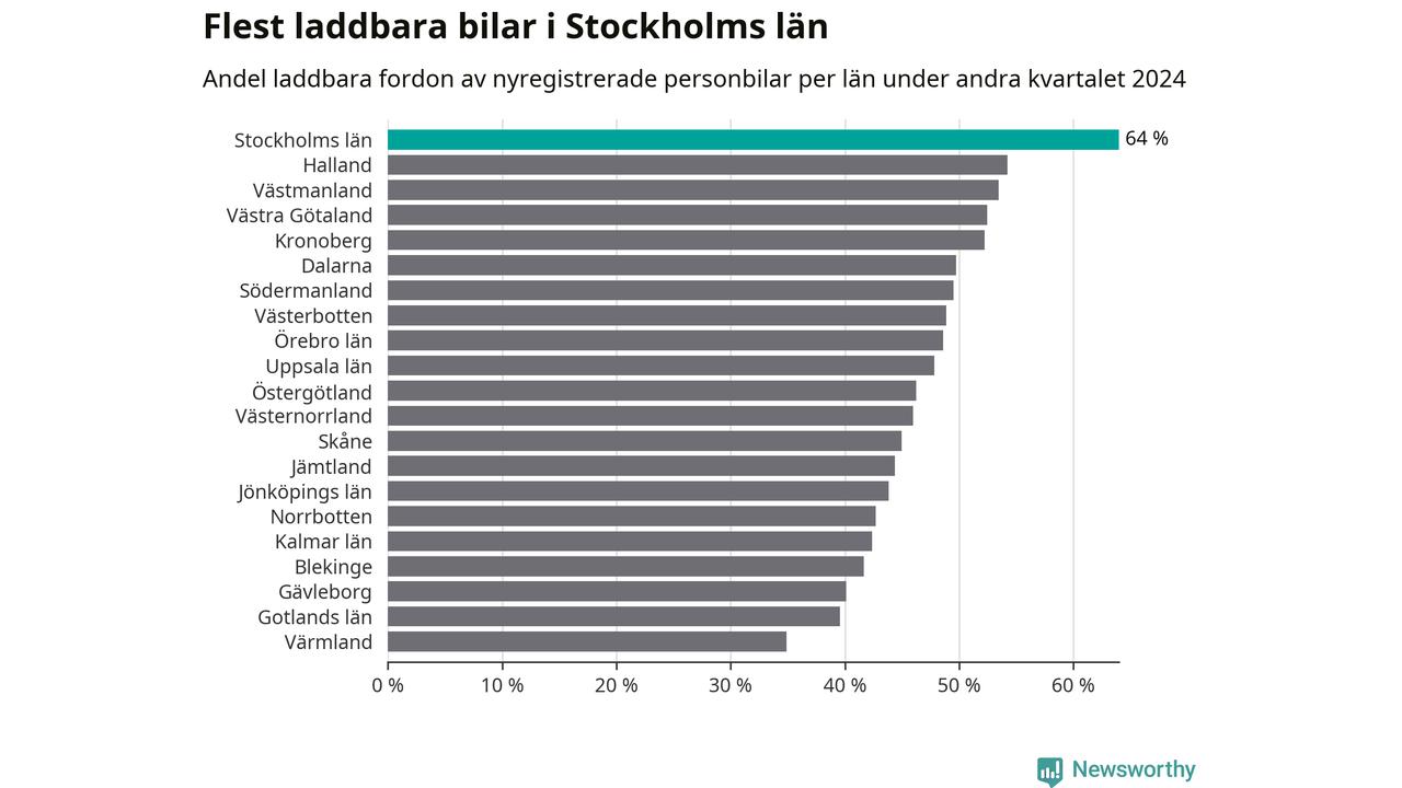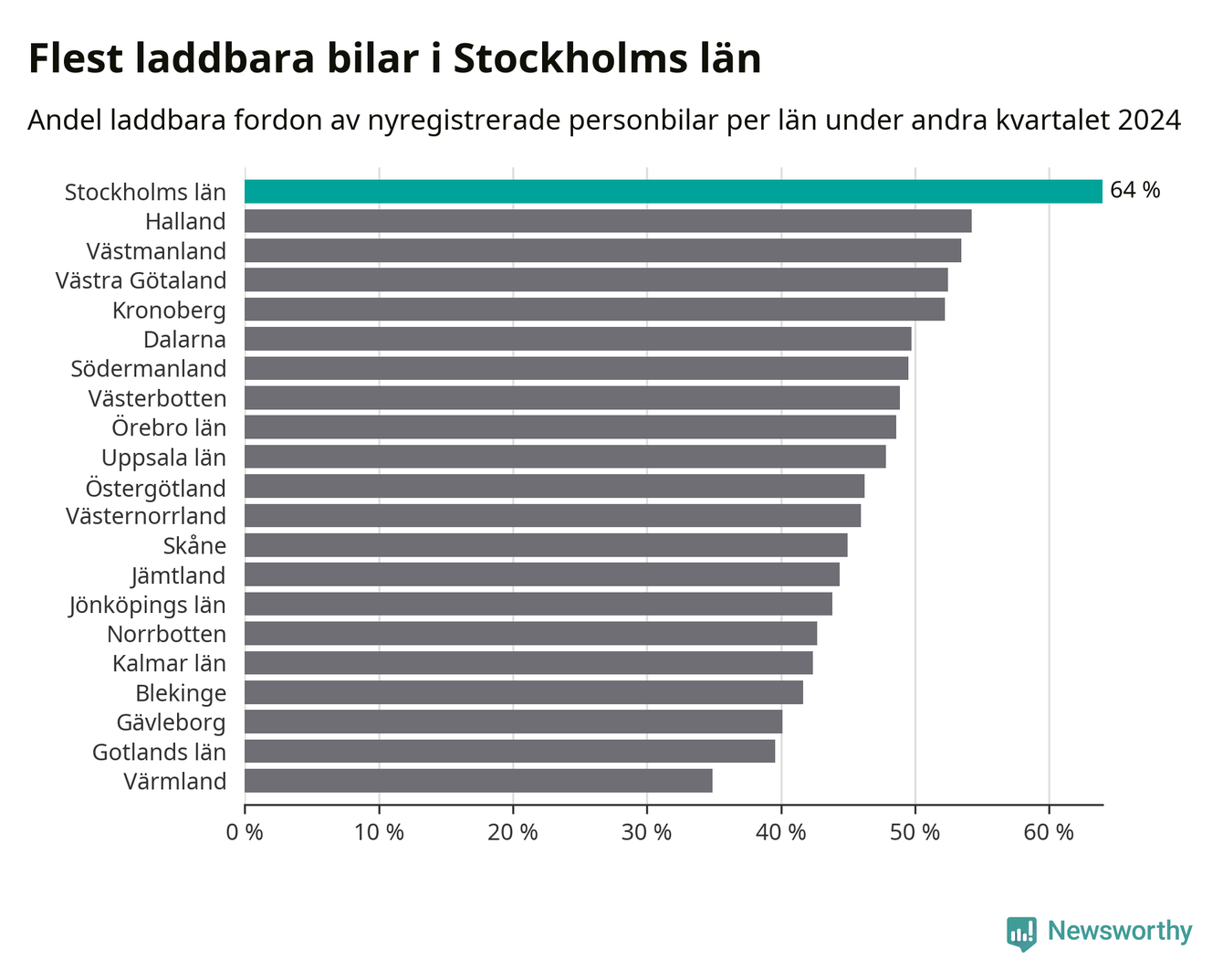 I hela landet var 54 procent av alla nya bilar laddbara under andra kvartalet. Det är framför allt Stockholms län som drar upp snittet, vilket till stor del förklaras av att många leasingföretag har sitt säte i länet. I Stockholms län var 64 procent av nyregistrerade bilar laddbara.