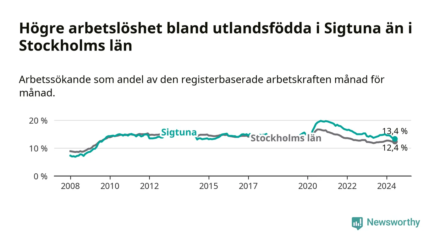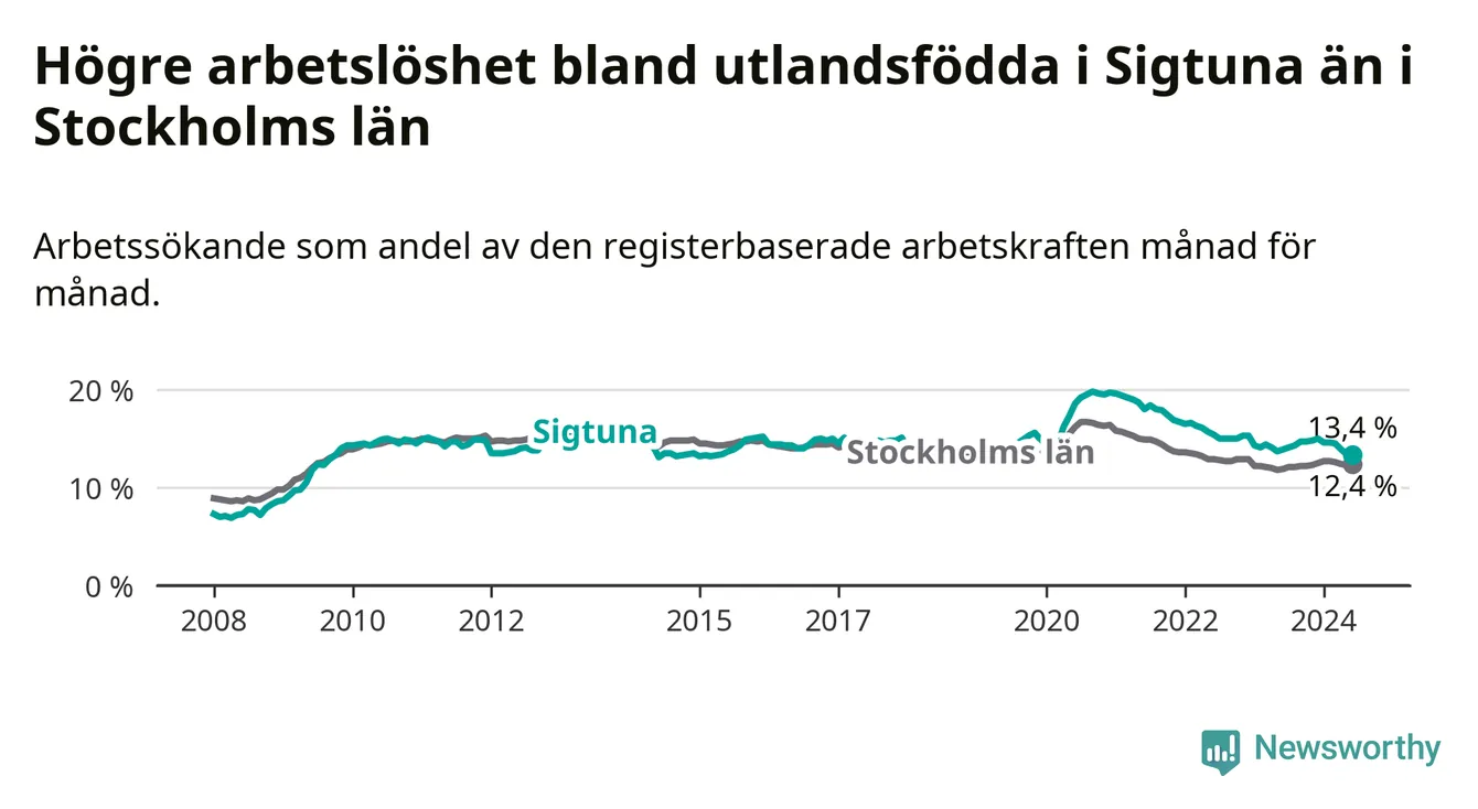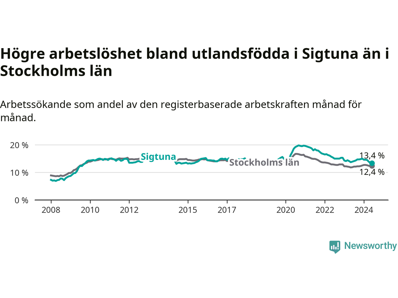 Medan arbetslösheten bland utlandsfödda alltså minskar i Sigtuna så ökar den i Stockholms län. Jämfört med juni förra året har andelen arbetslösa utlandsfödda i länet ökat med 0,5 procentenheter (till 12,4 procent). Trots den senaste nedgången har Sigtuna med andra ord fortfarande högre arbetslöshet bland utlandsfödda än Stockholms län.