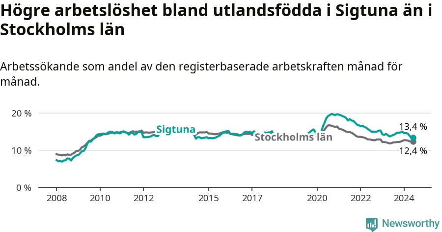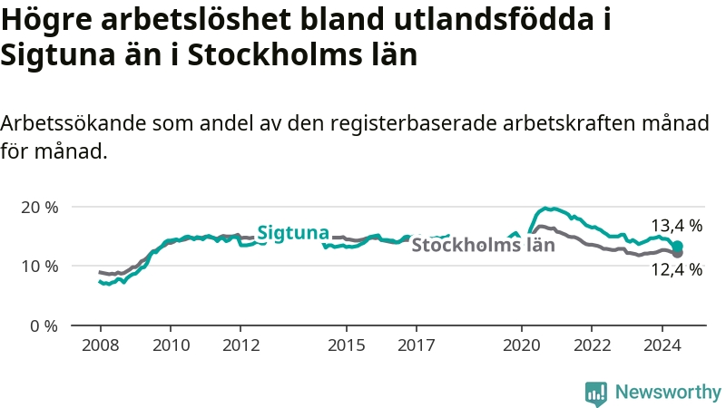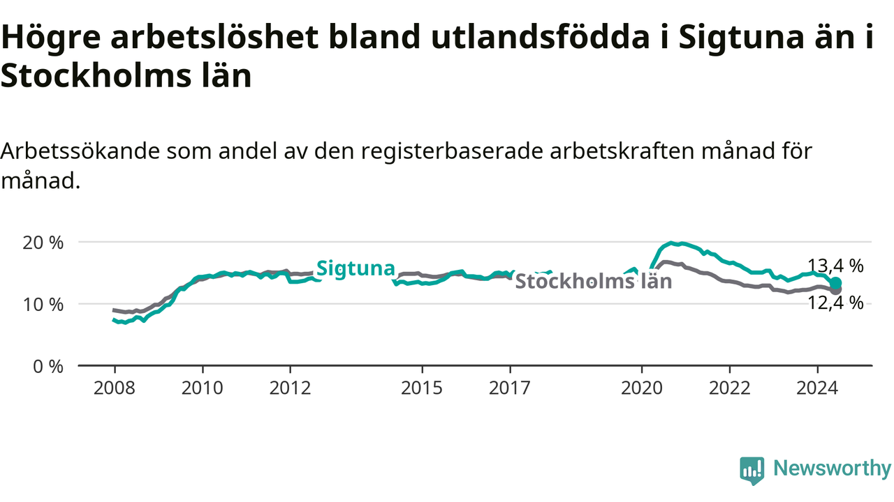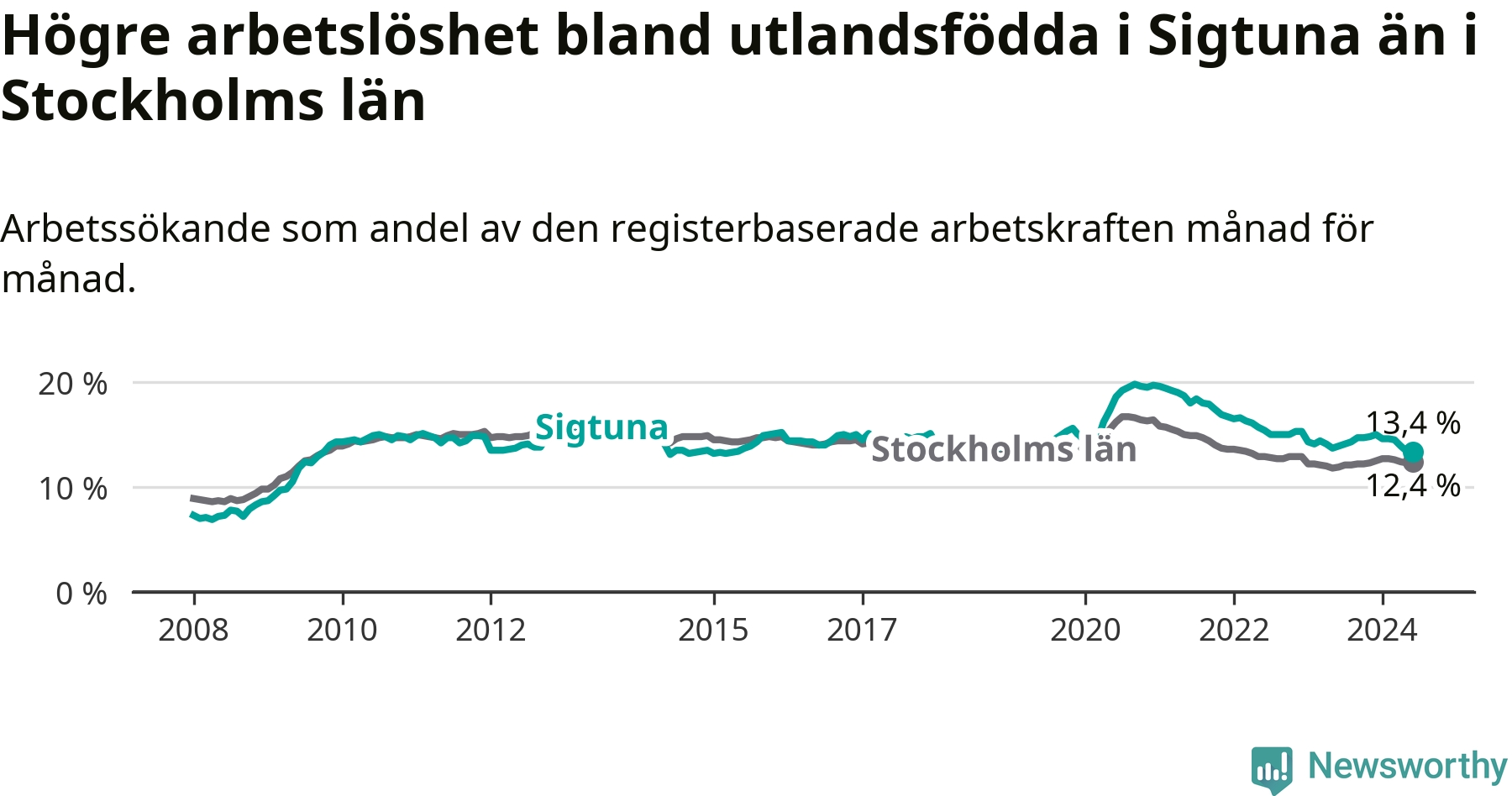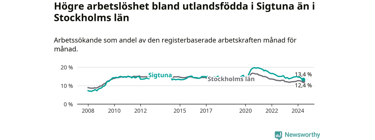 Medan arbetslösheten bland utlandsfödda alltså minskar i Sigtuna så ökar den i Stockholms län. Jämfört med juni förra året har andelen arbetslösa utlandsfödda i länet ökat med 0,5 procentenheter (till 12,4 procent). Trots den senaste nedgången har Sigtuna med andra ord fortfarande högre arbetslöshet bland utlandsfödda än Stockholms län.