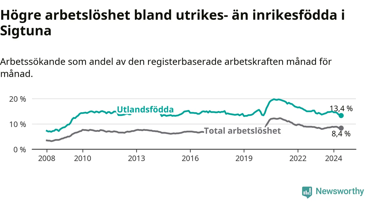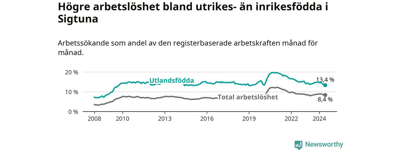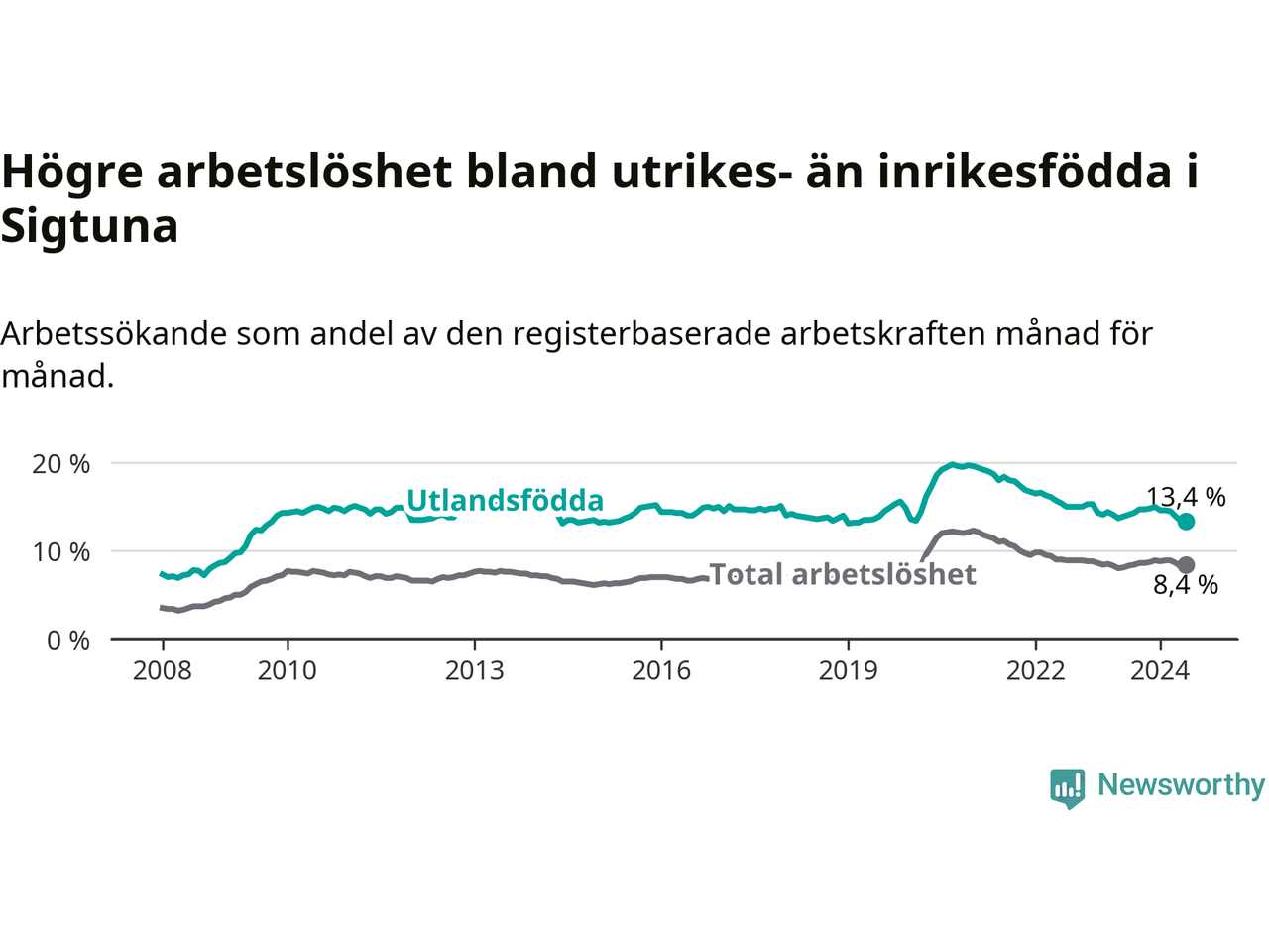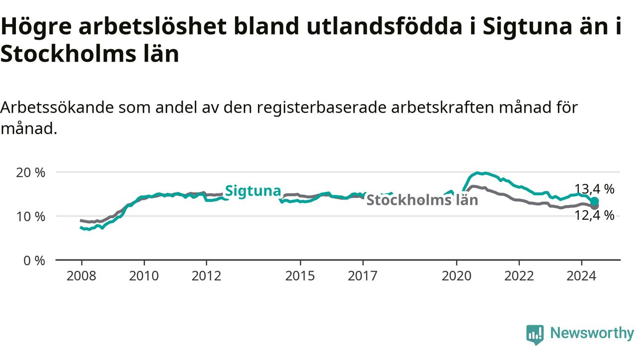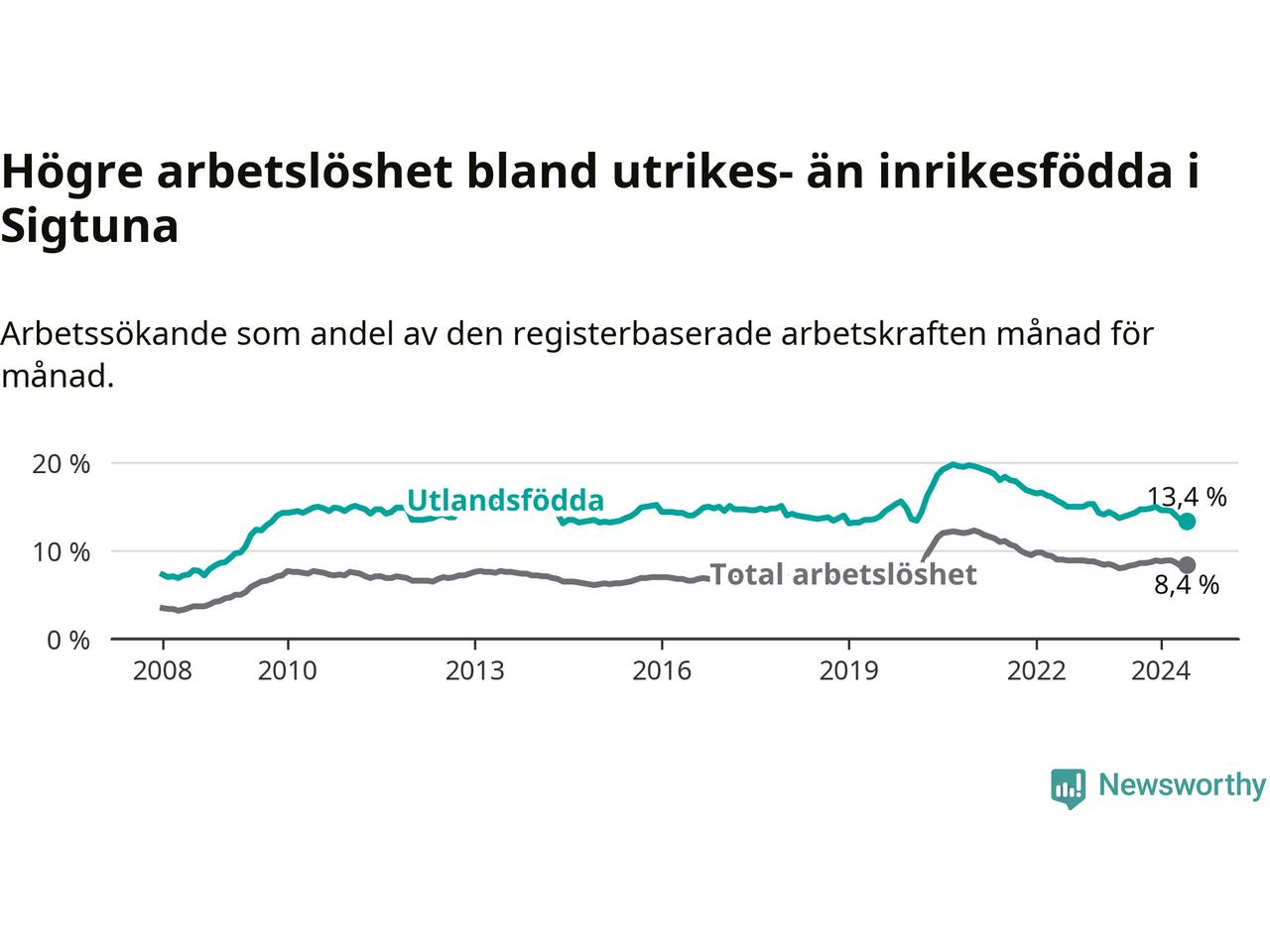Arbetslösheten bland utlandsfödda var 13,4 procent i Sigtuna under juni månad, motsvarande 1 674 av 12 493 personer. Det är 0,5 procentenheter färre än vid samma tidpunkt i fjol (+56 om man räknar personer).