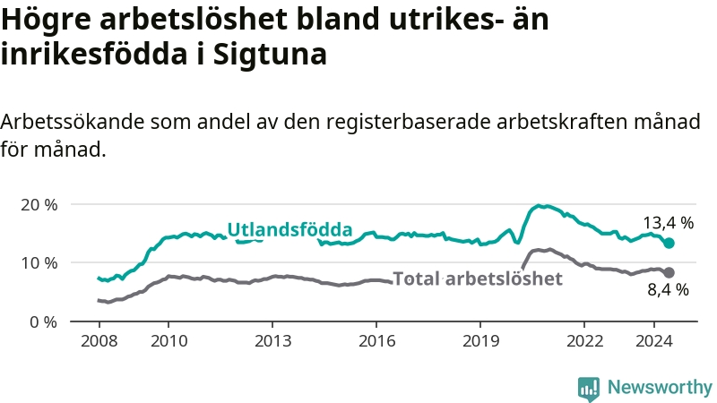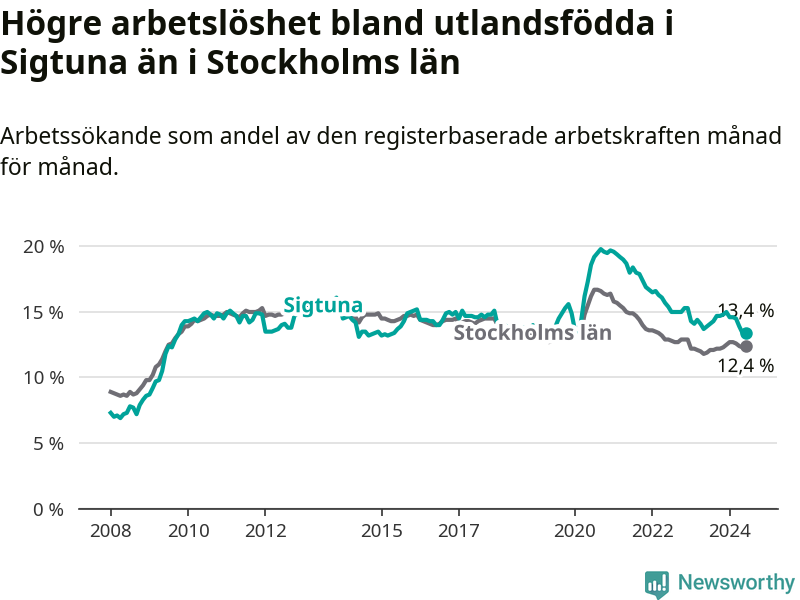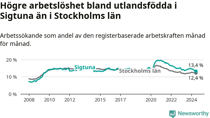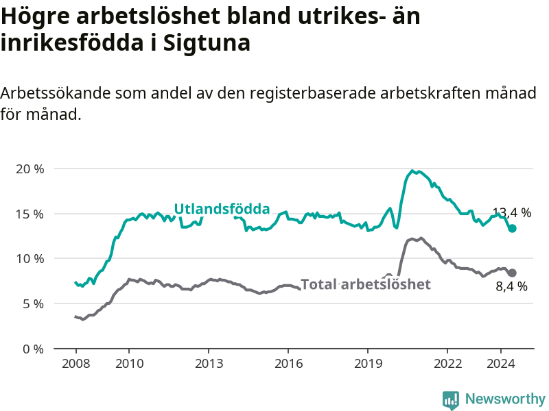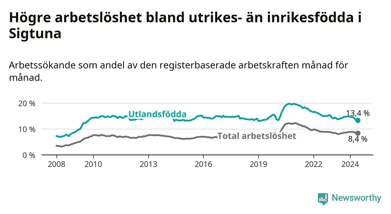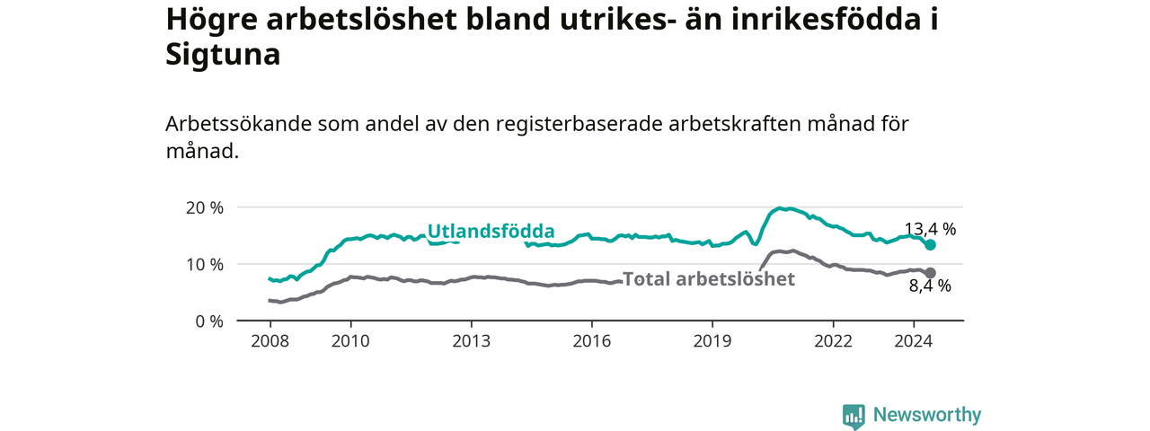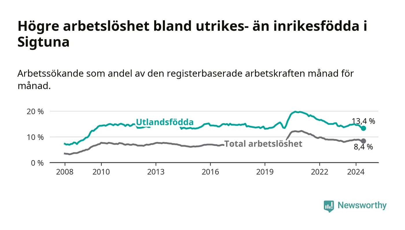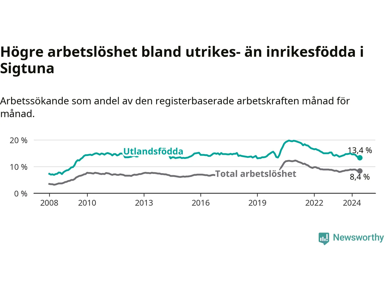 Arbetslösheten bland utlandsfödda var 13,4 procent i Sigtuna under juni månad, motsvarande 1 674 av 12 493 personer. Det är 0,5 procentenheter färre än vid samma tidpunkt i fjol (+56 om man räknar personer).
