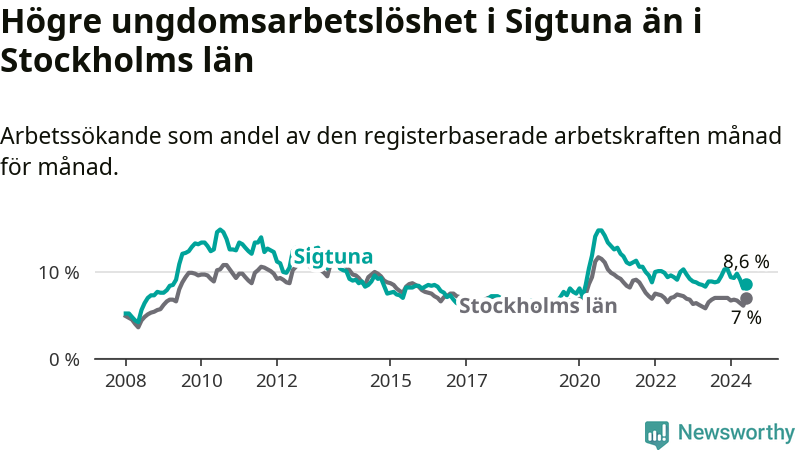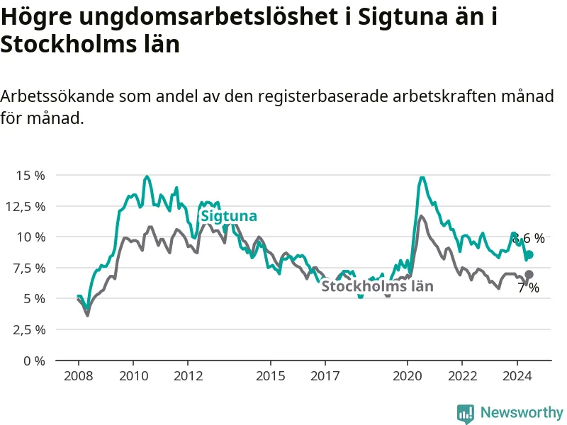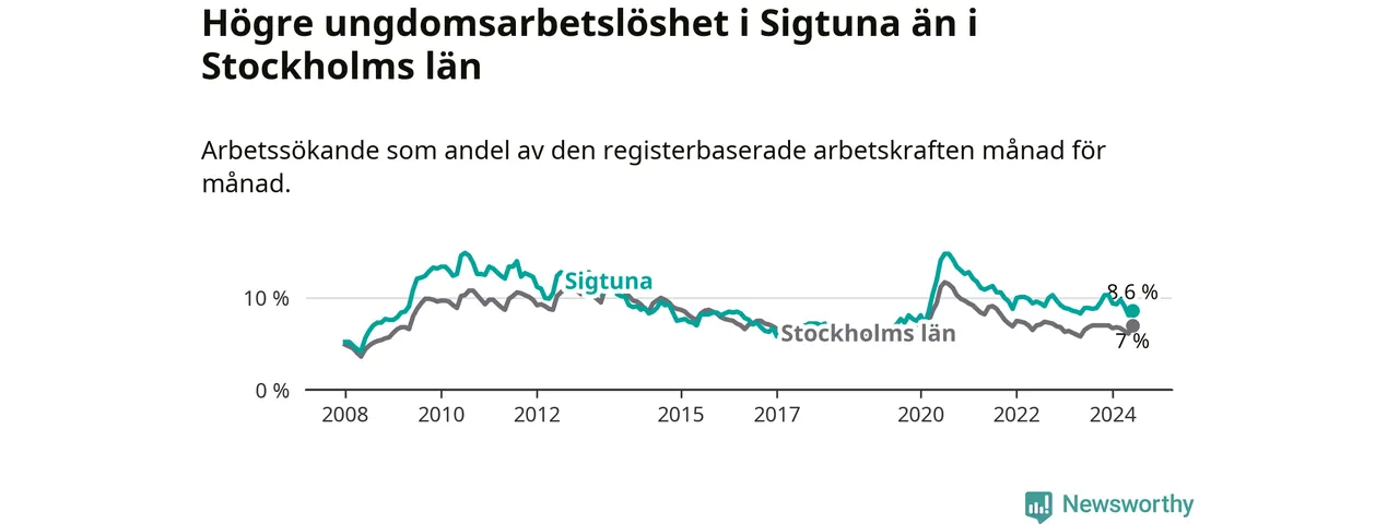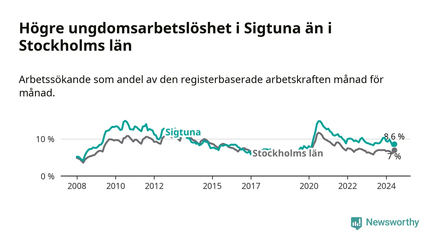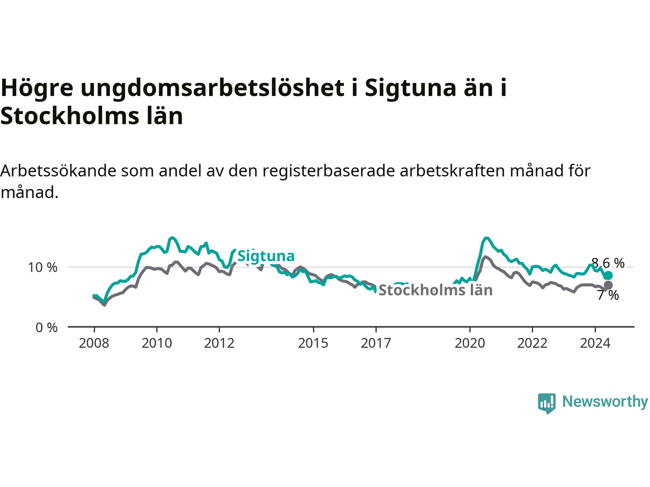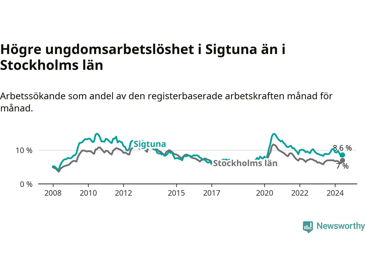 Precis som den totala arbetslösheten ligger ungdomsarbetslösheten i Sigtuna högre än i Stockholms län som helhet. Skillnaden mellan kommunen och länet är 1,6 procentenheter.
