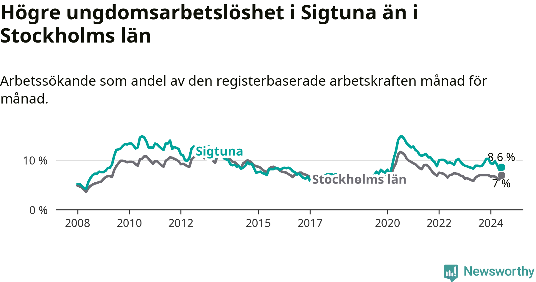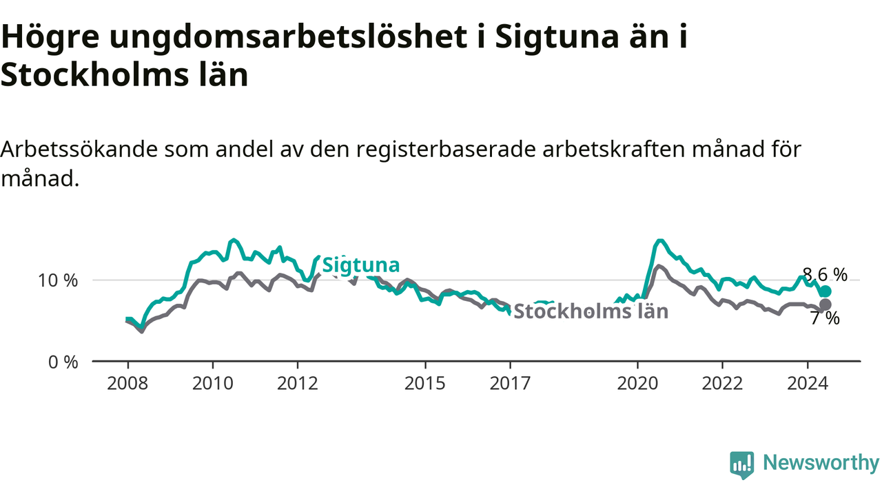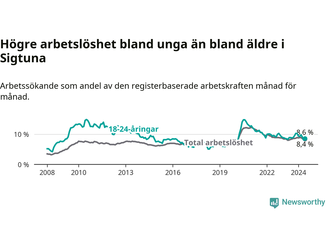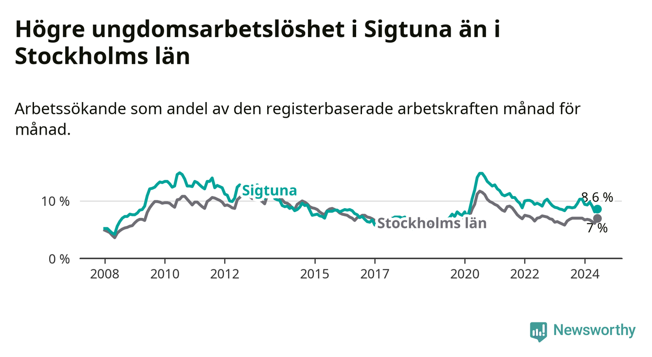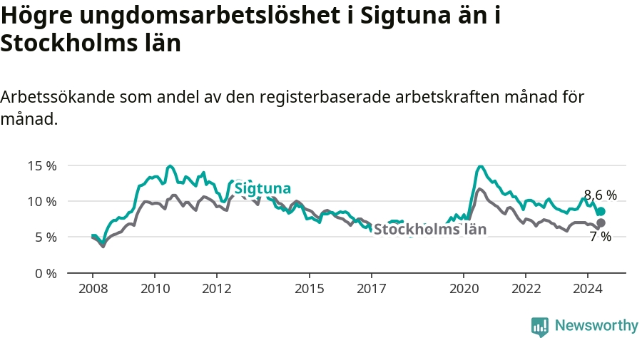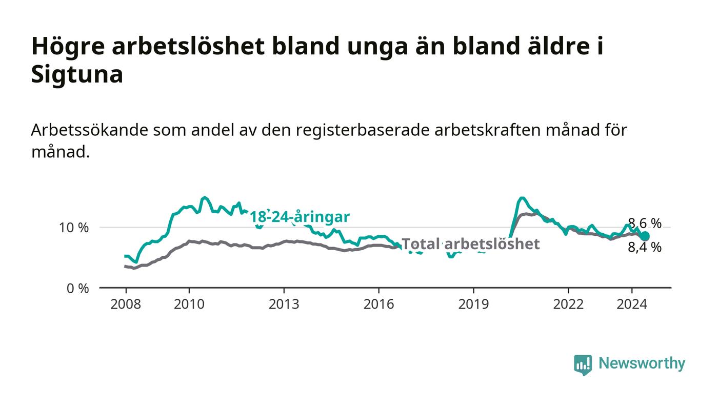 Precis som den totala arbetslösheten ligger ungdomsarbetslösheten i Sigtuna högre än i Stockholms län som helhet. Skillnaden mellan kommunen och länet är 1,6 procentenheter.