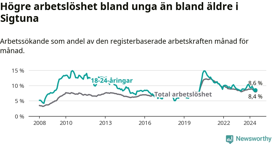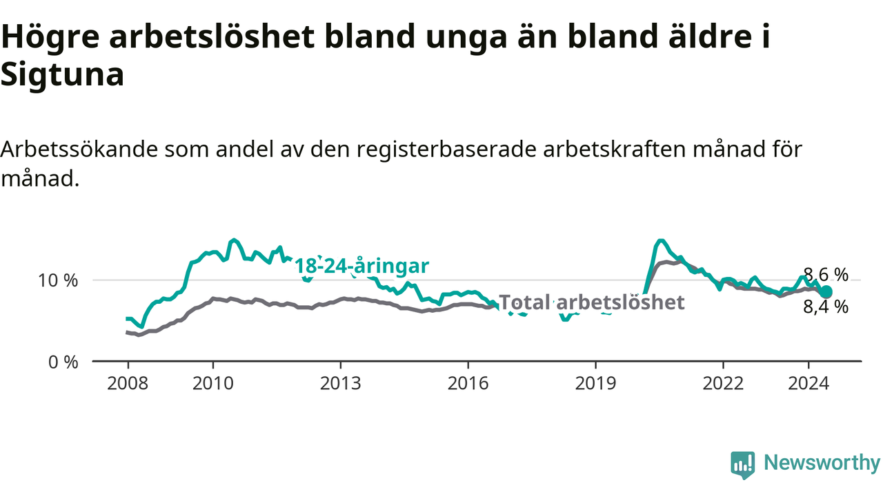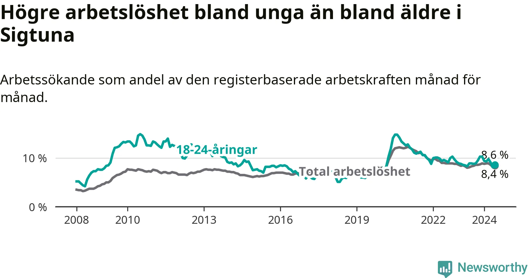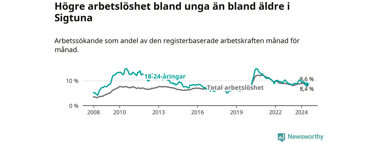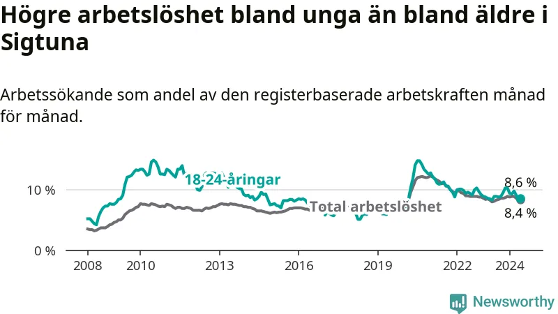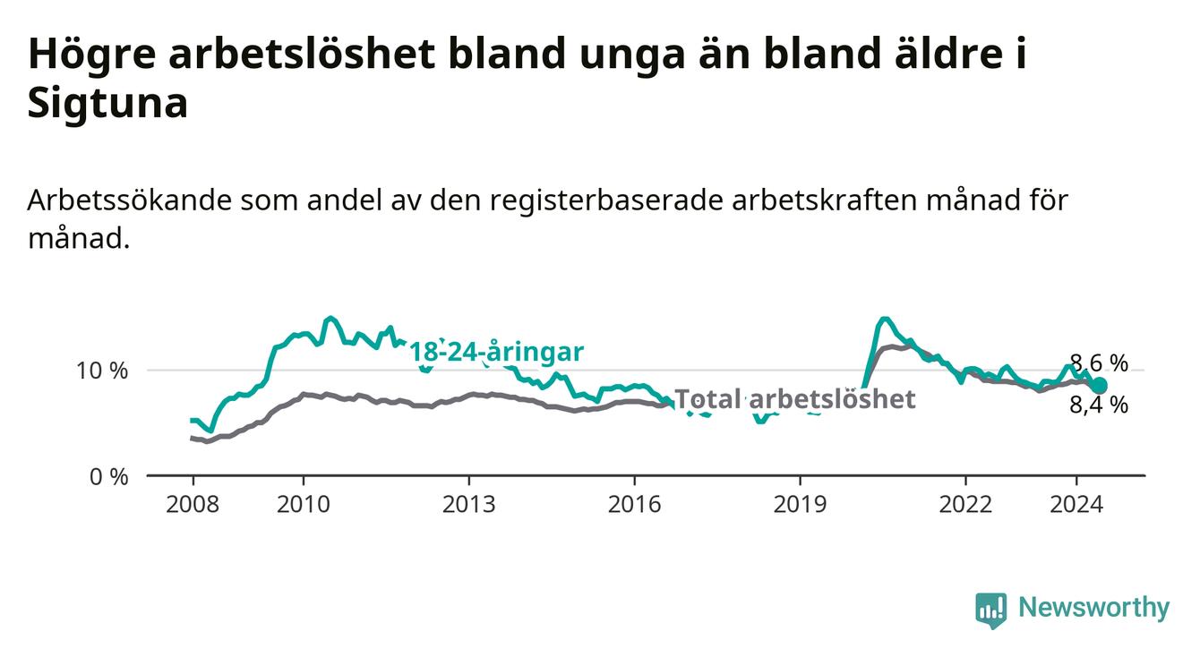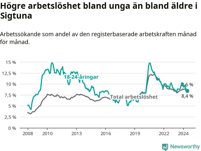 Precis som den totala arbetslösheten ligger ungdomsarbetslösheten i Sigtuna högre än i Stockholms län som helhet. Skillnaden mellan kommunen och länet är 1,6 procentenheter.