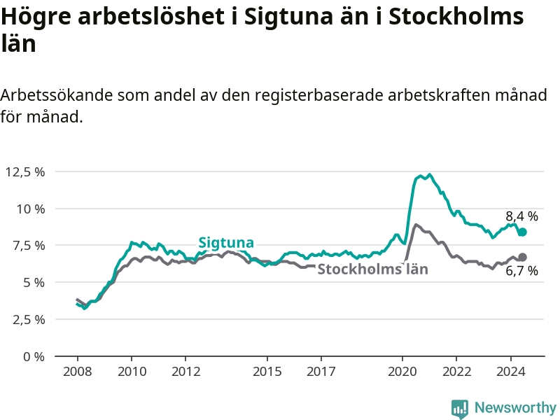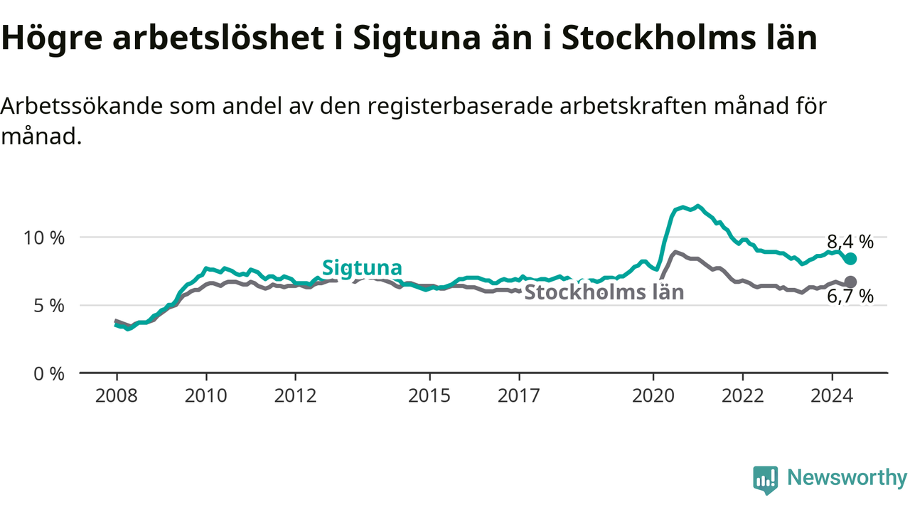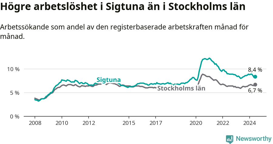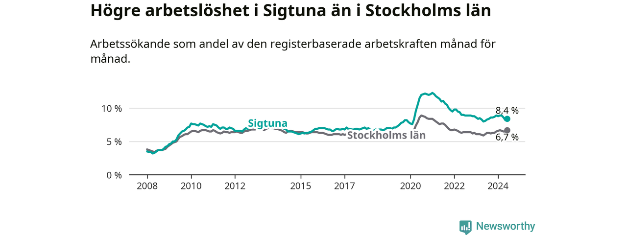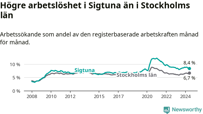 Under juni månad rapporterade Sigtuna kommun en total arbetslöshet på 8,4 procent. Det är en ökning jämfört med samma tidpunkt i fjol (+0,3 procentenheter). Även i Stockholms län stiger arbetslösheten .