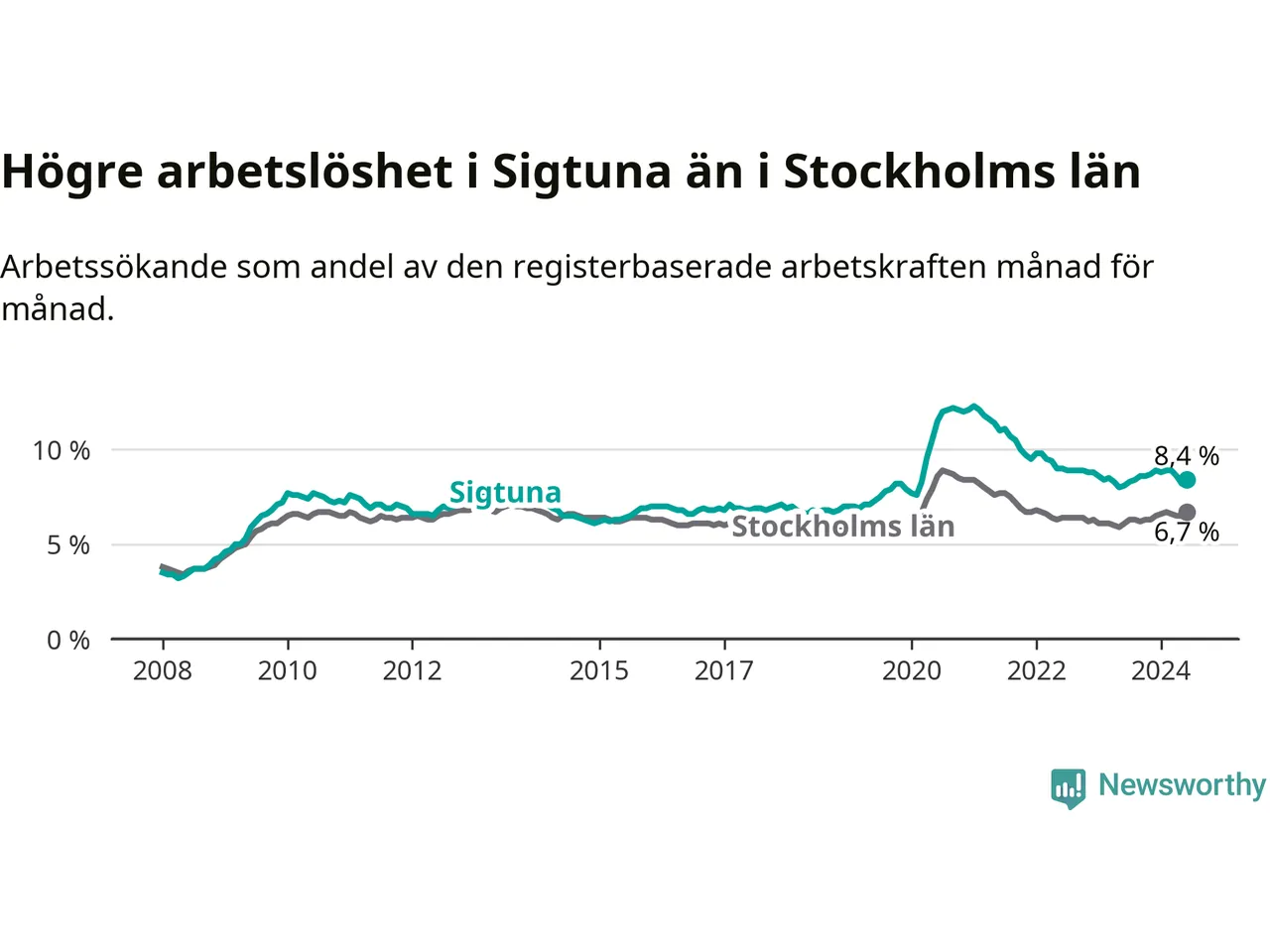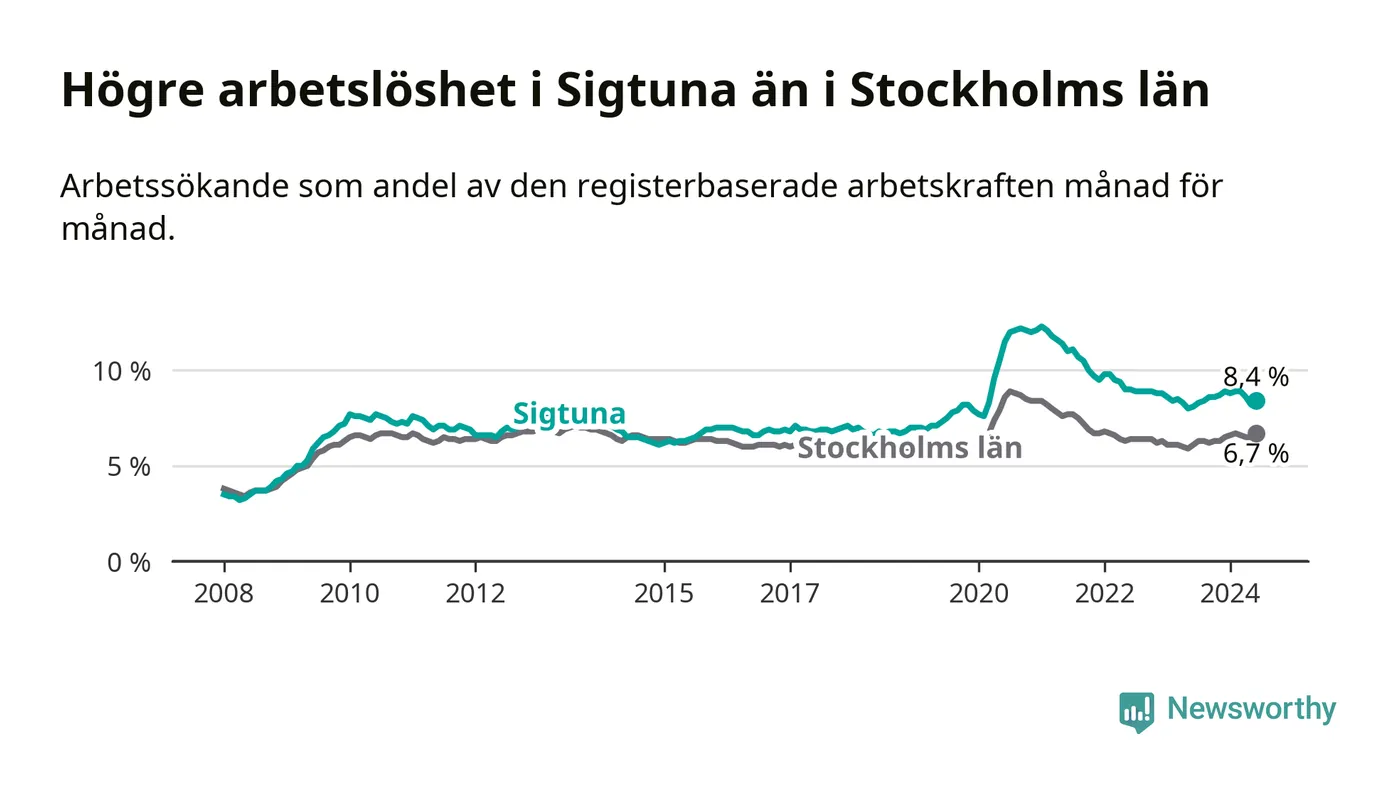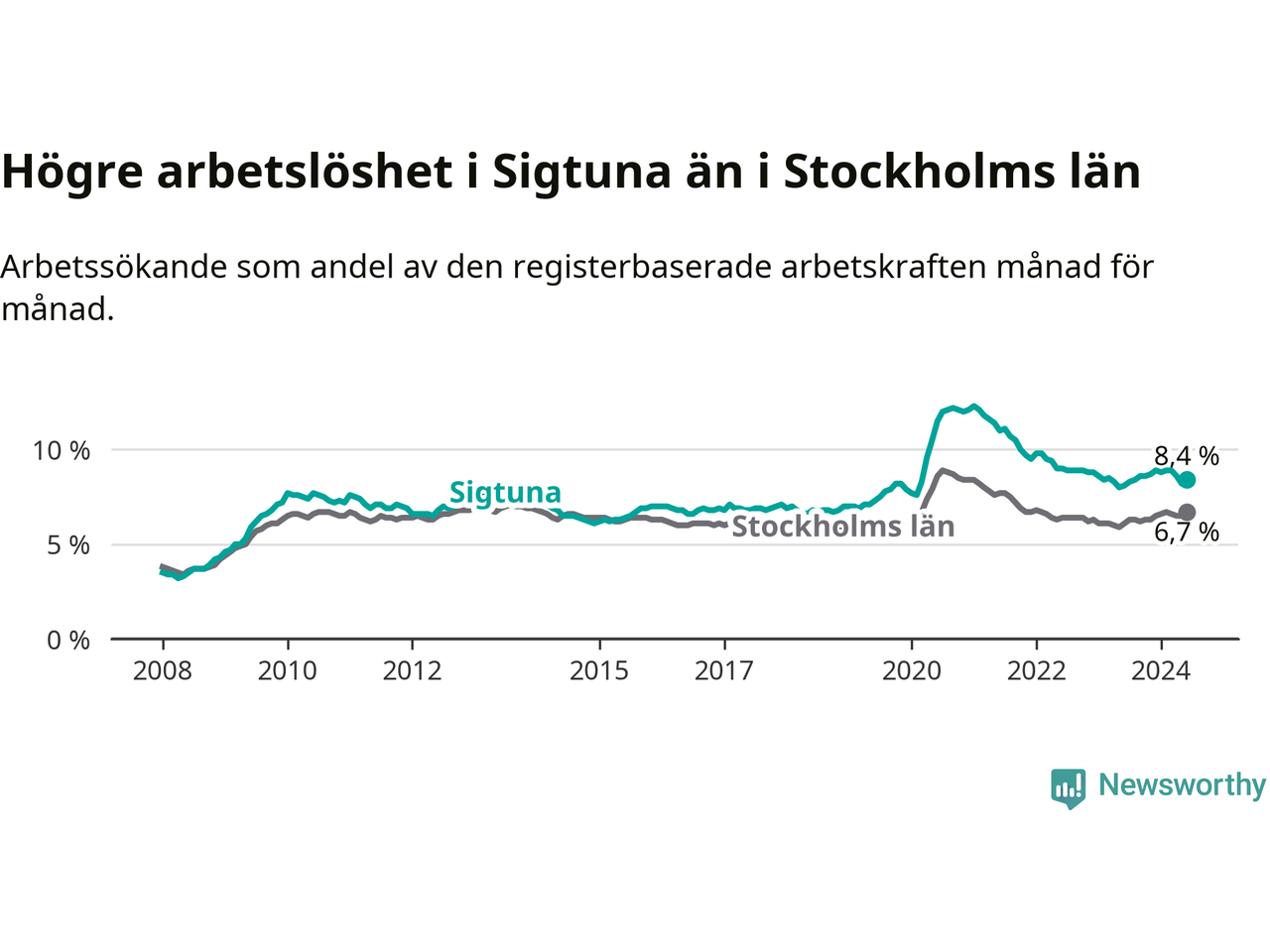 Sigtuna hade redan tidigare högre arbetslöshet än snittet i hela Stockholms län och nu växer klyftan (8,4 procent i kommunen, jämfört med 6,7 procent i hela länet). Ekerö har den lägsta arbetslösheten i länet (3,4 procent), medan Södertälje har den högsta (10,8 procent). För att Sigtuna skulle komma ner i samma arbetslöshetsnivå som Ekerö skulle 1 341 personer behöva sysselsättas.