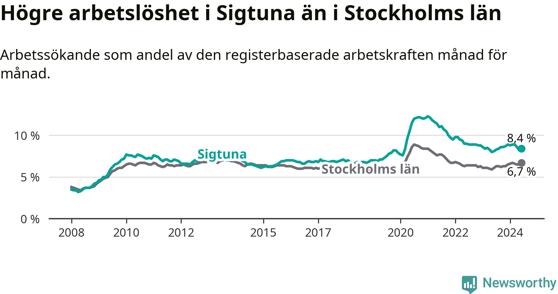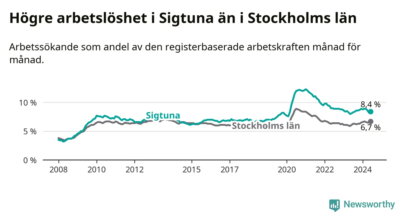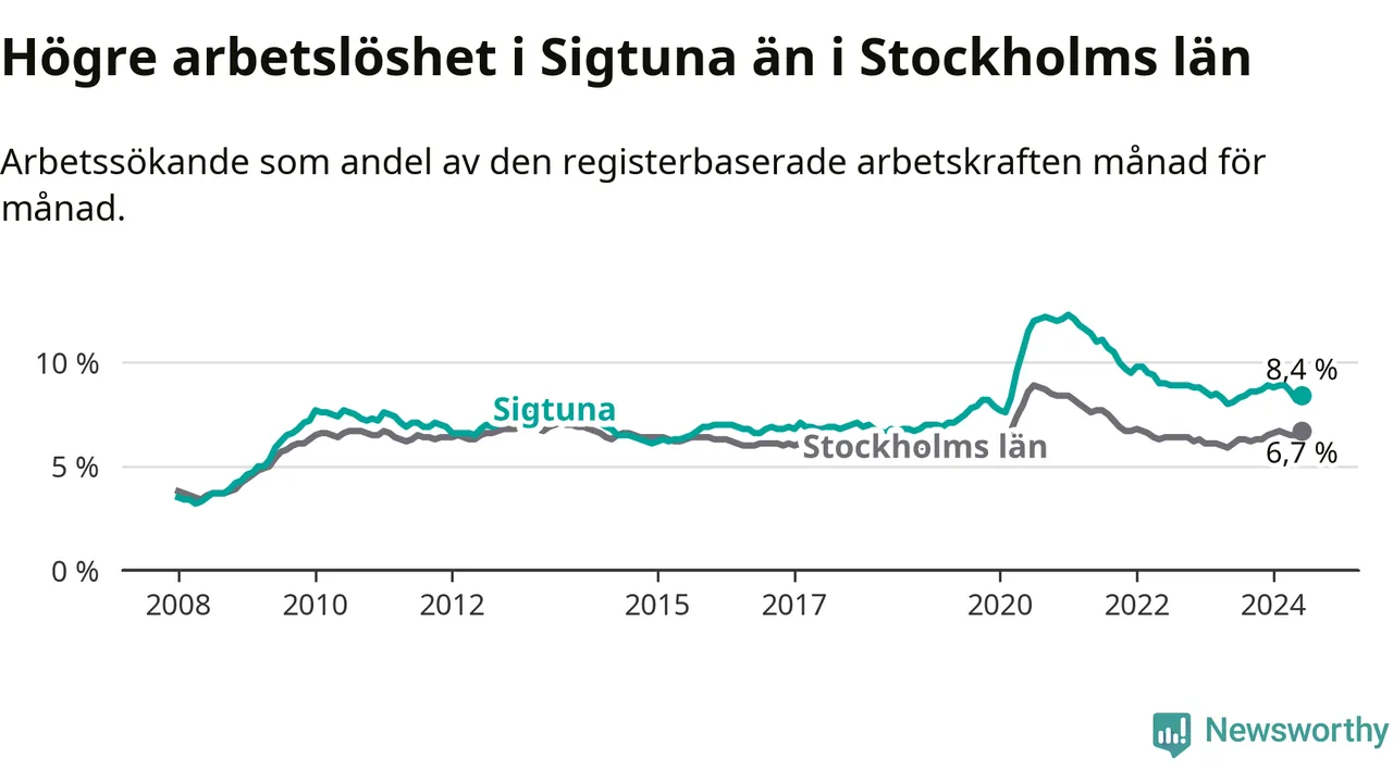 Sigtuna hade redan tidigare högre arbetslöshet än snittet i hela Stockholms län och nu växer klyftan (8,4 procent i kommunen, jämfört med 6,7 procent i hela länet). Ekerö har den lägsta arbetslösheten i länet (3,4 procent), medan Södertälje har den högsta (10,8 procent). För att Sigtuna skulle komma ner i samma arbetslöshetsnivå som Ekerö skulle 1 341 personer behöva sysselsättas.