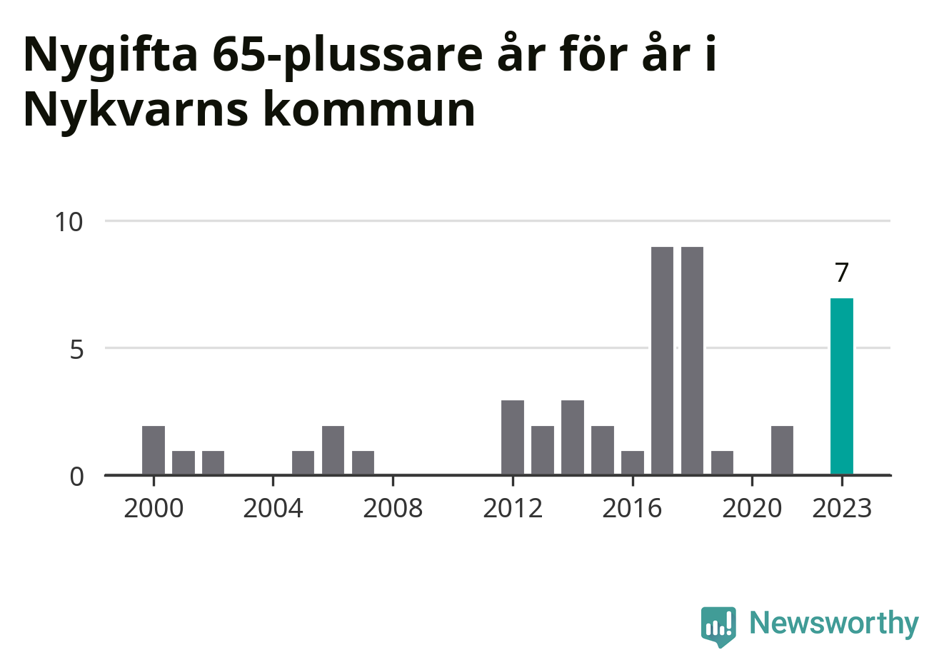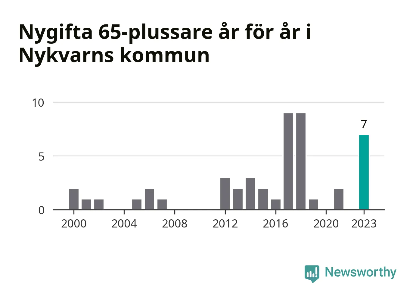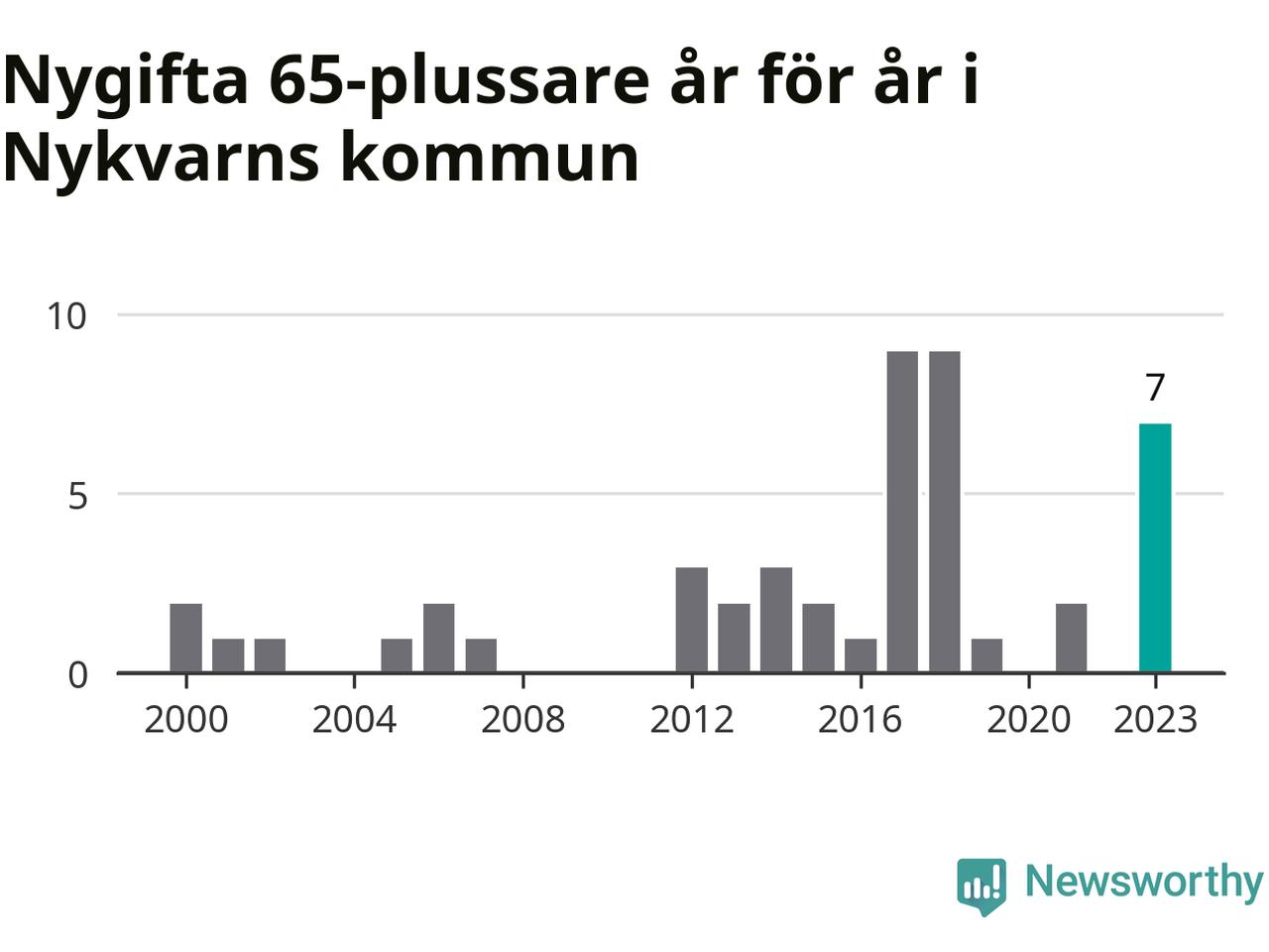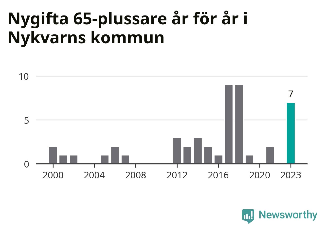 Åtta personer. Så många Nykvarnsbor gifte sig efter 65-årsdagen under hela 00-talet. Under det senaste decenniet, mellan 2014 och 2023, har samma siffra ökat till 34. Lite mer än en fyrdubbling, med andra ord.