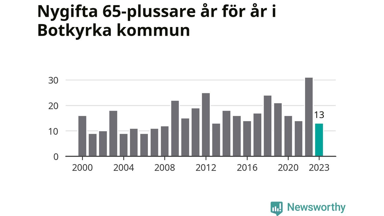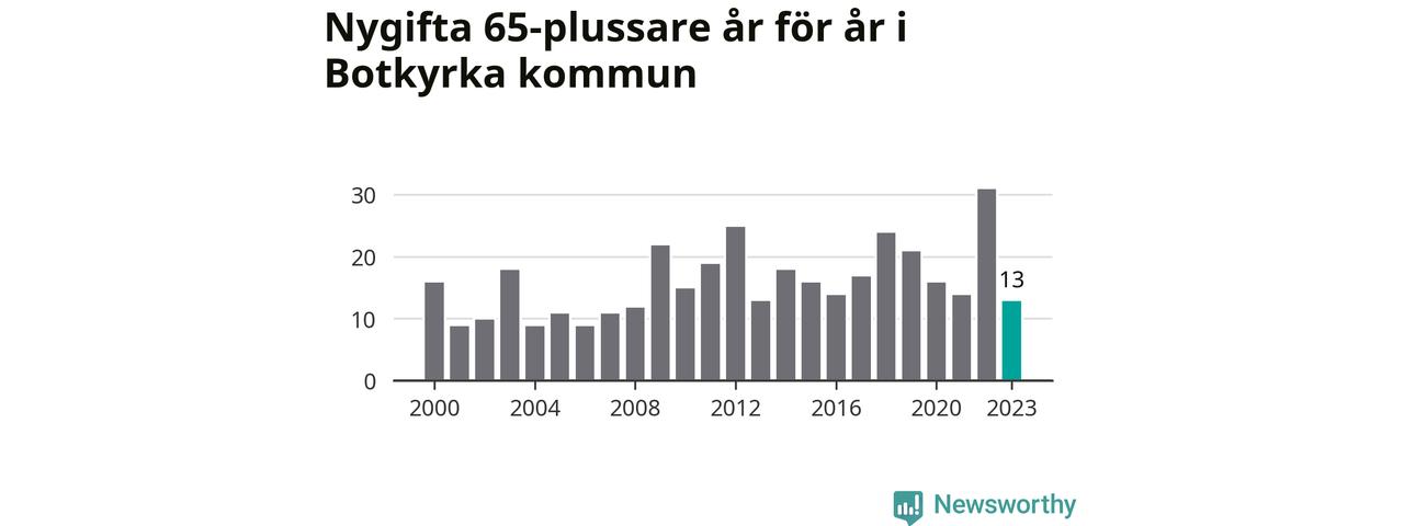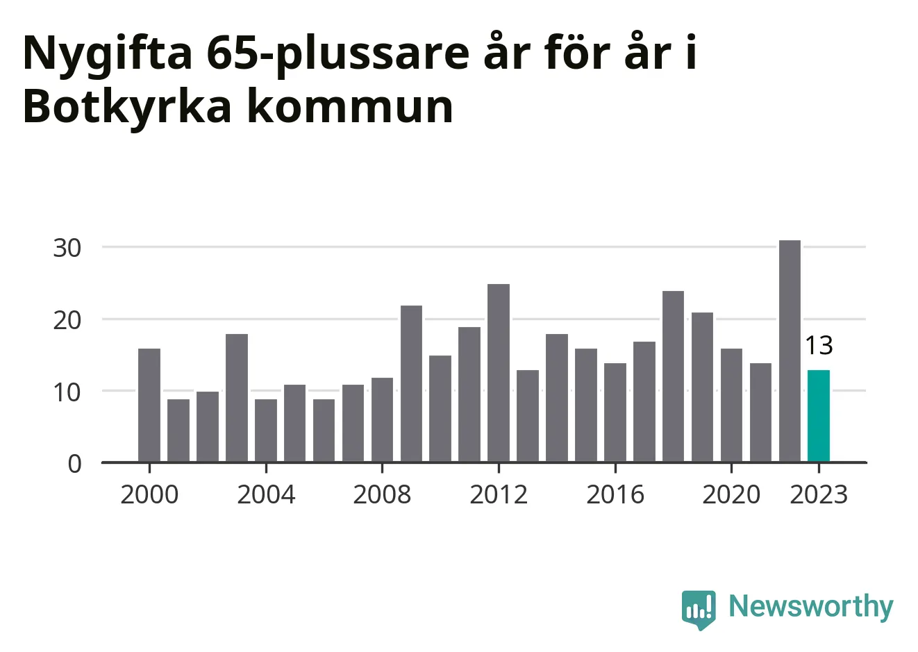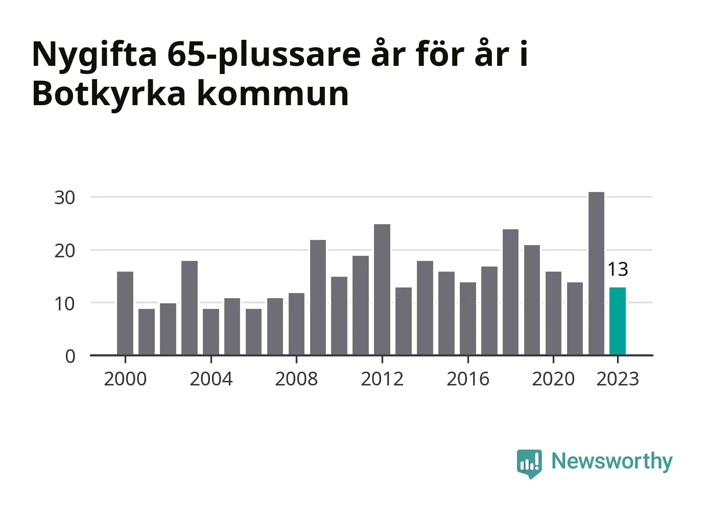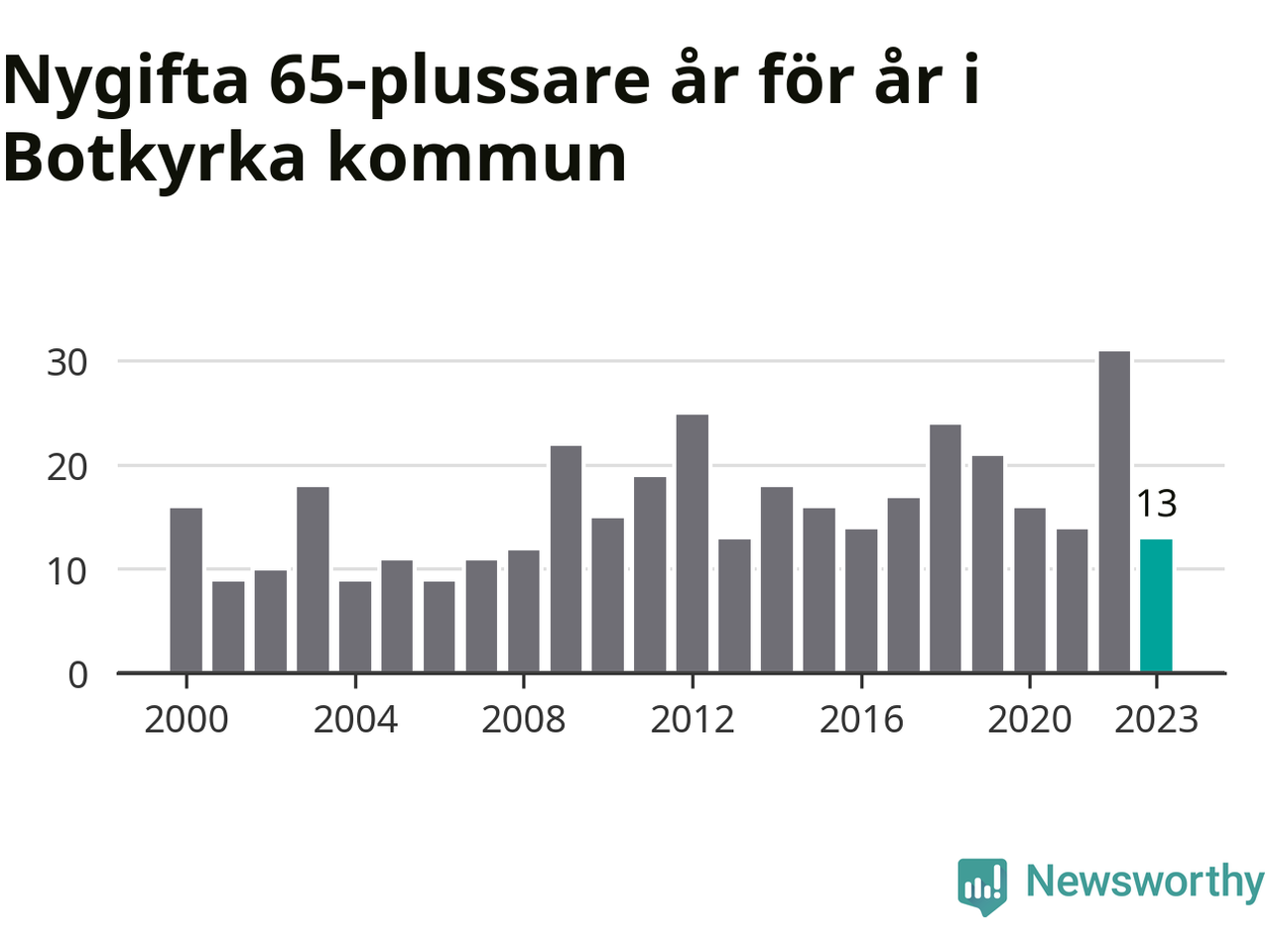 Vad gäller riket i stort ställde sig förra året totalt 80 747 svenskar framför en vigselförrättare och lovade sin partner trohet tills döden skilde dem åt. 2 986 av dem, eller 3,7 procent, hade vid det laget fyllt 65 år. Motsvarande procentandel var under 00-talet 1,3 procent.