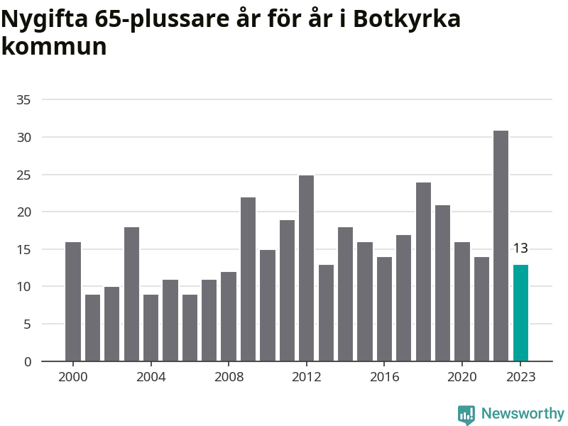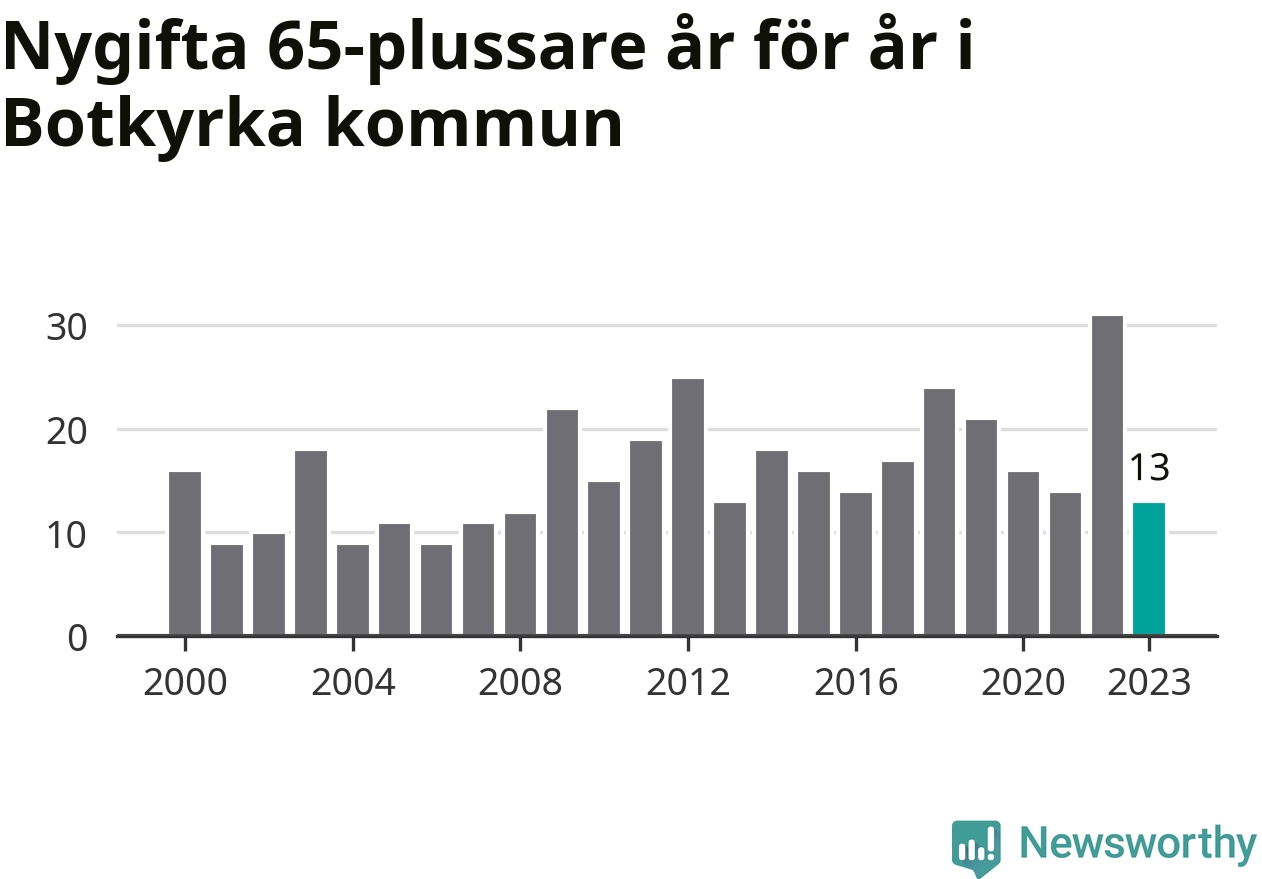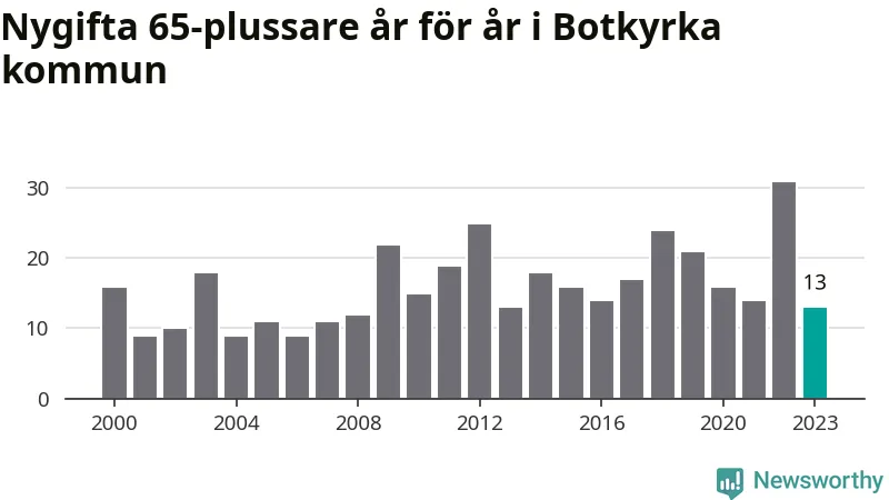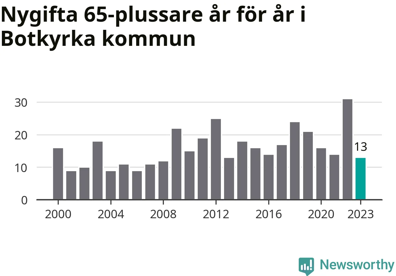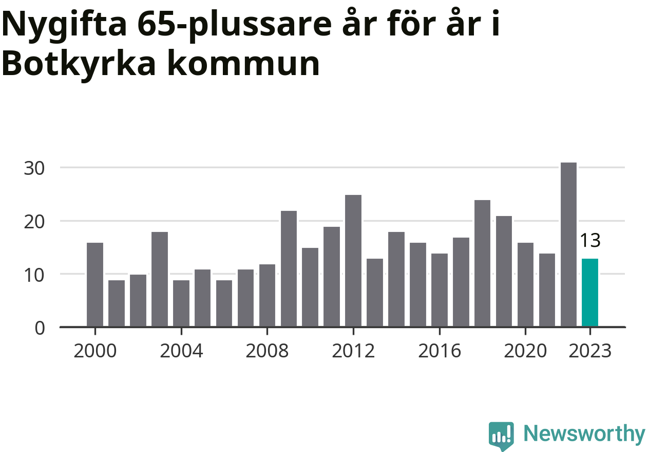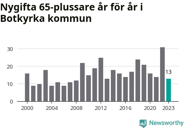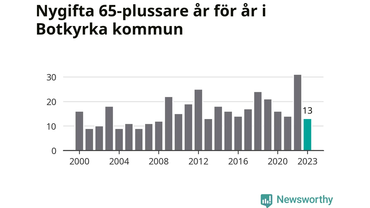 Vad gäller riket i stort ställde sig förra året totalt 80 747 svenskar framför en vigselförrättare och lovade sin partner trohet tills döden skilde dem åt. 2 986 av dem, eller 3,7 procent, hade vid det laget fyllt 65 år. Motsvarande procentandel var under 00-talet 1,3 procent.
