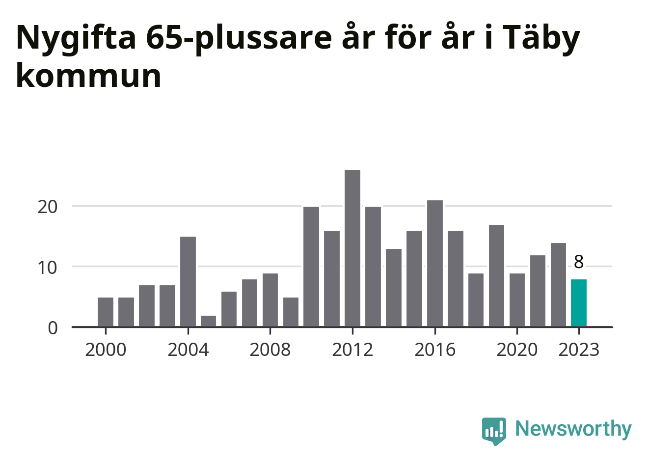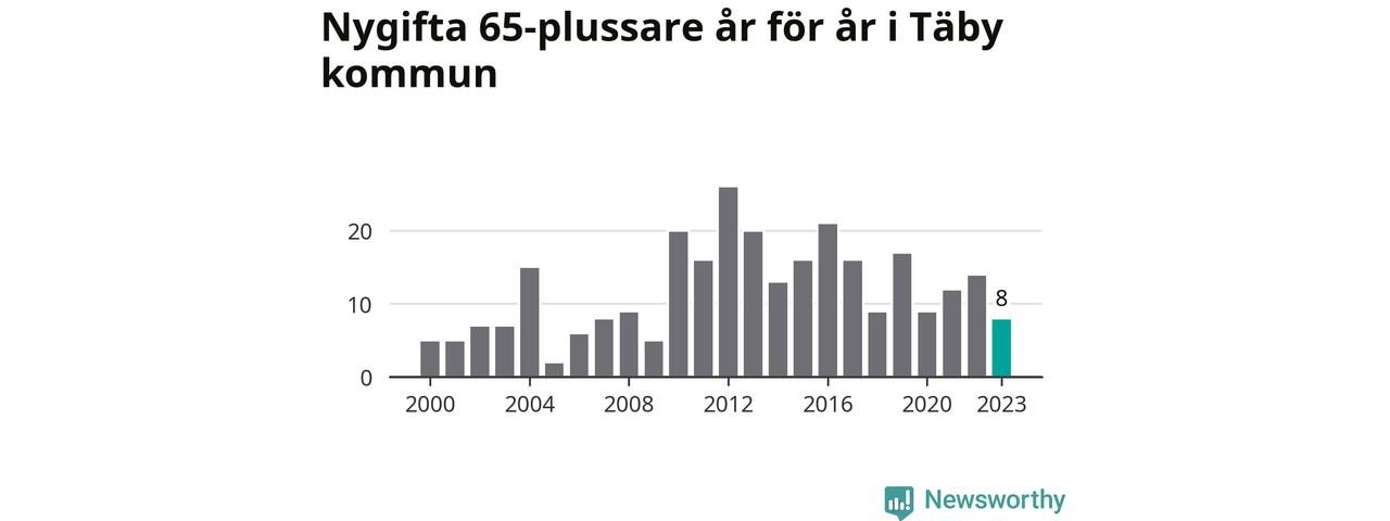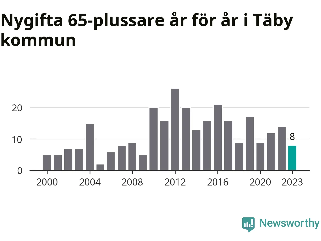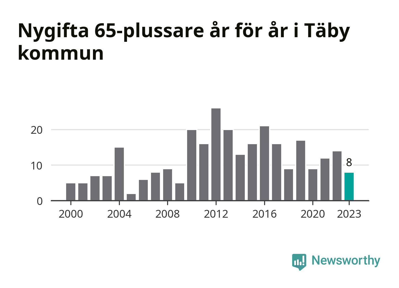 Vad gäller riket i stort ställde sig förra året totalt 80 747 svenskar framför en vigselförrättare och lovade sin partner trohet tills döden skilde dem åt. 2 986 av dem, eller 3,7 procent, hade vid det laget fyllt 65 år. Motsvarande procentandel var under 00-talet 1,3 procent.