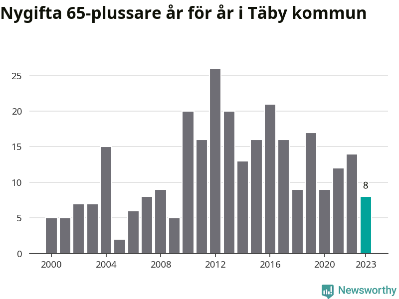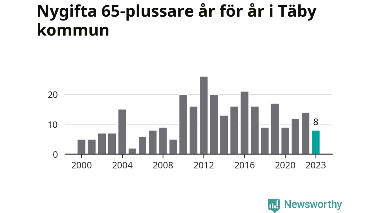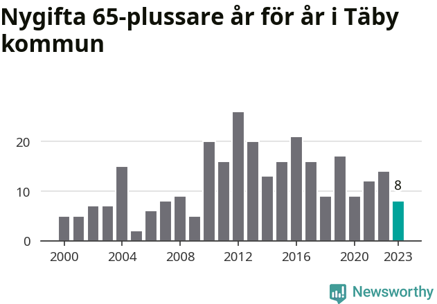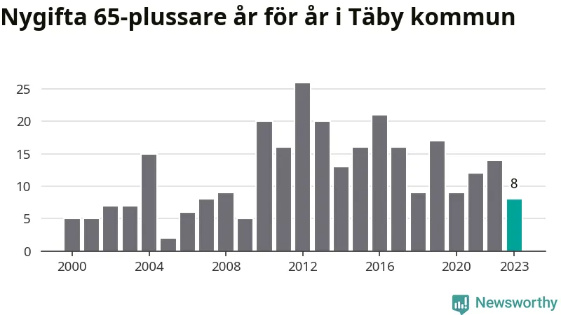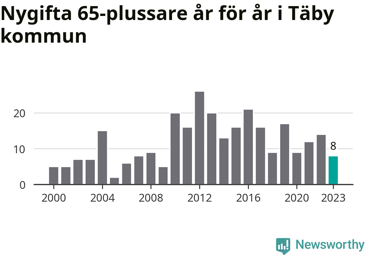 Vad gäller riket i stort ställde sig förra året totalt 80 747 svenskar framför en vigselförrättare och lovade sin partner trohet tills döden skilde dem åt. 2 986 av dem, eller 3,7 procent, hade vid det laget fyllt 65 år. Motsvarande procentandel var under 00-talet 1,3 procent.
