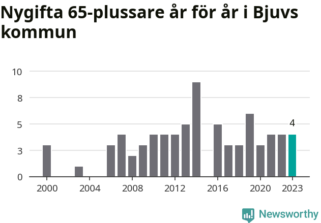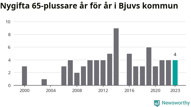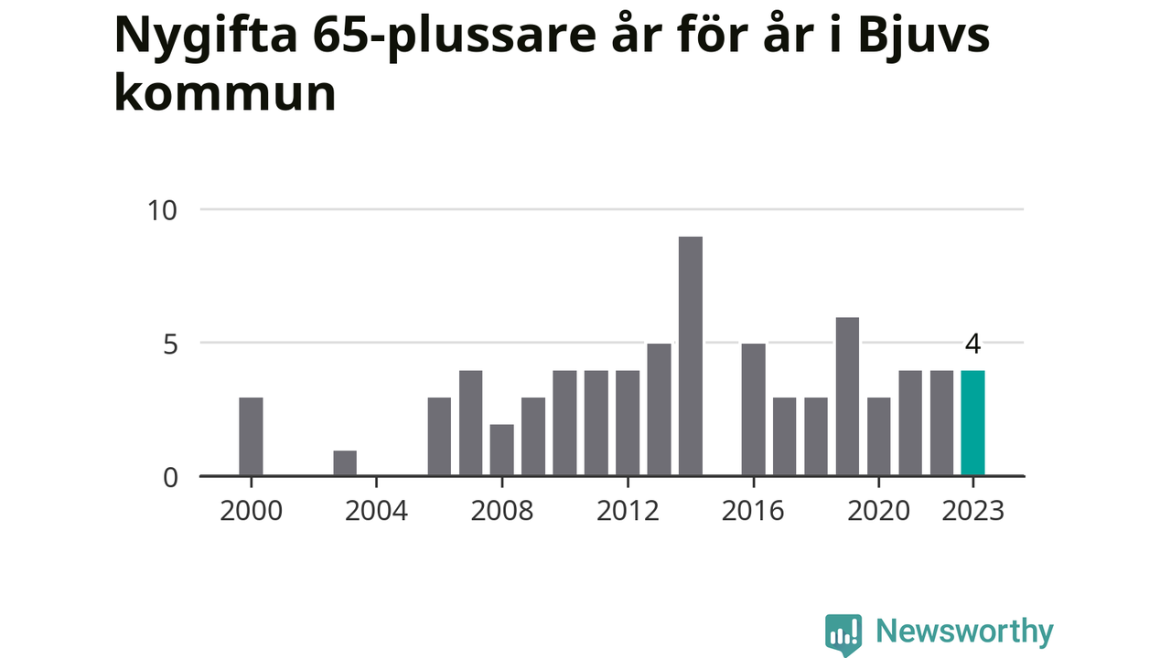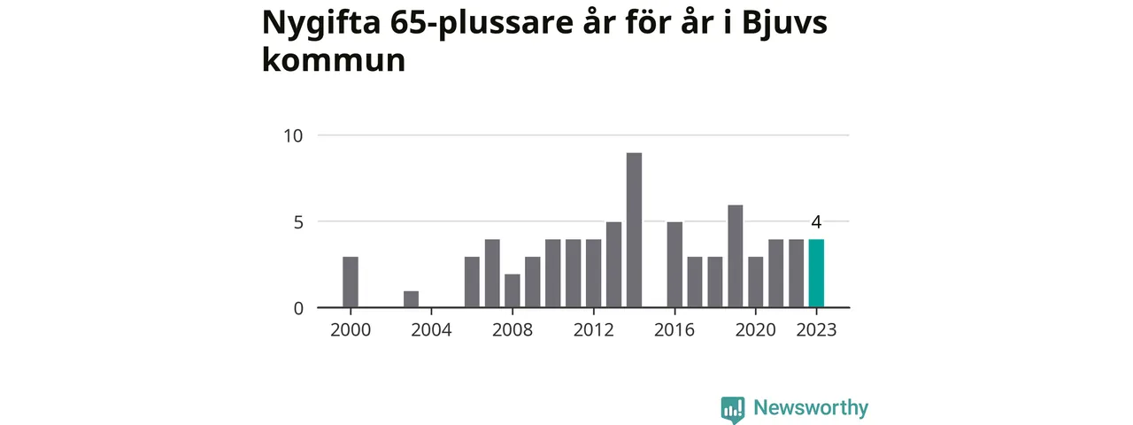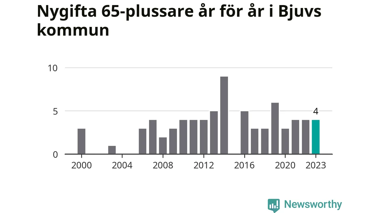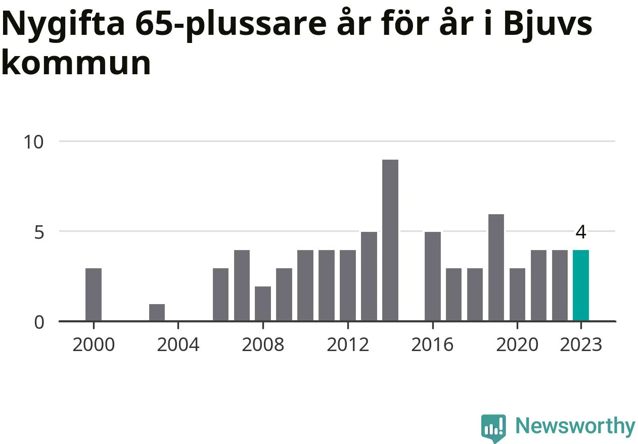 16 personer. Så många Bjuvsbor gifte sig efter 65-årsdagen under hela 00-talet. Under det senaste decenniet, mellan 2014 och 2023, har samma siffra ökat till 41. Nästan en tredubbling, med andra ord.