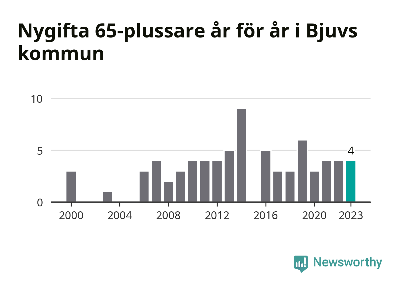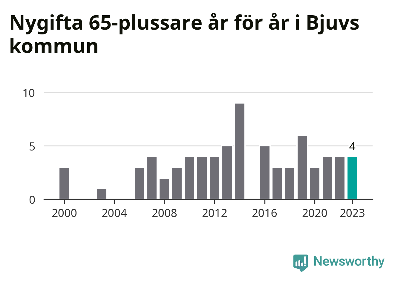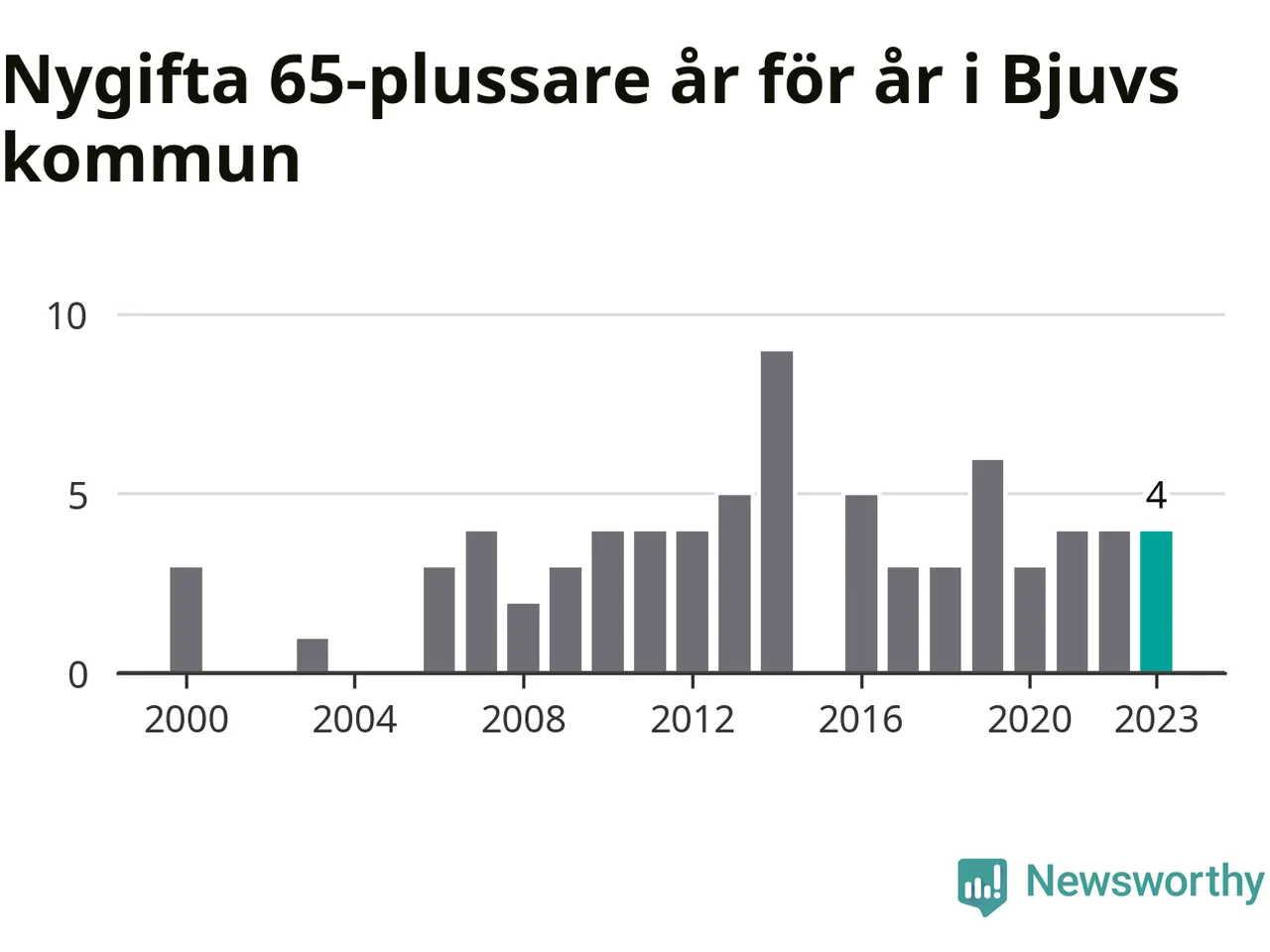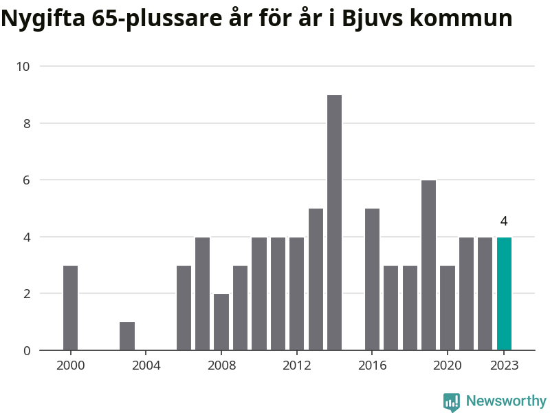 16 personer. Så många Bjuvsbor gifte sig efter 65-årsdagen under hela 00-talet. Under det senaste decenniet, mellan 2014 och 2023, har samma siffra ökat till 41. Nästan en tredubbling, med andra ord.