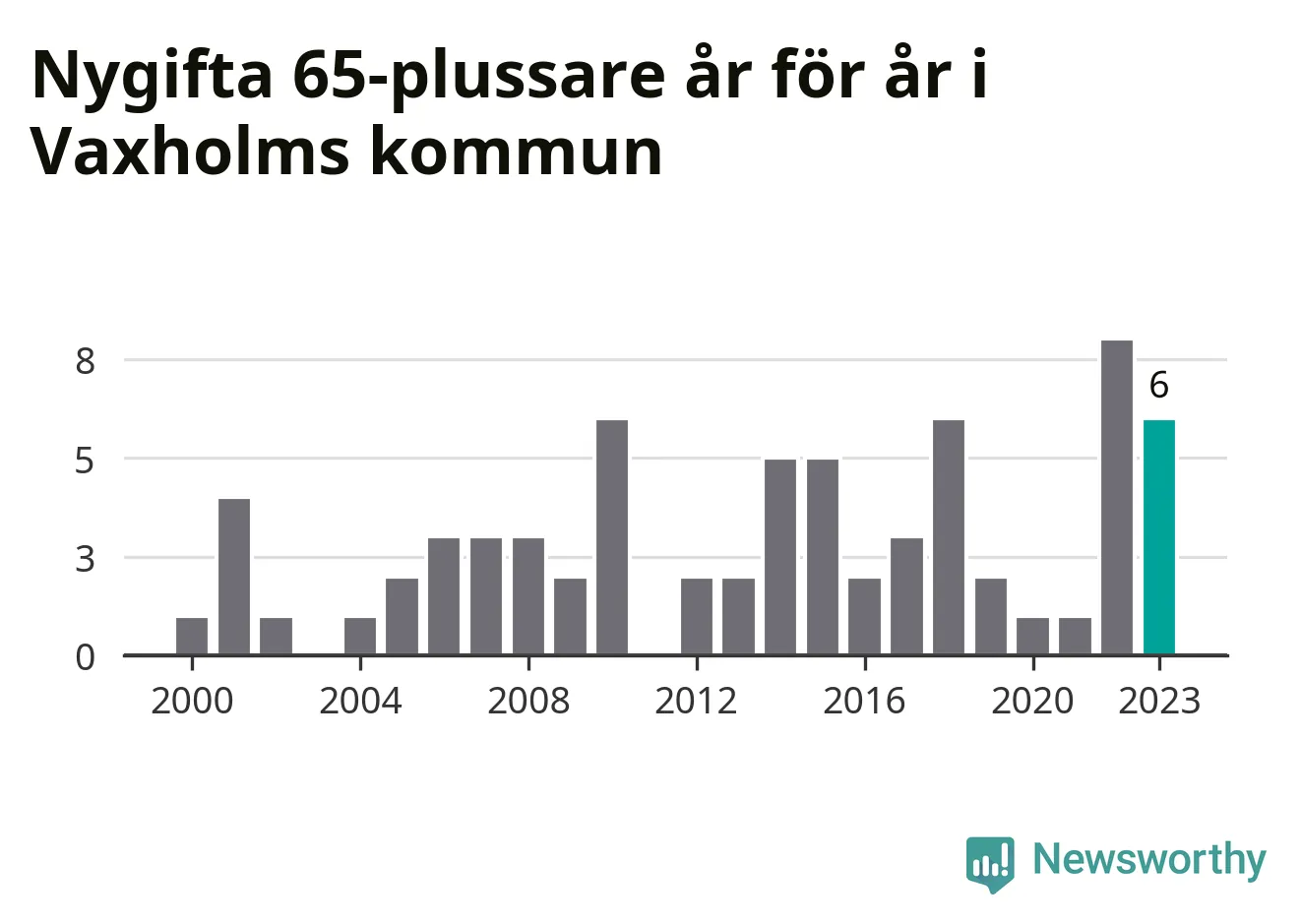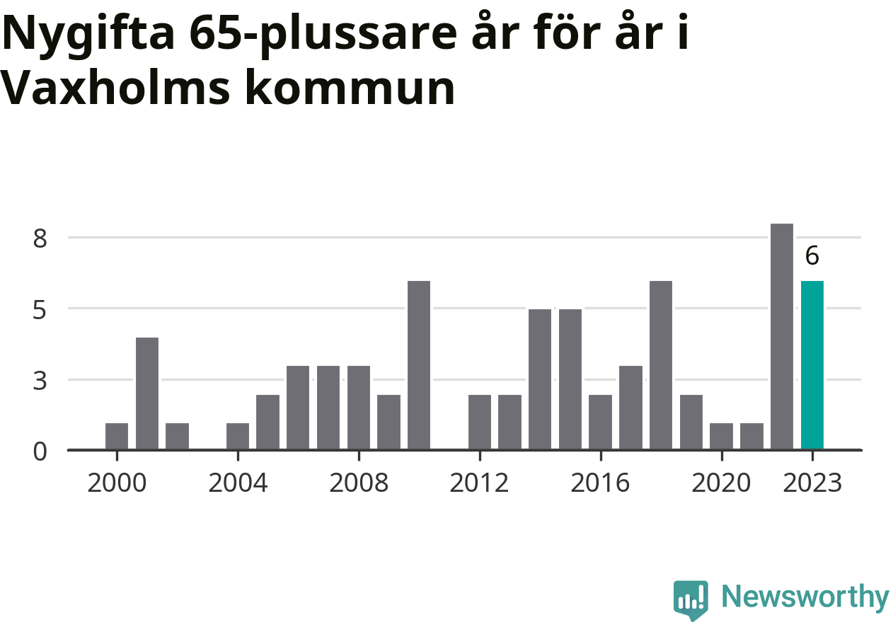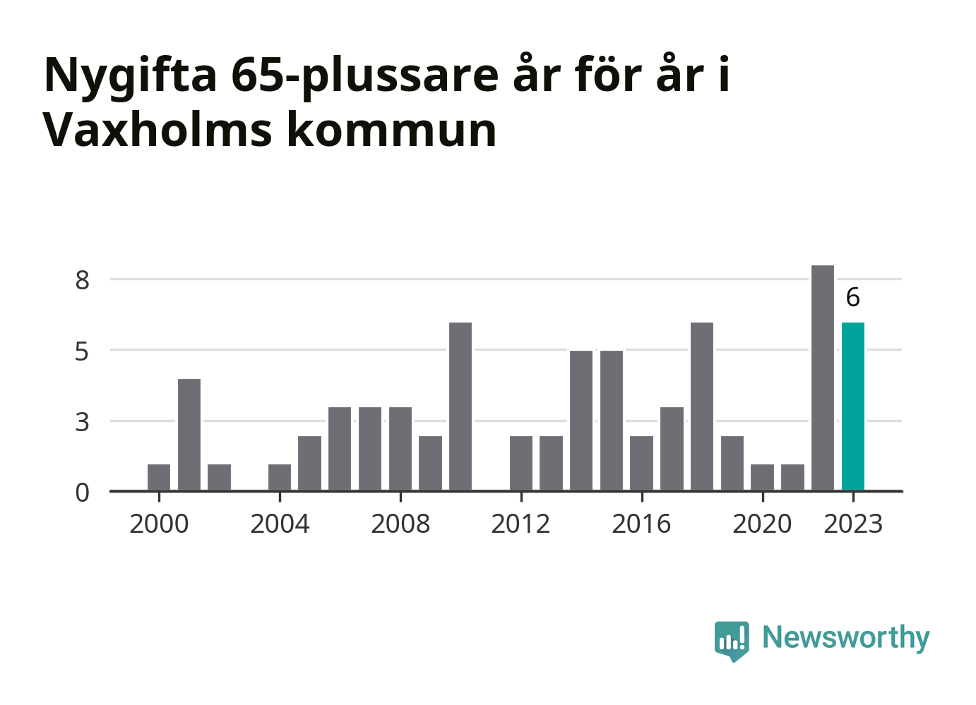 Bröllop bland 65-plussare har ökat markant i Sverige de senaste 25 åren. I Vaxholm har antalet nygifta seniorer ökat från 20 under 00-talet till 39 senaste decenniet.