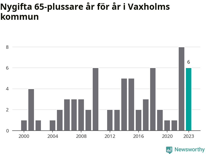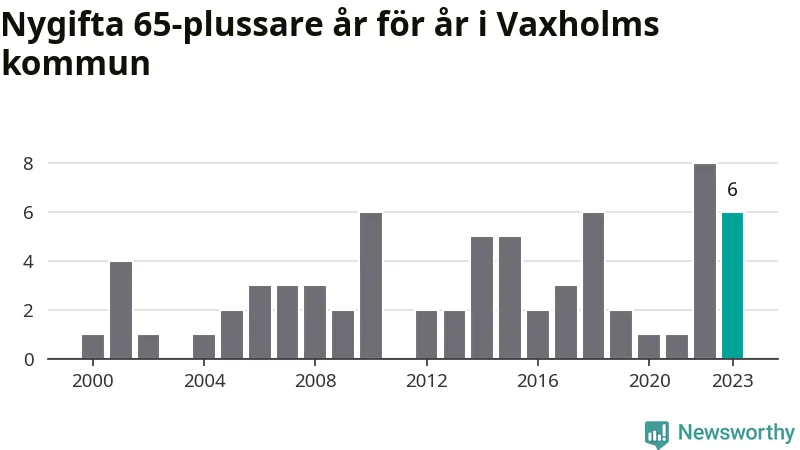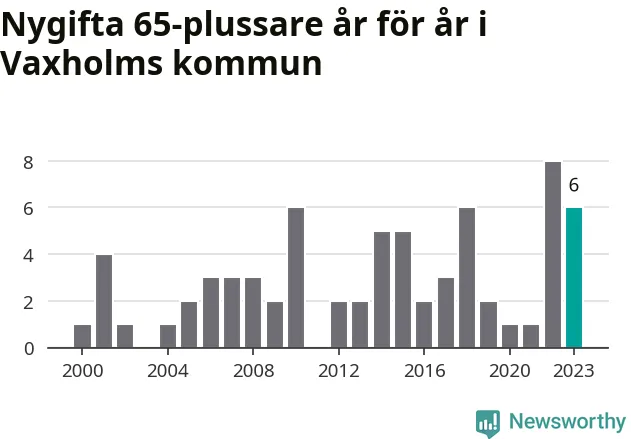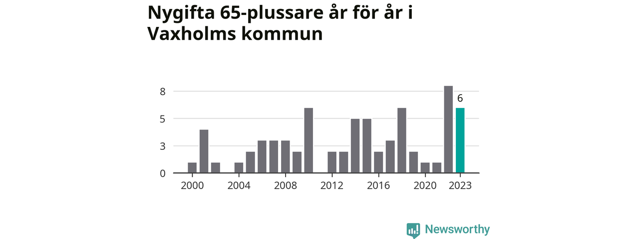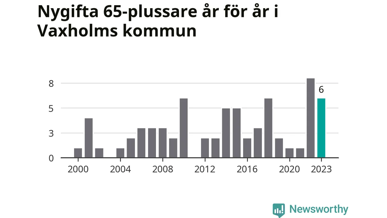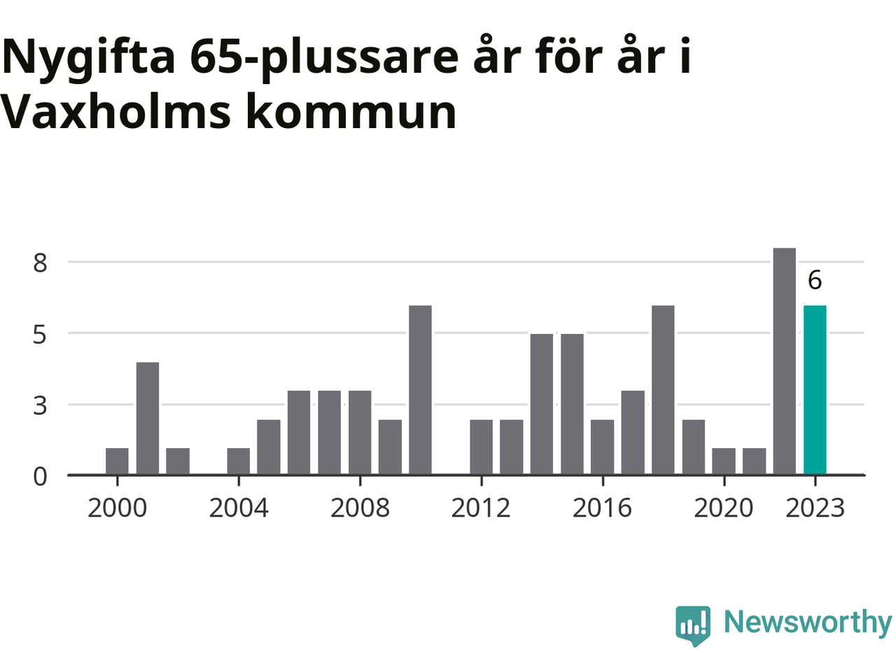 Bröllop bland 65-plussare har ökat markant i Sverige de senaste 25 åren. I Vaxholm har antalet nygifta seniorer ökat från 20 under 00-talet till 39 senaste decenniet.