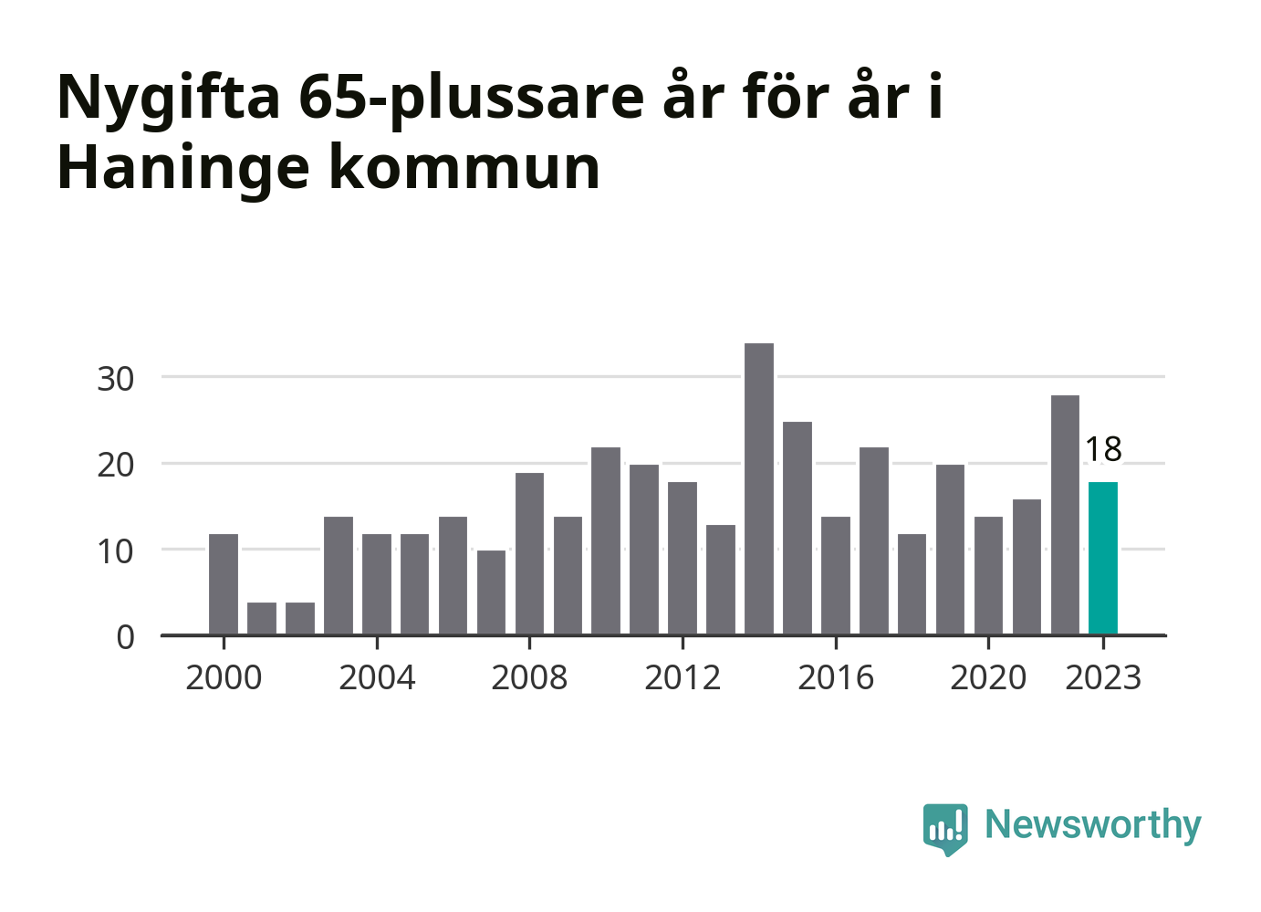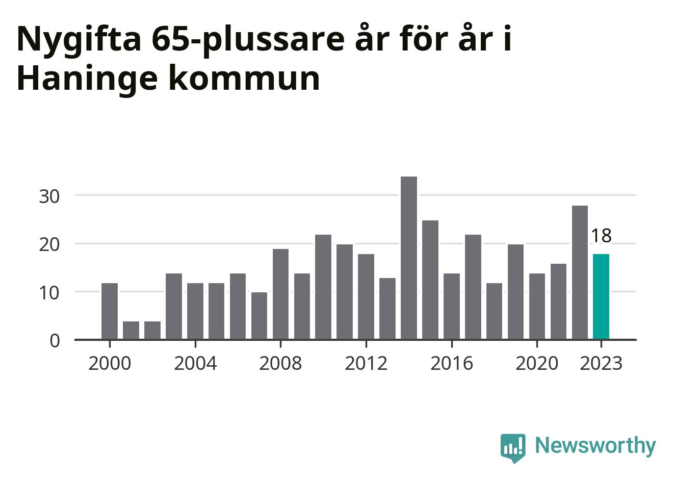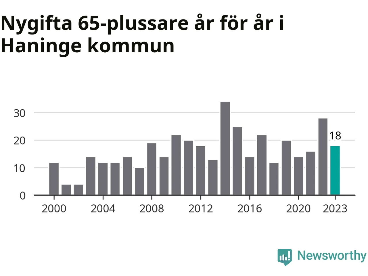 Bröllop bland 65-plussare har ökat markant i Sverige de senaste 25 åren. I Haninge har antalet nygifta seniorer ökat från 115 under 00-talet till 203 senaste decenniet.