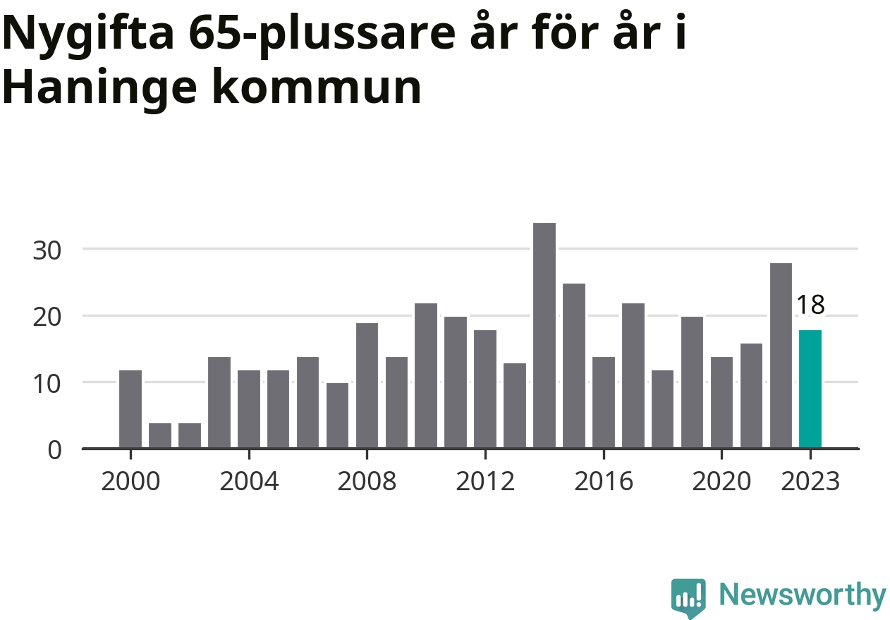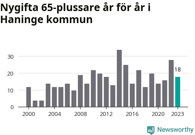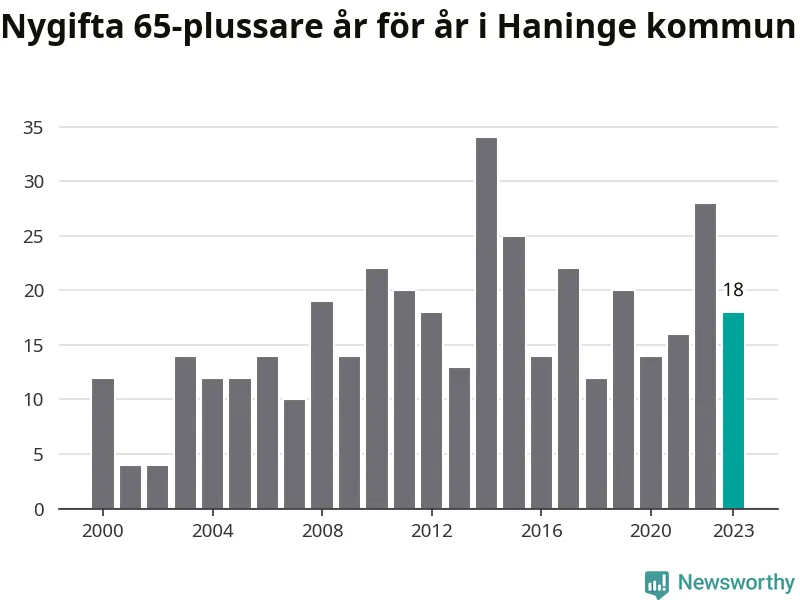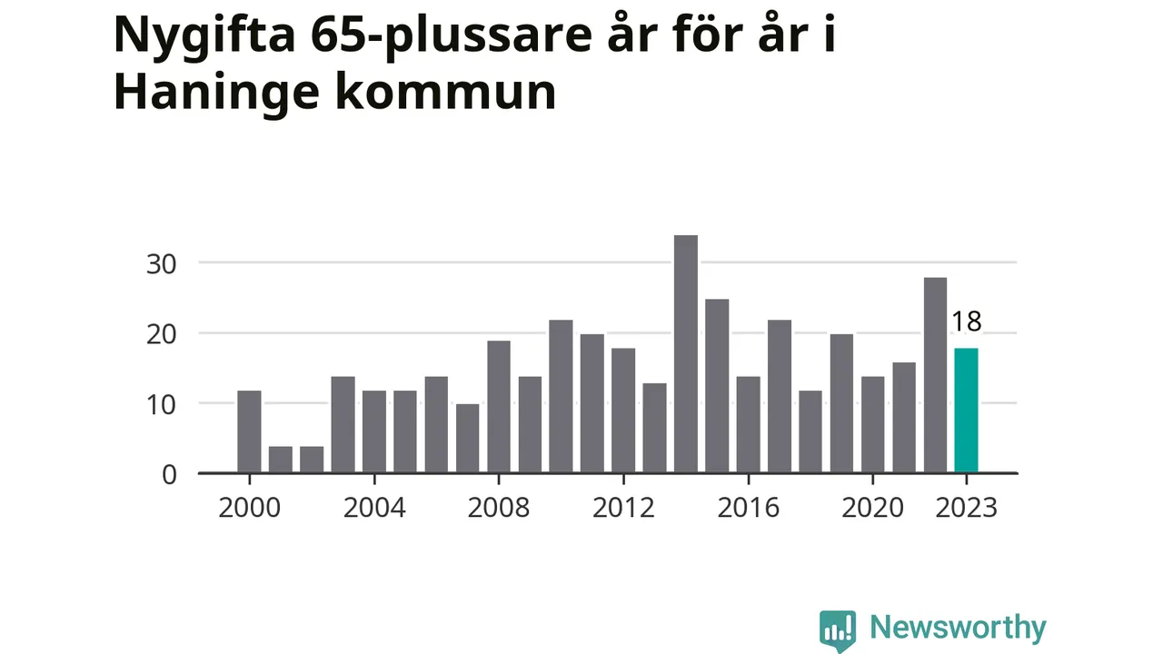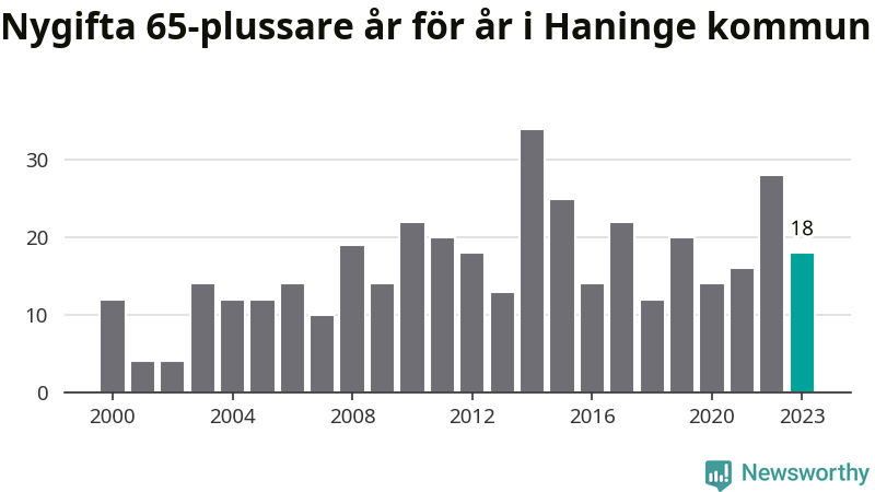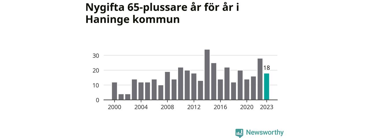 Bröllop bland 65-plussare har ökat markant i Sverige de senaste 25 åren. I Haninge har antalet nygifta seniorer ökat från 115 under 00-talet till 203 senaste decenniet.