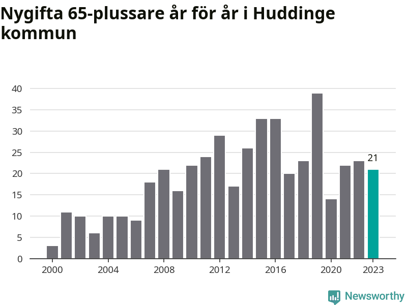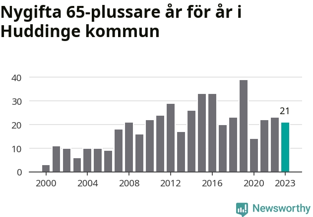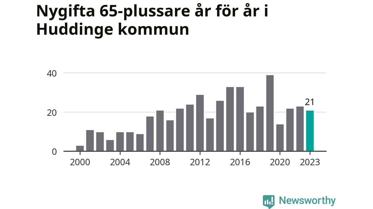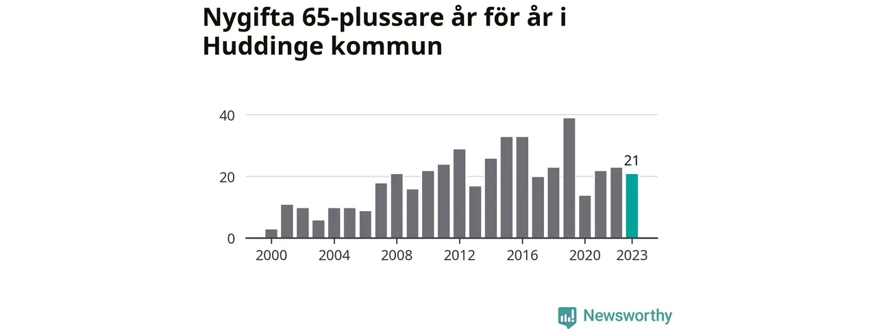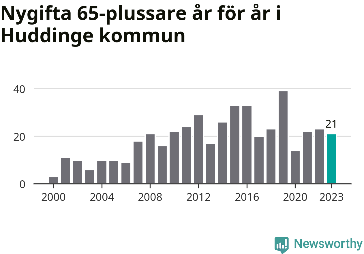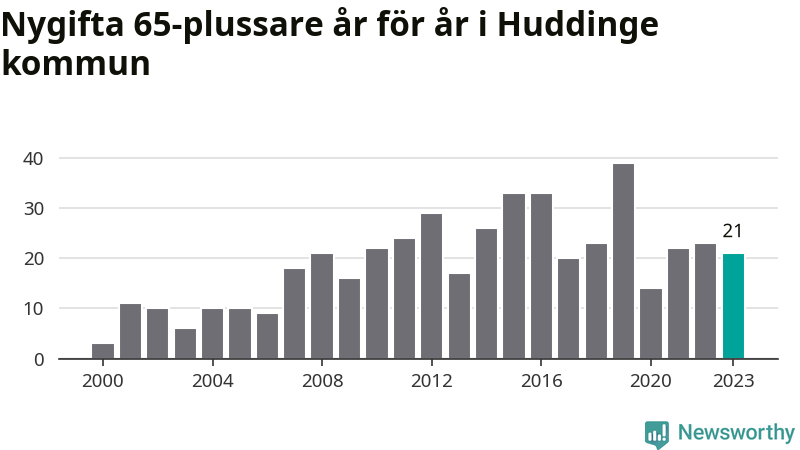 114 personer. Så många Huddingebor gifte sig efter 65-årsdagen under hela 00-talet. Under det senaste decenniet, mellan 2014 och 2023, har samma siffra ökat till 254. Lite mer än en fördubbling, med andra ord.