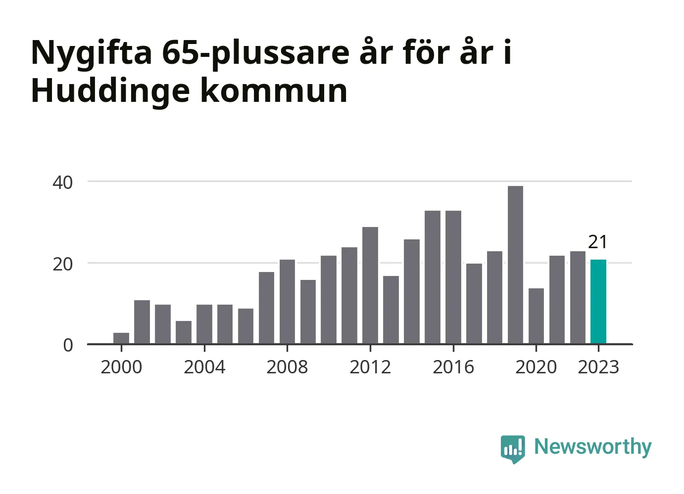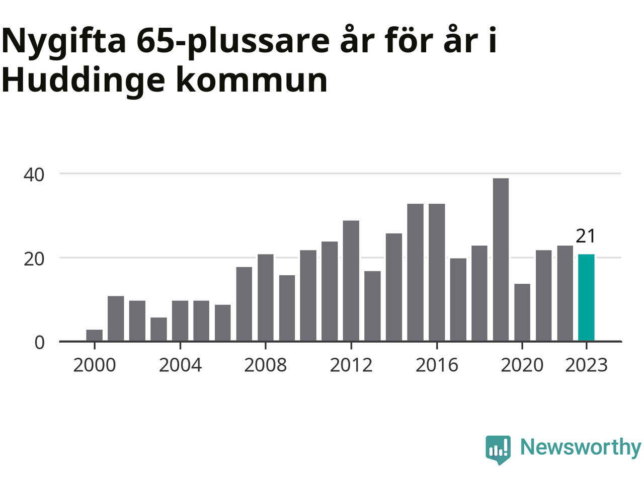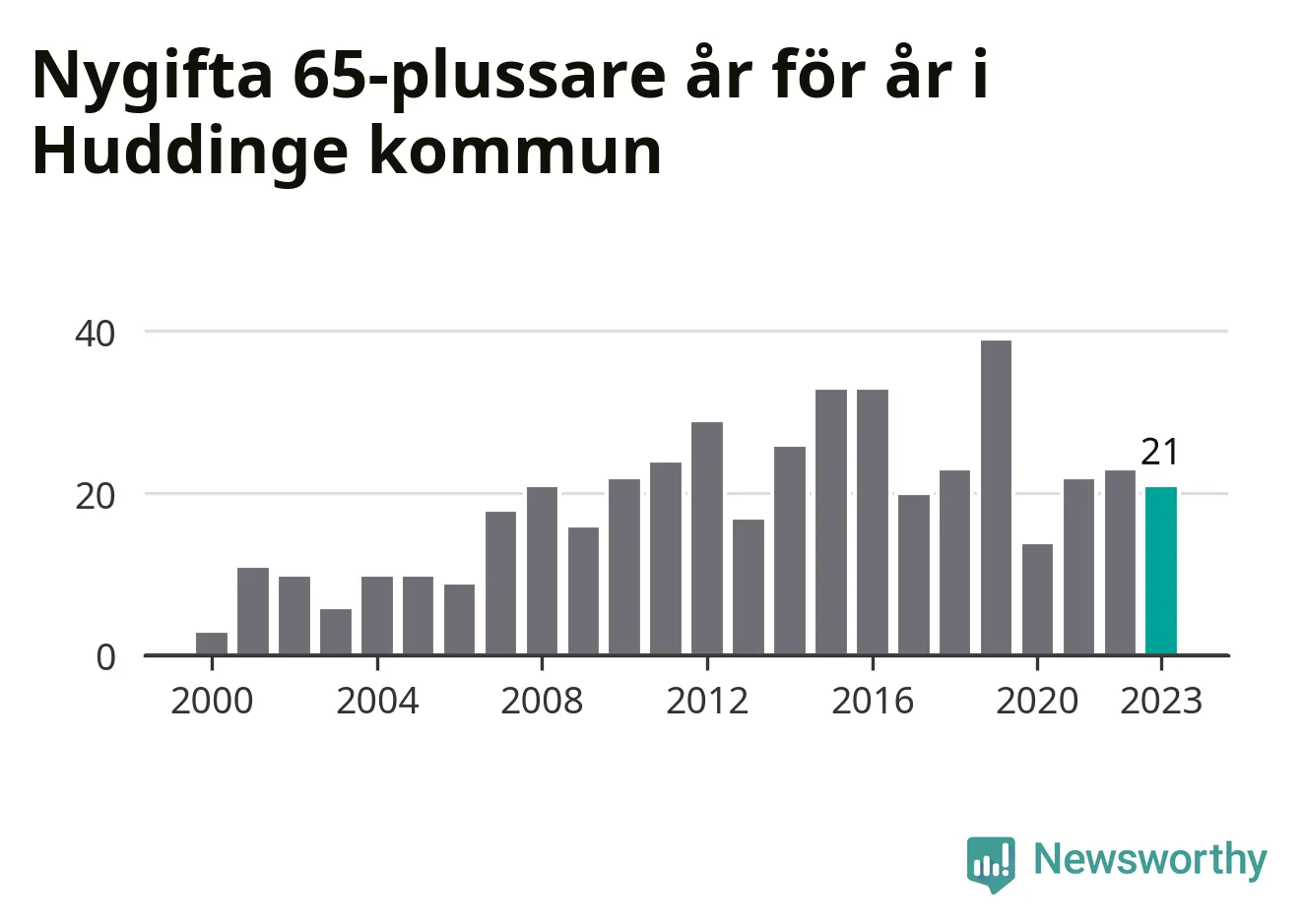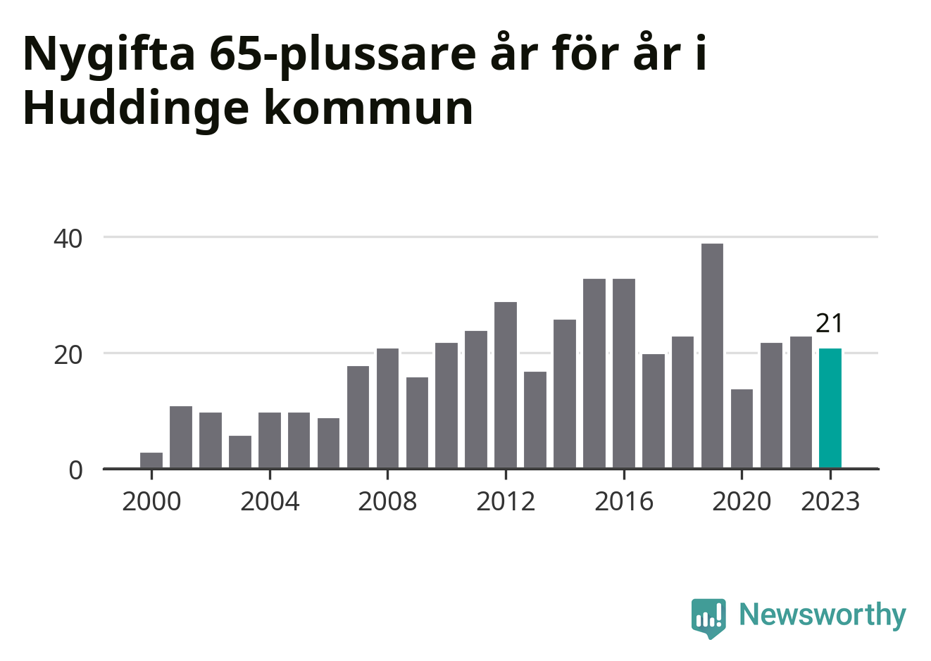114 personer. Så många Huddingebor gifte sig efter 65-årsdagen under hela 00-talet. Under det senaste decenniet, mellan 2014 och 2023, har samma siffra ökat till 254. Lite mer än en fördubbling, med andra ord.
