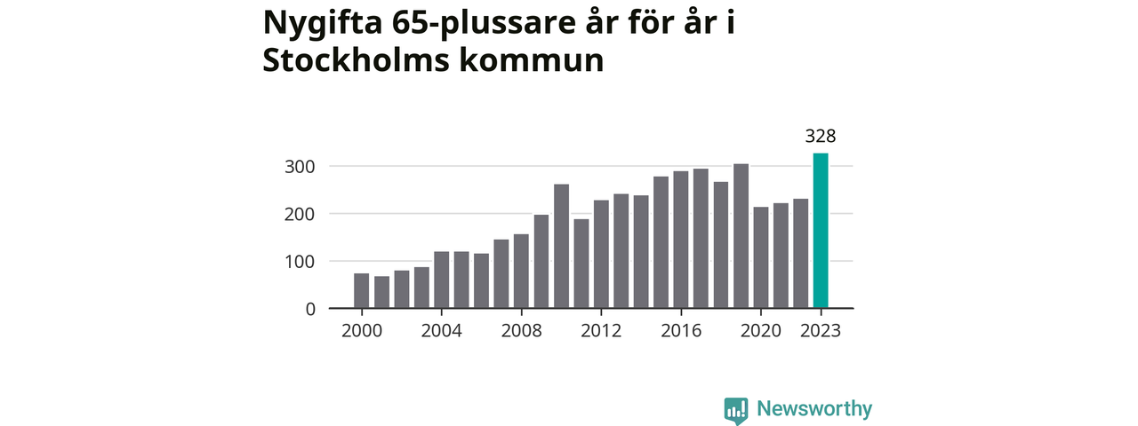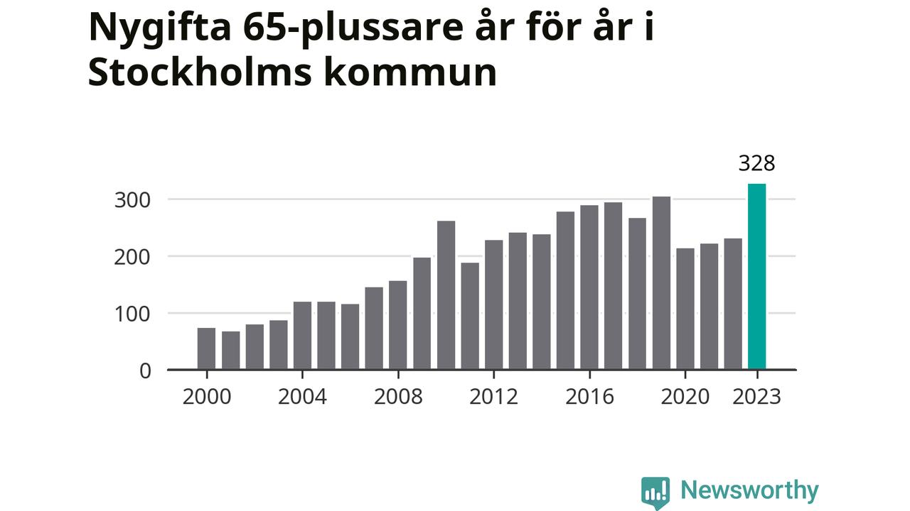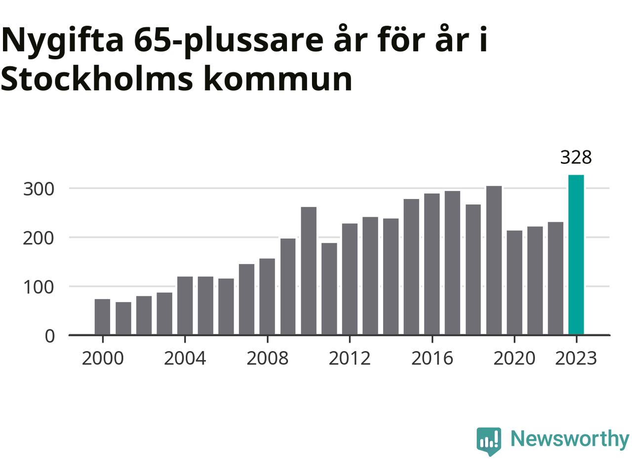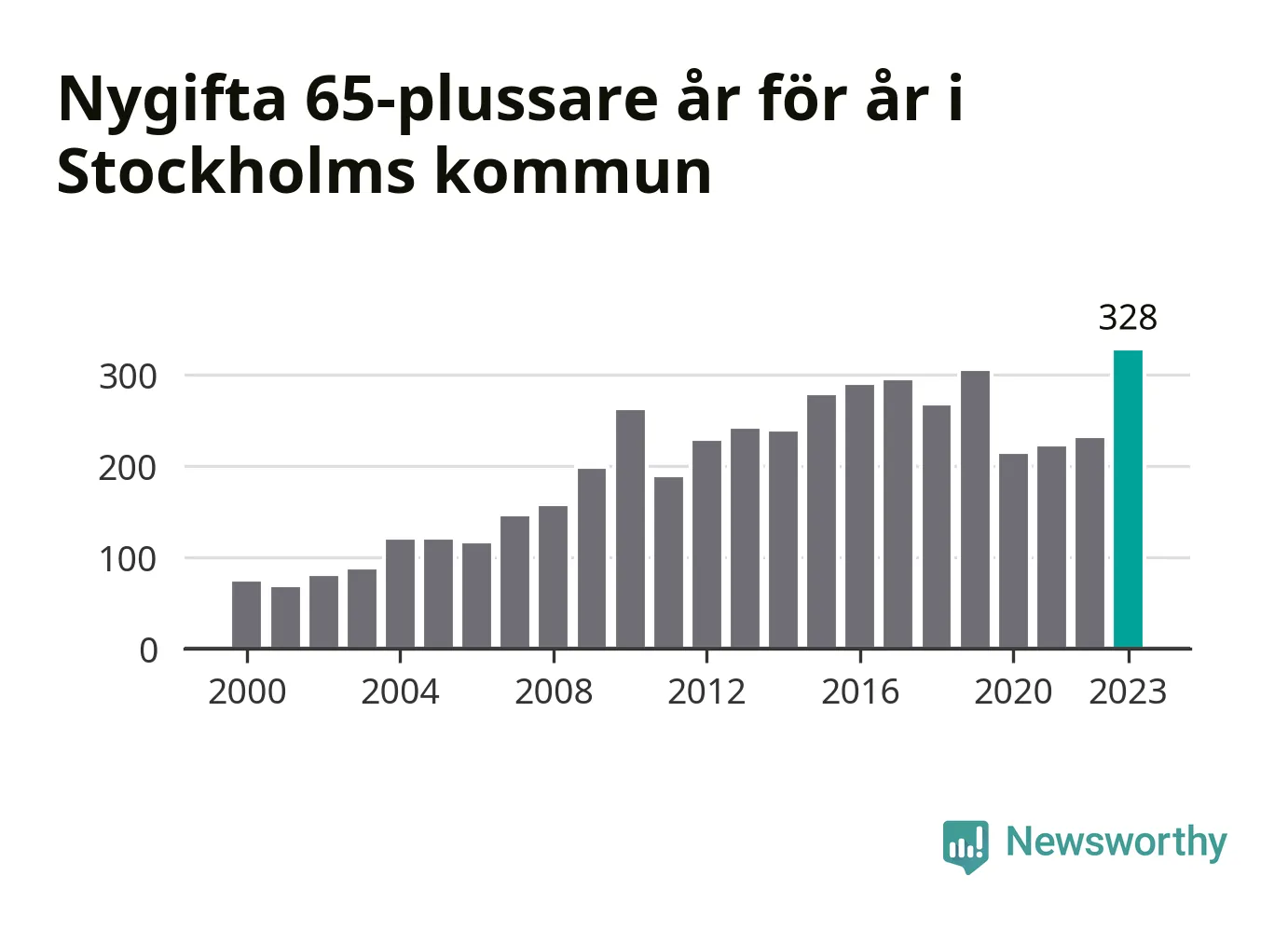 1 178 personer. Så många Stockholmsbor gifte sig efter 65-årsdagen under hela 00-talet. Under det senaste decenniet, mellan 2014 och 2023, har samma siffra ökat till 2 679. Lite mer än en fördubbling, med andra ord. I fjol gifte sig 328 personer över 65 år i Stockholms kommun, vilket är fler än något enskilt år sedan år 2000.