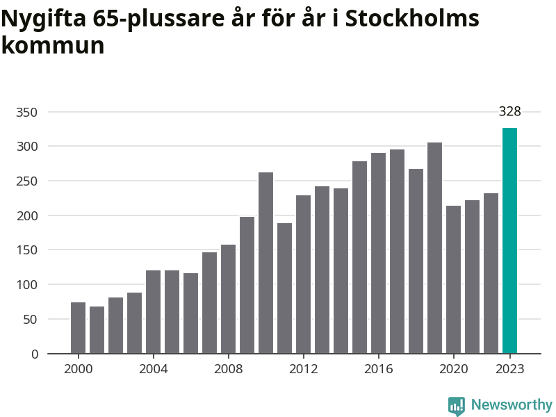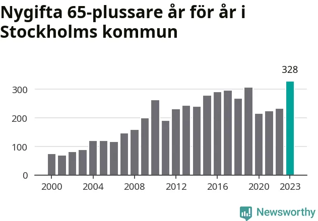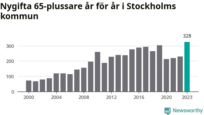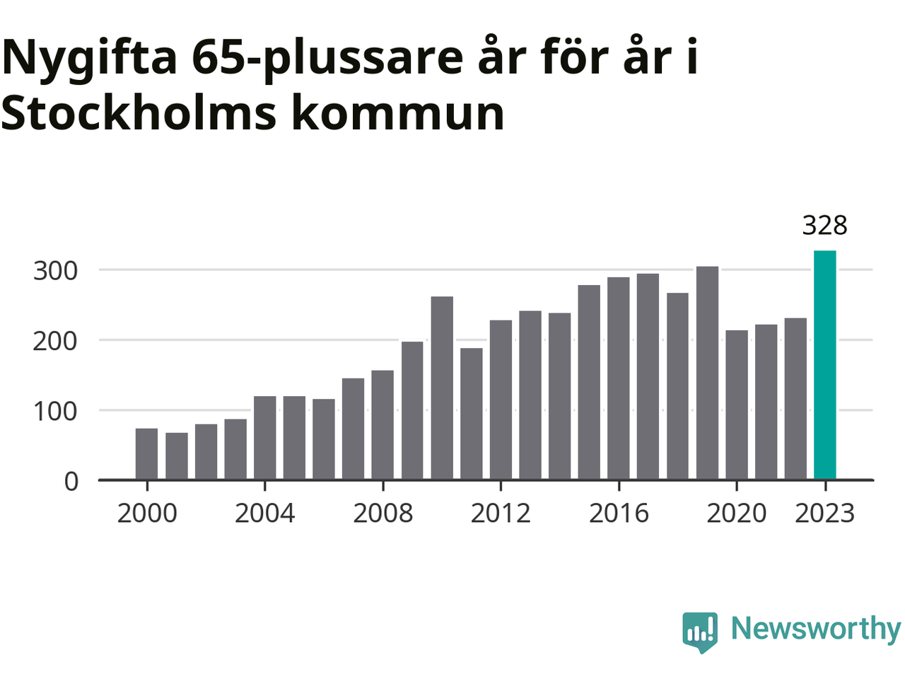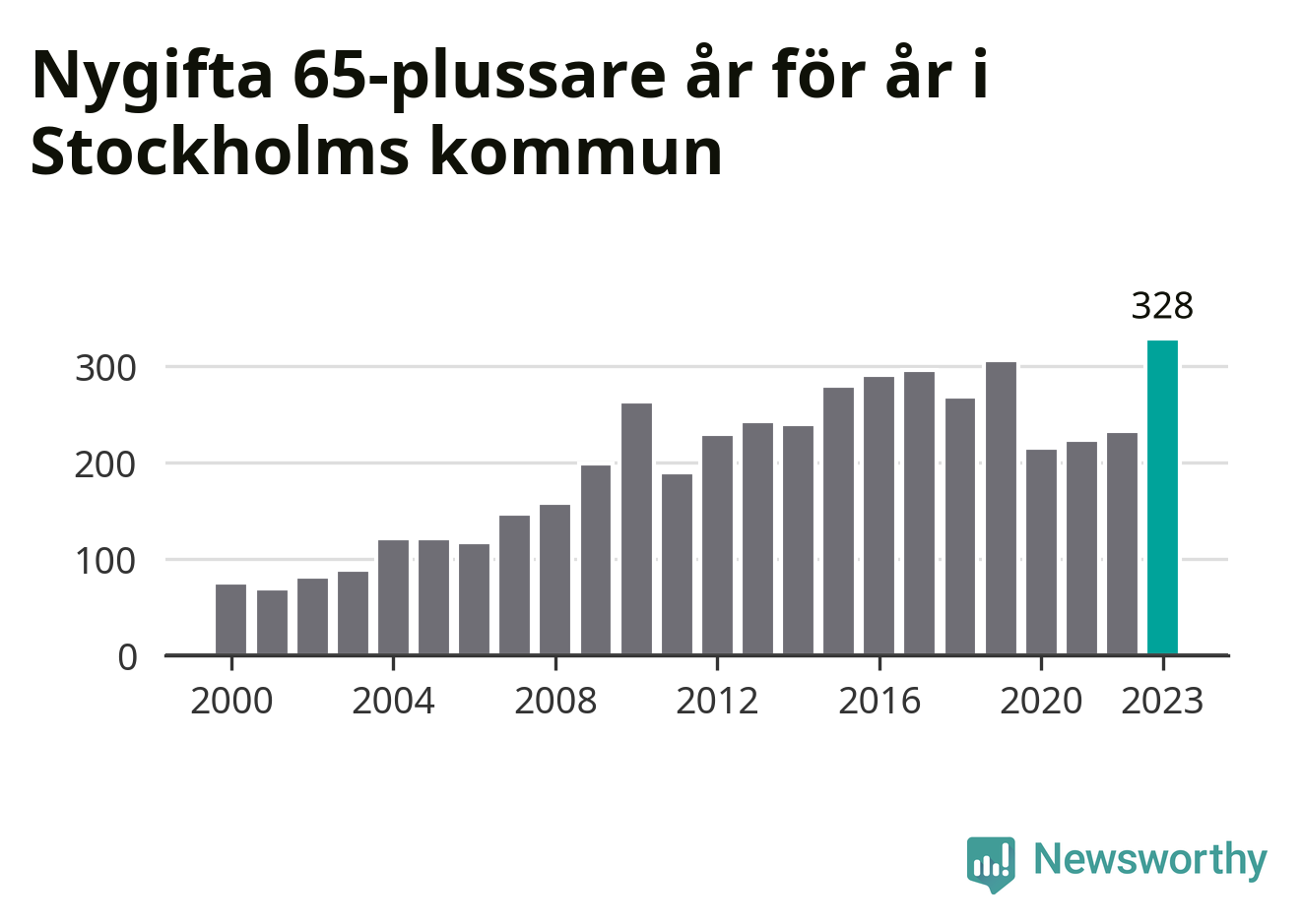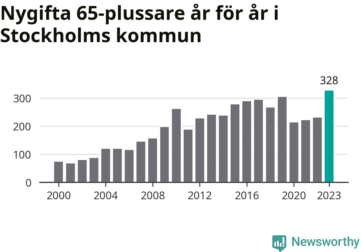 1 178 personer. Så många Stockholmsbor gifte sig efter 65-årsdagen under hela 00-talet. Under det senaste decenniet, mellan 2014 och 2023, har samma siffra ökat till 2 679. Lite mer än en fördubbling, med andra ord. I fjol gifte sig 328 personer över 65 år i Stockholms kommun, vilket är fler än något enskilt år sedan år 2000.