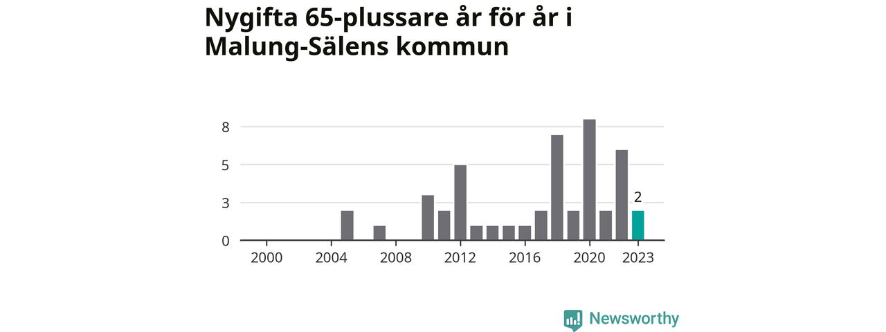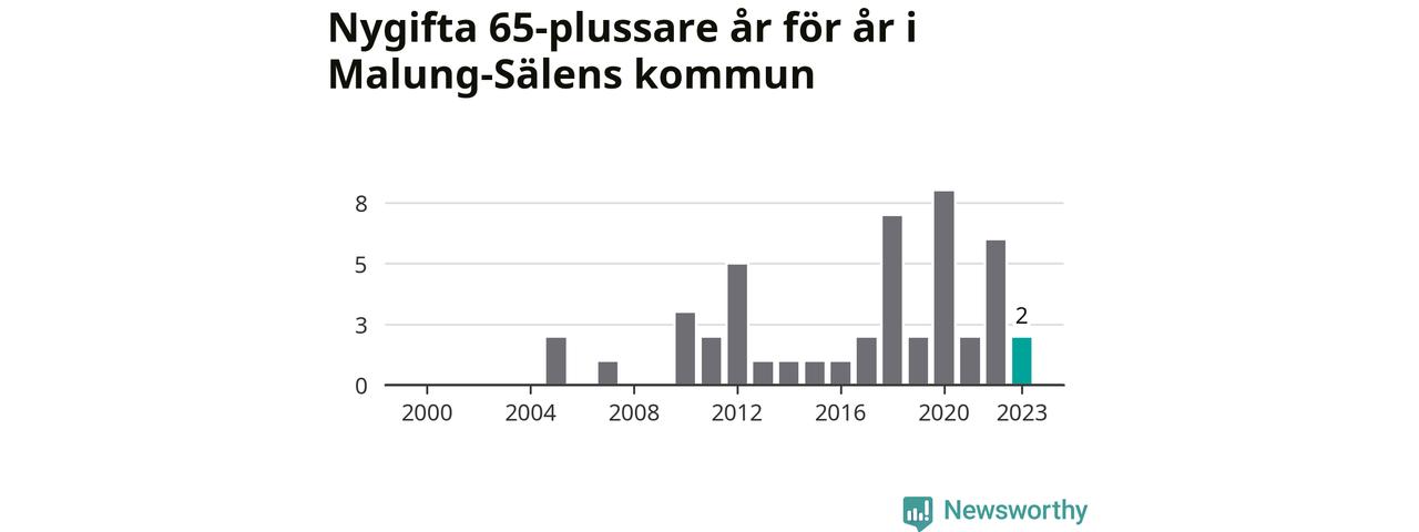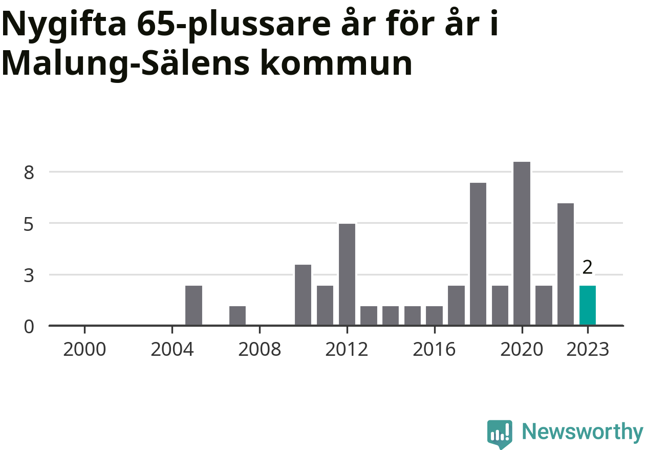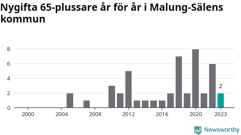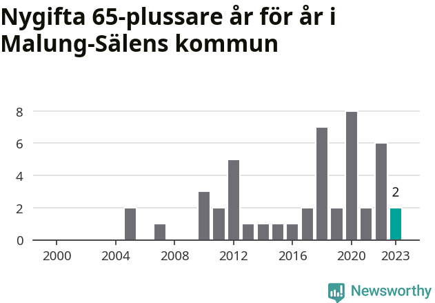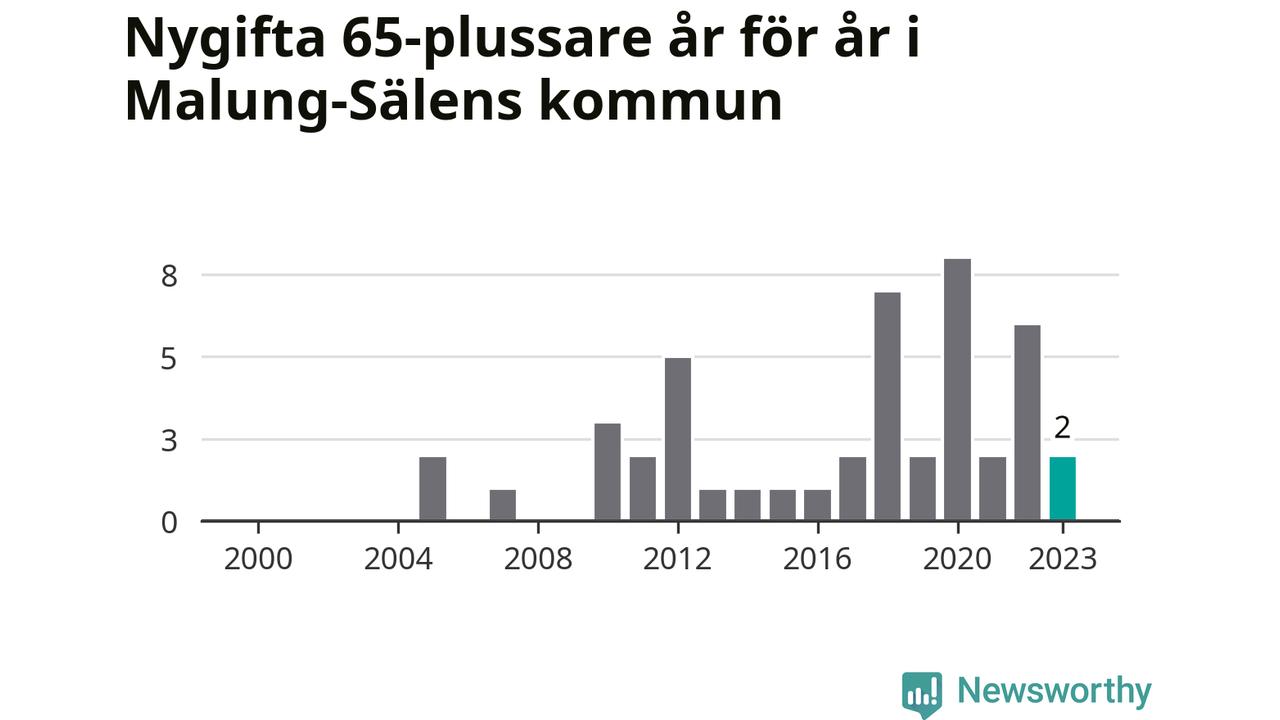 Störst andel seniora brudgummar och brudar i länet, baserat på antal invånare, hade Vansbro kommun där seniorerna stod för ungefär en tiondel av alla äktenskap som ingicks i kommunen.Vad gäller riket i stort ställde sig förra året totalt 80 747 svenskar framför en vigselförrättare och lovade sin partner trohet tills döden skilde dem åt. 2 986 av dem, eller 3,7 procent, hade vid det laget fyllt 65 år. Motsvarande procentandel var under 00-talet 1,3 procent.