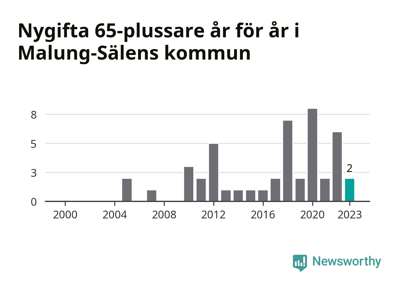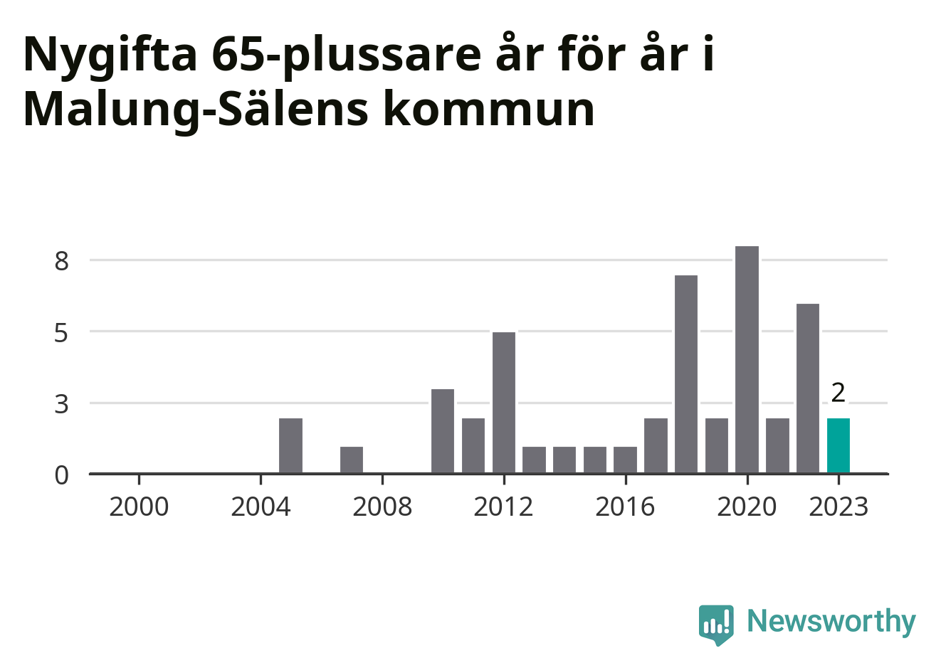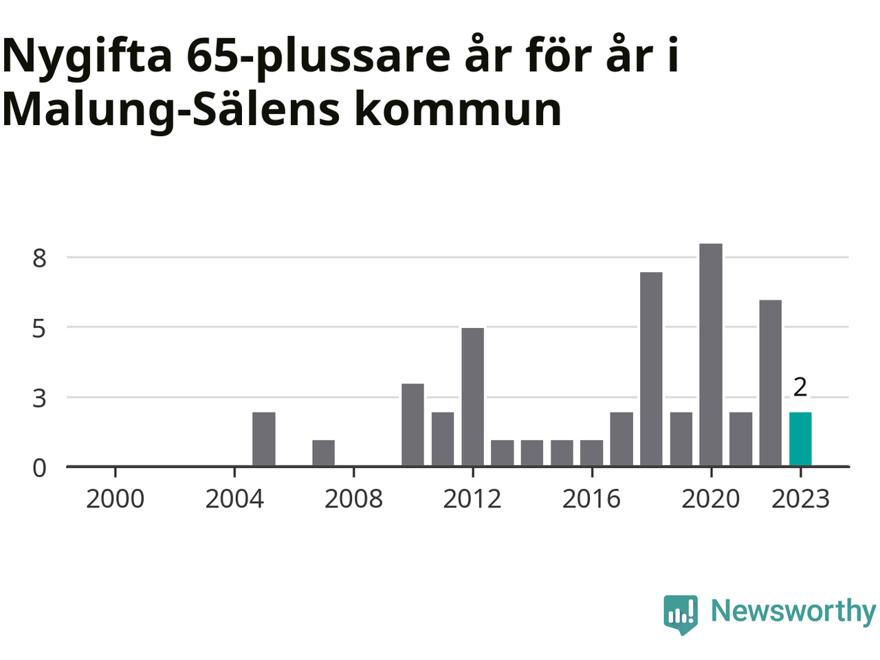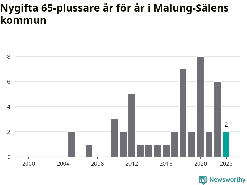 Störst andel seniora brudgummar och brudar i länet, baserat på antal invånare, hade Vansbro kommun där seniorerna stod för ungefär en tiondel av alla äktenskap som ingicks i kommunen.Vad gäller riket i stort ställde sig förra året totalt 80 747 svenskar framför en vigselförrättare och lovade sin partner trohet tills döden skilde dem åt. 2 986 av dem, eller 3,7 procent, hade vid det laget fyllt 65 år. Motsvarande procentandel var under 00-talet 1,3 procent.
