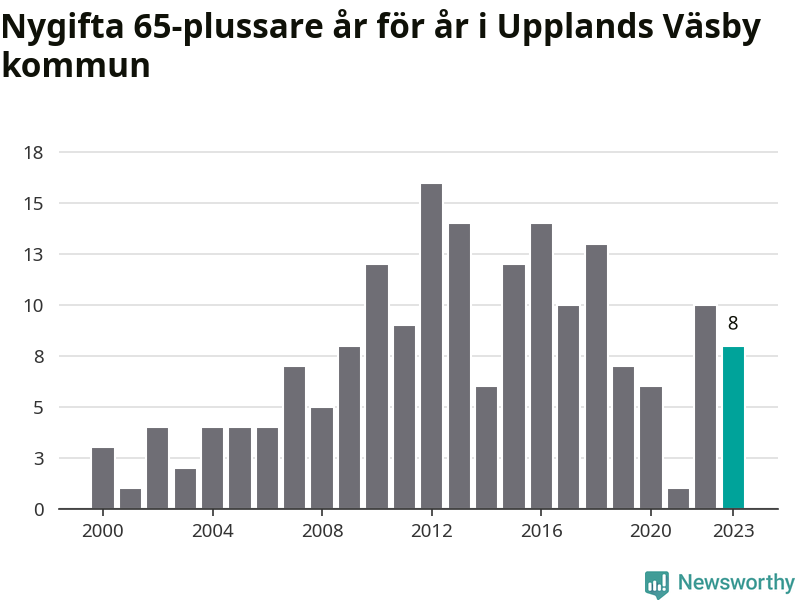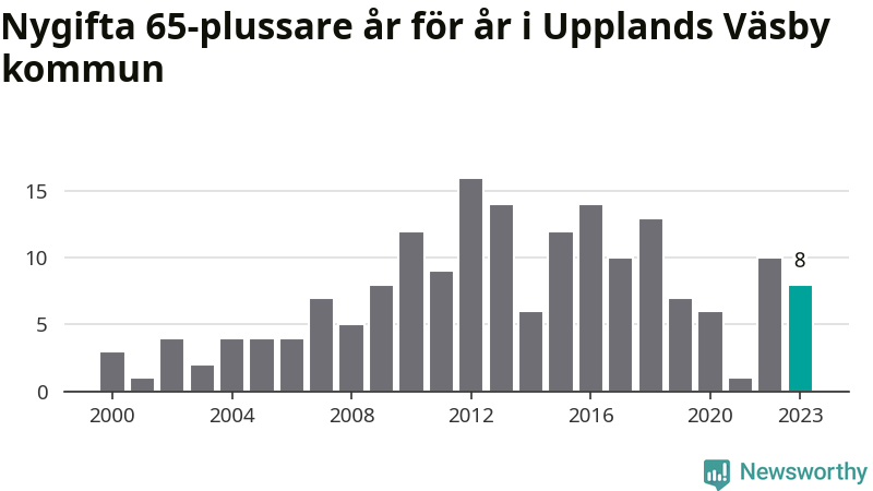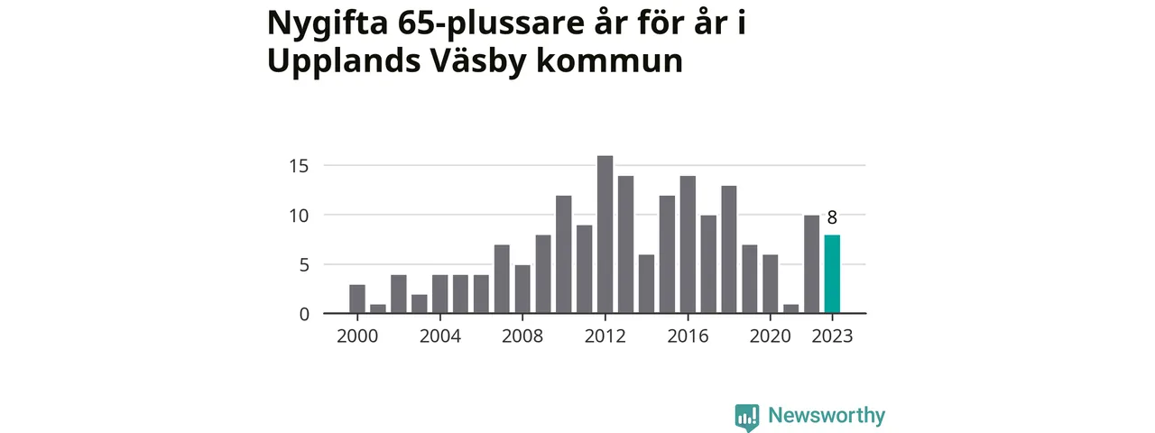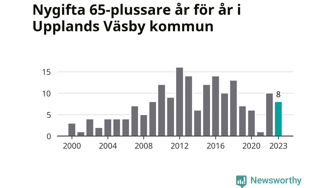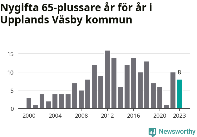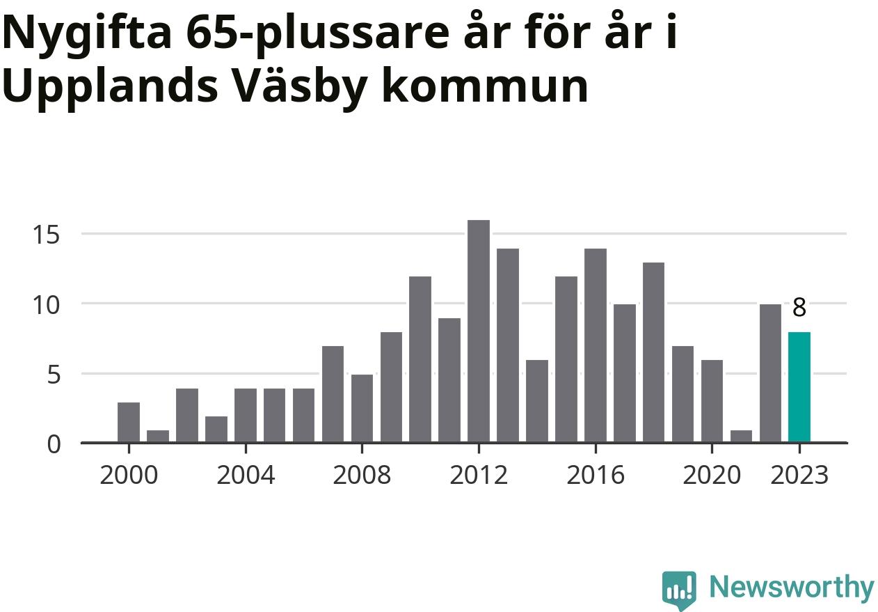 42 personer. Så många Väsbybor gifte sig efter 65-årsdagen under hela 00-talet. Under det senaste decenniet, mellan 2014 och 2023, har samma siffra ökat till 87. Lite mer än en fördubbling, med andra ord.